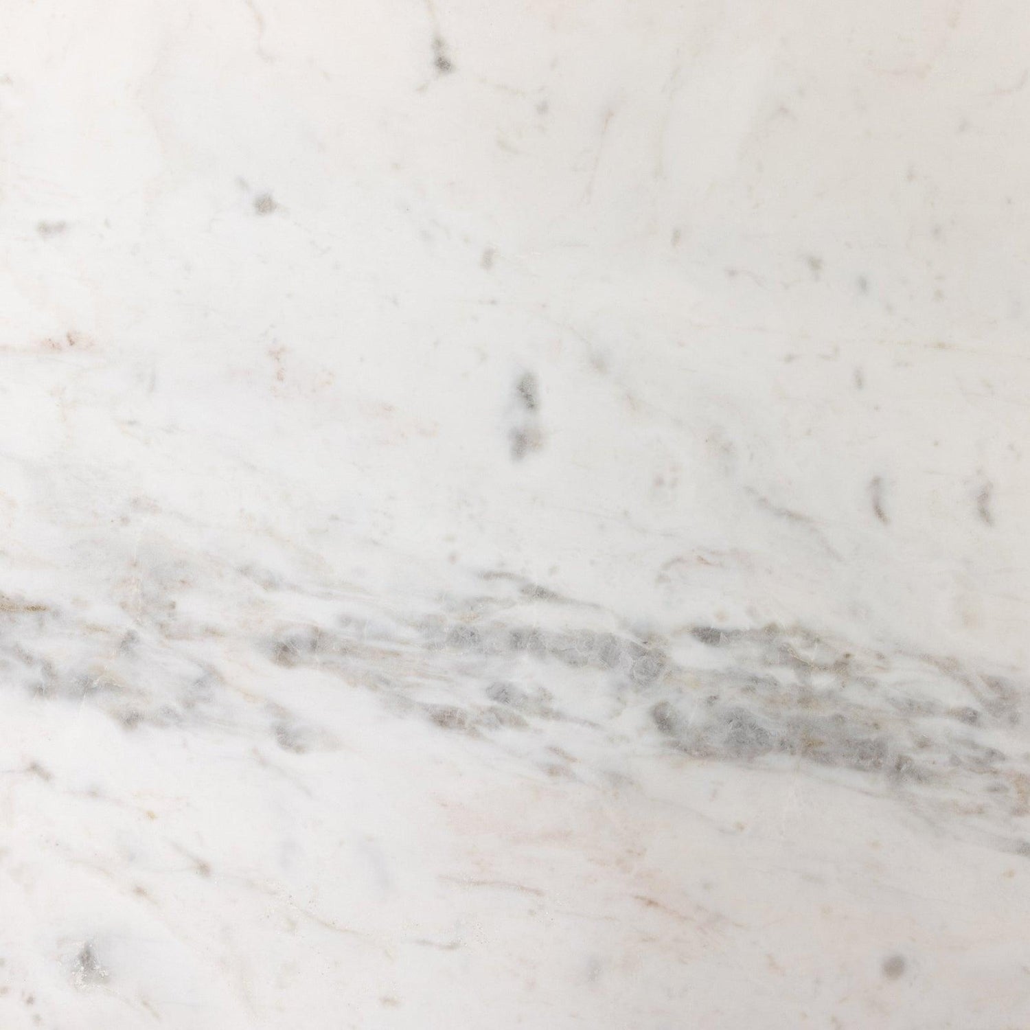 - El mango con acabado castaño rojizo forma un marco abierto y estructurado para una mesa rectangular de mármol blanco macizo, que le da un toque de mediados de siglo al estilo tradicional de una casa de campo.