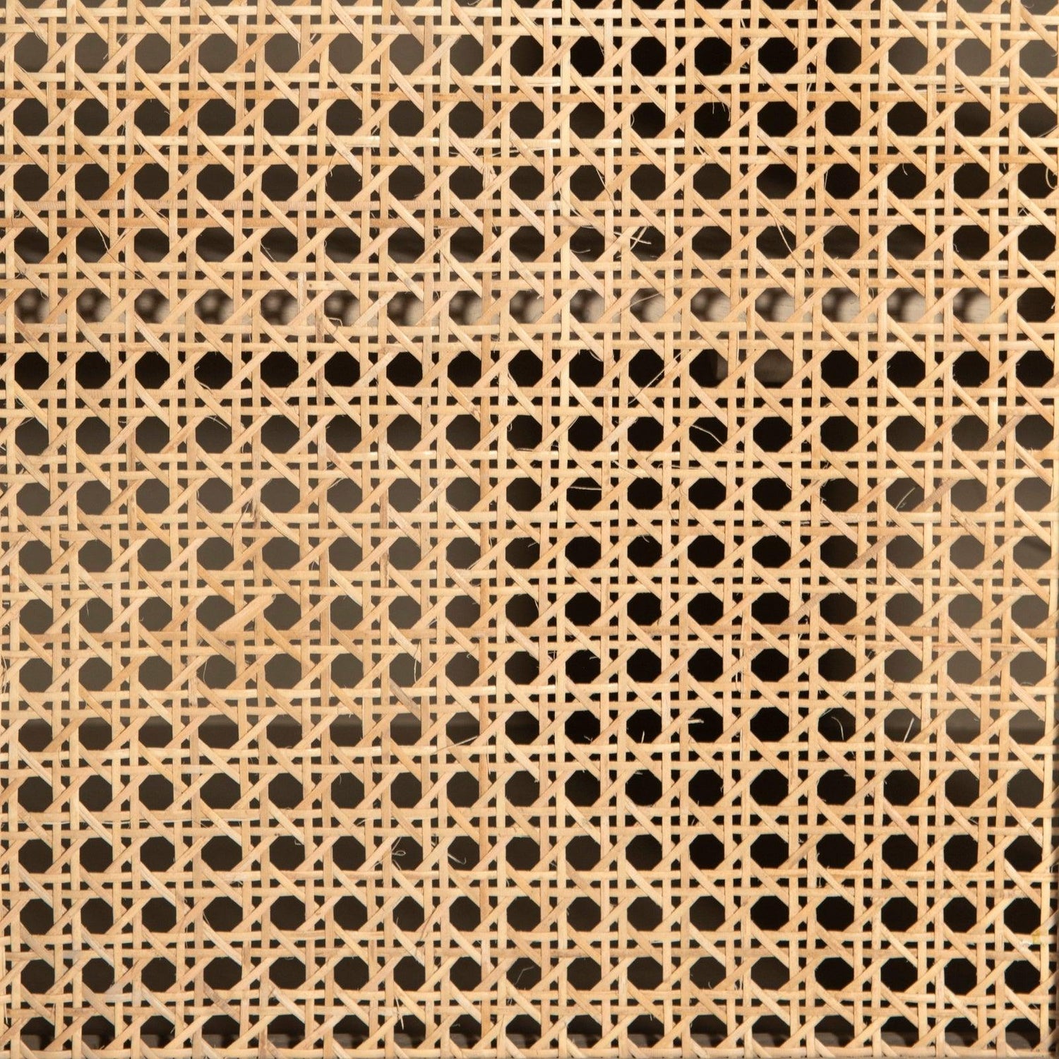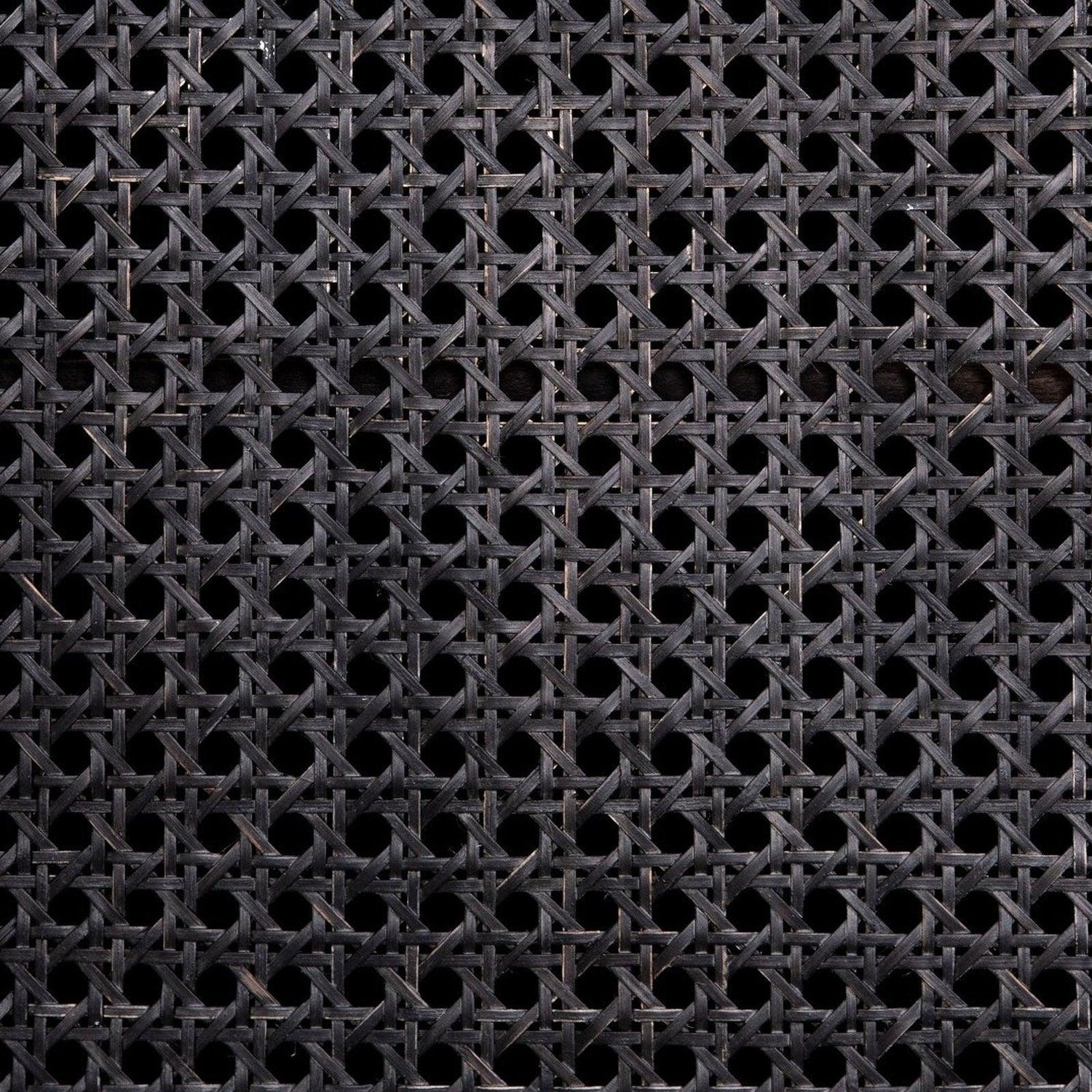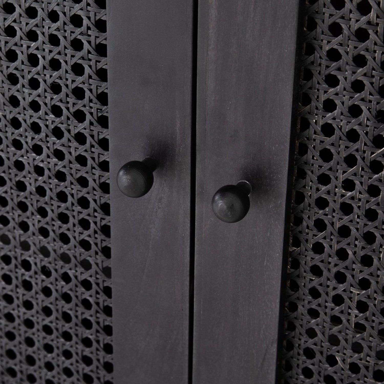 - El mango lavado en negro/natural encierra paneles de puerta de caña arqueados con herrajes de hierro con acabado negro, combinando una mezcla de materiales vanguardista con vibraciones monocromáticas.