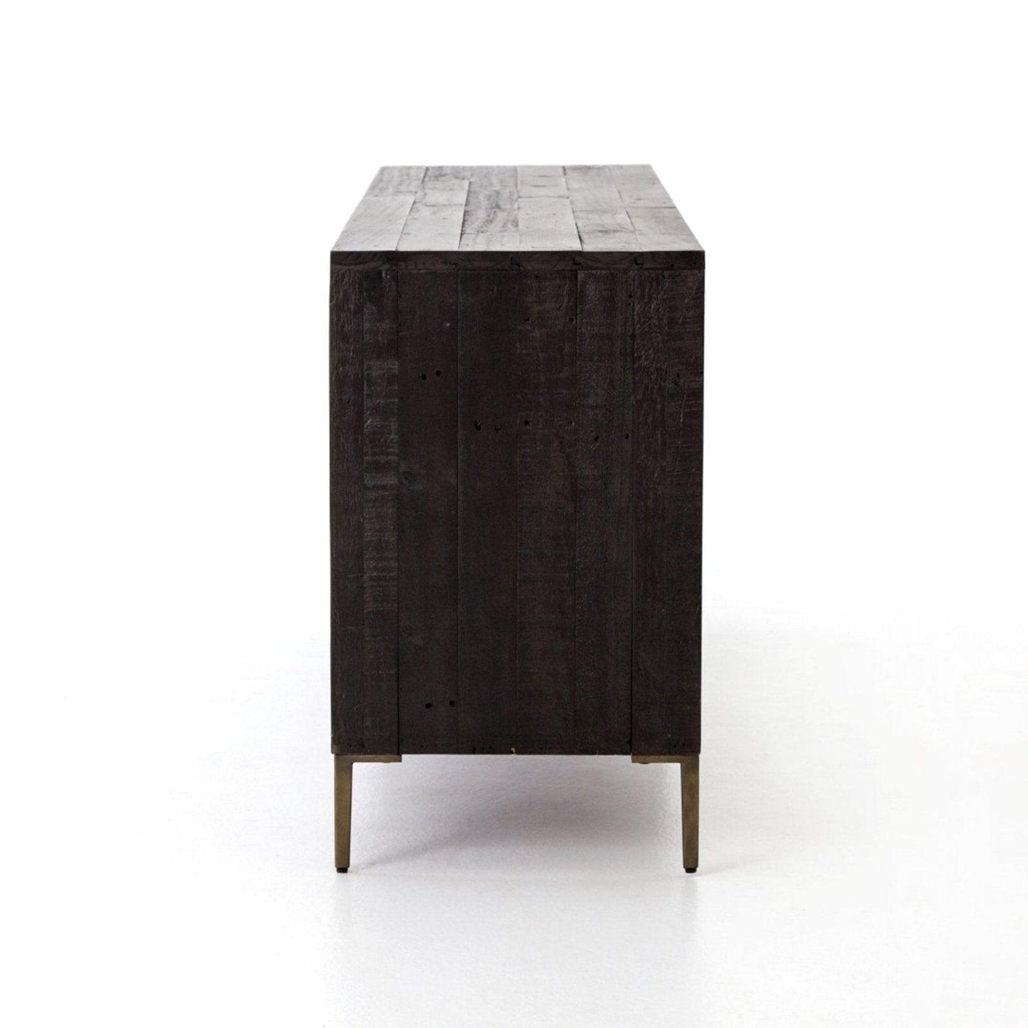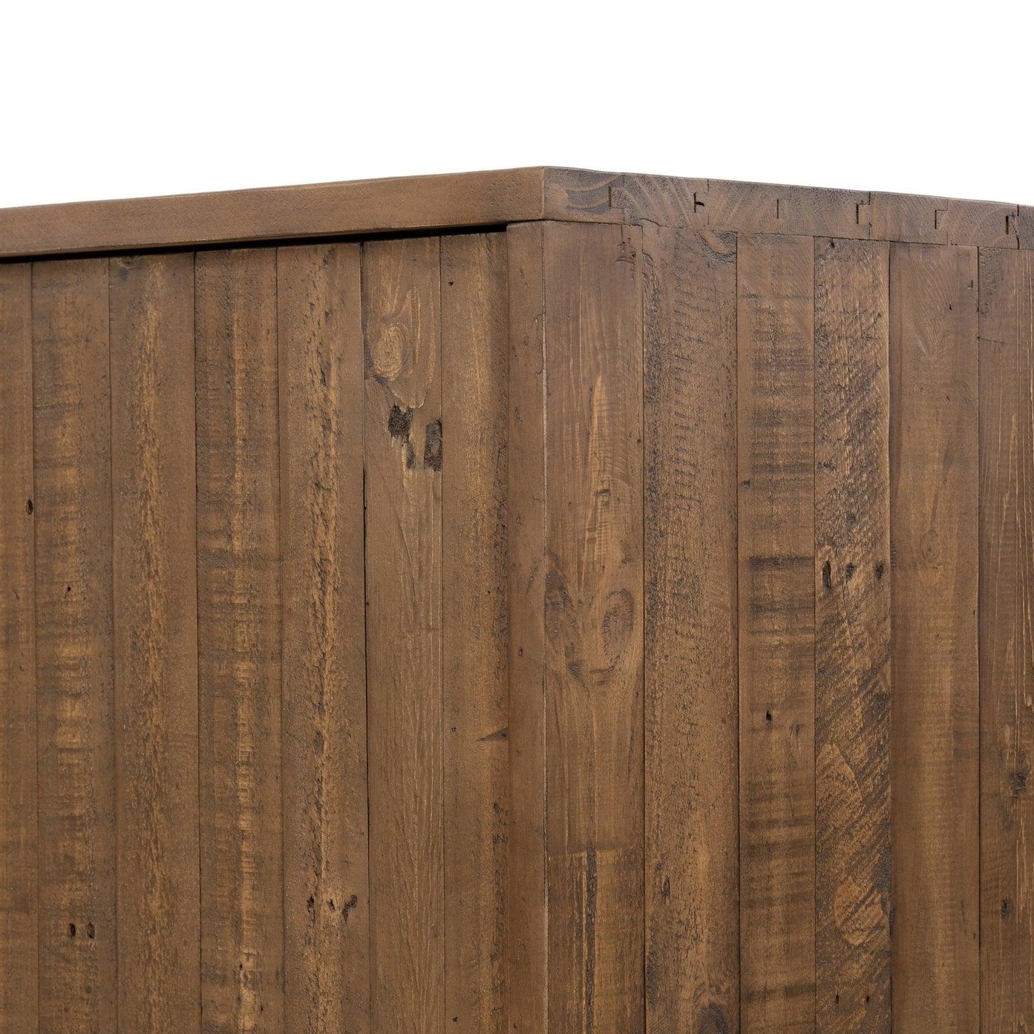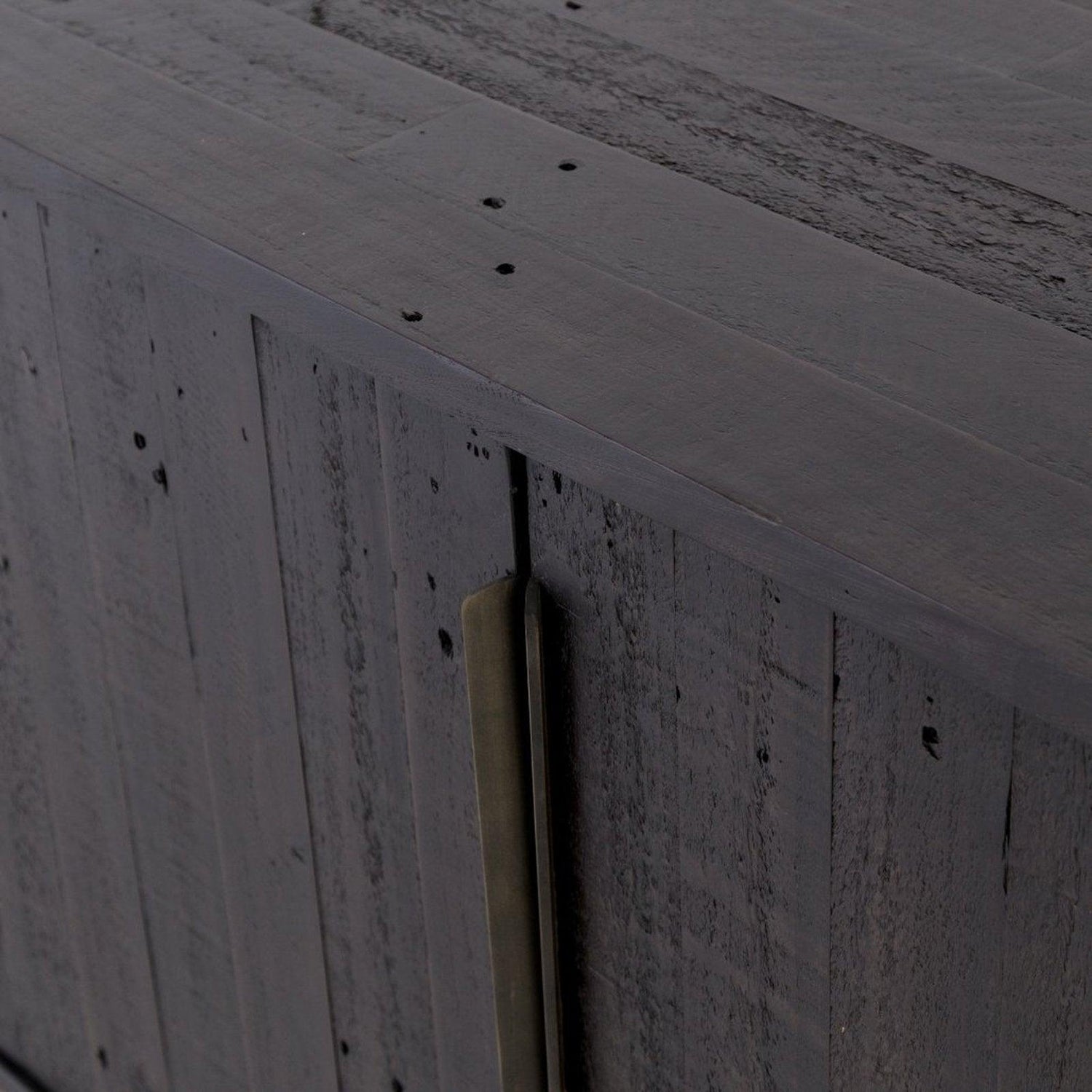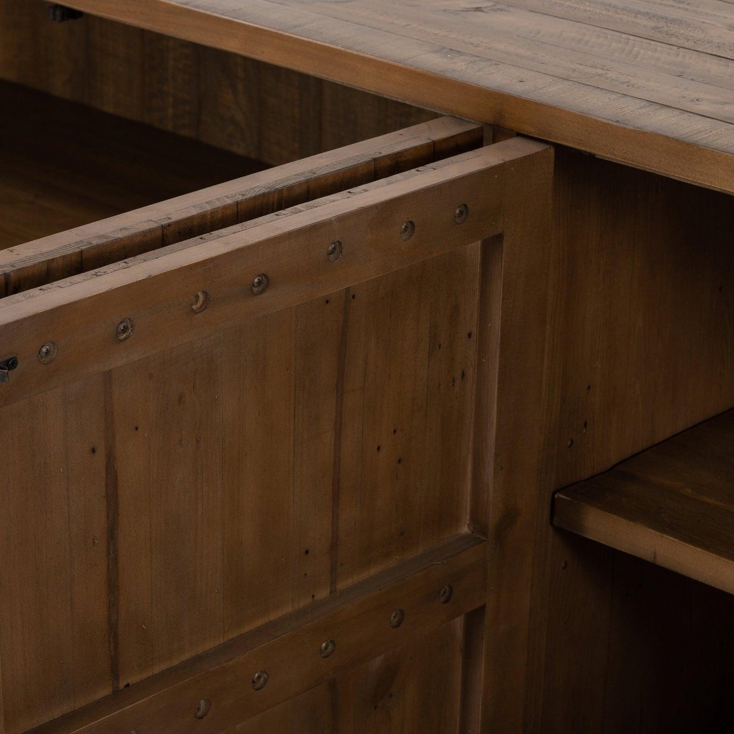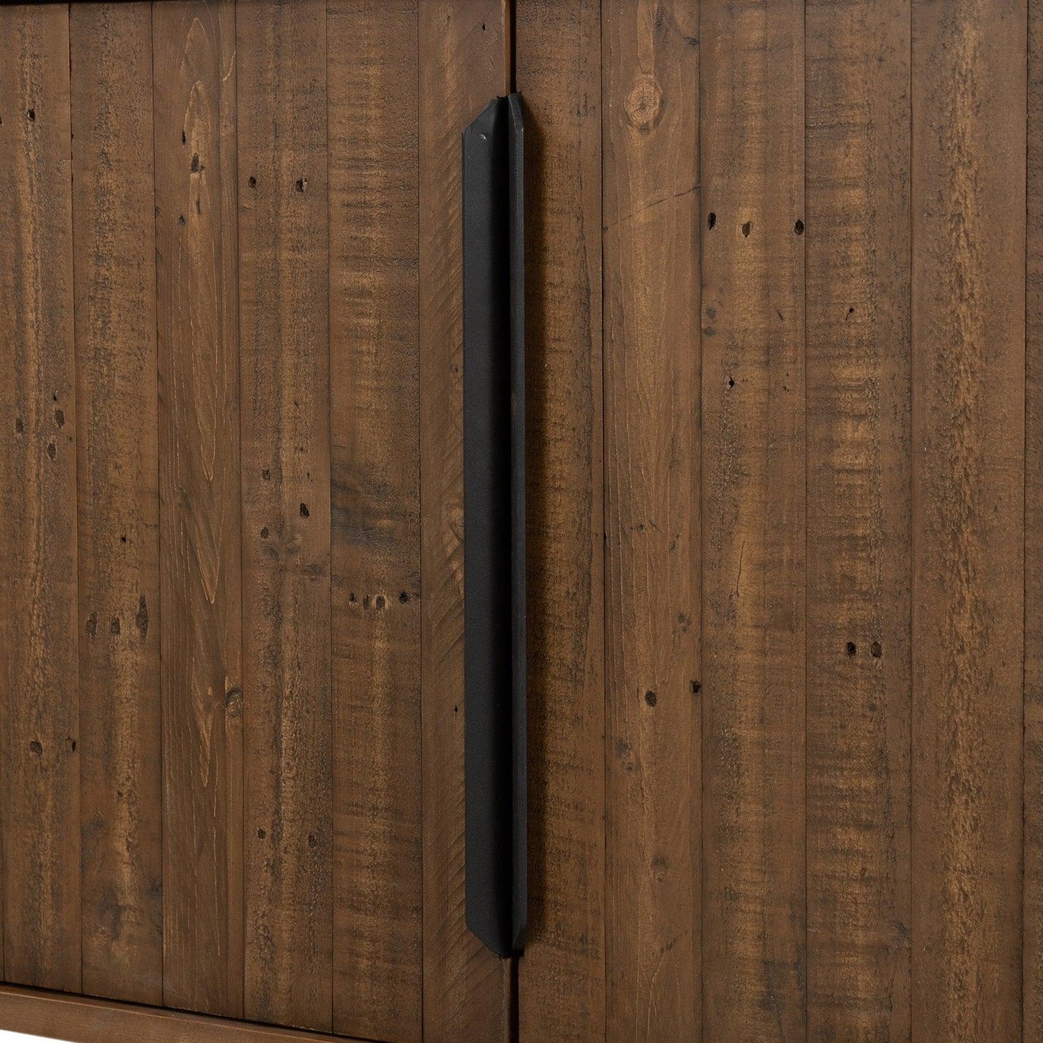 • Con un acabado en sándalo rústico, el pino macizo recuperado hace alarde de su veta natural, mientras que los herrajes de hierro planos con acabado metalizado añaden un toque de modernidad a un aparador espacioso.