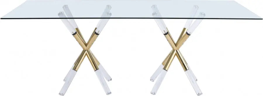 Dale un toque moderno a tu sala con esta mesa de comedor Mercury de acrílico dorado de Meridian Furniture. La base presenta un diseño de pedestal con patas de acrílico dorado que le dan un toque moderno y divertido. El tablero de vidrio templado ofrece amplio espacio para acomodar a tus invitados en comidas íntimas. El tablero es transparente, por lo que puedes apreciar fácilmente la belleza de las patas metálicas, dándole a tu sala o estudio un toque especial.