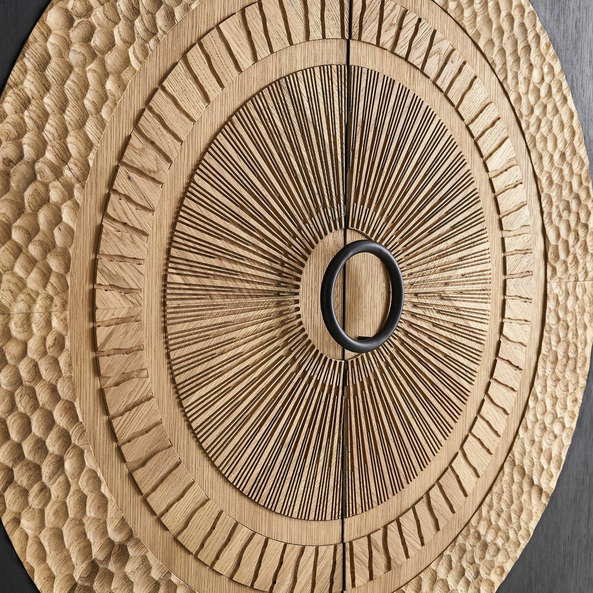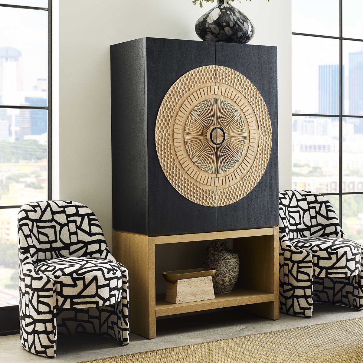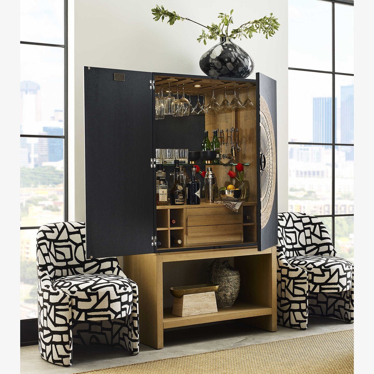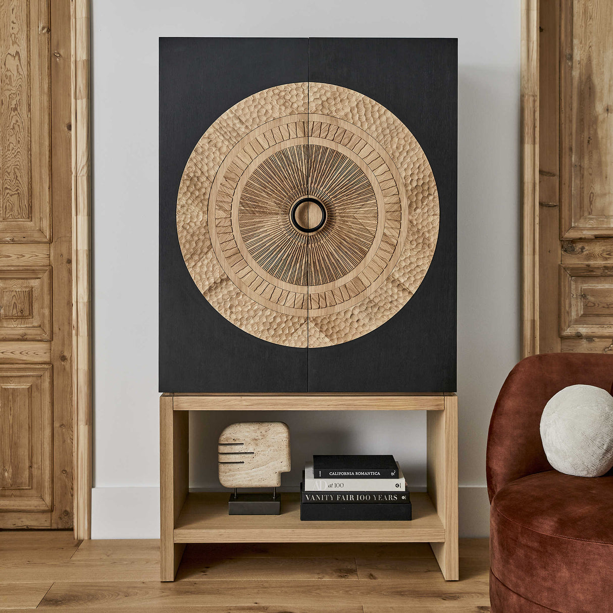 Con reminiscencias de las esculturas mayas de mediados del siglo XX que interpretaban las tallas solares, el mueble bar Soleil es una obra de arte funcional. Su tallado en madera con acabado natural y su interior de roble blanco americano cuarteado contrastan con el exterior con acabado negro. Las impresionantes puertas talladas a mano presentan una variedad de texturas fascinantes.