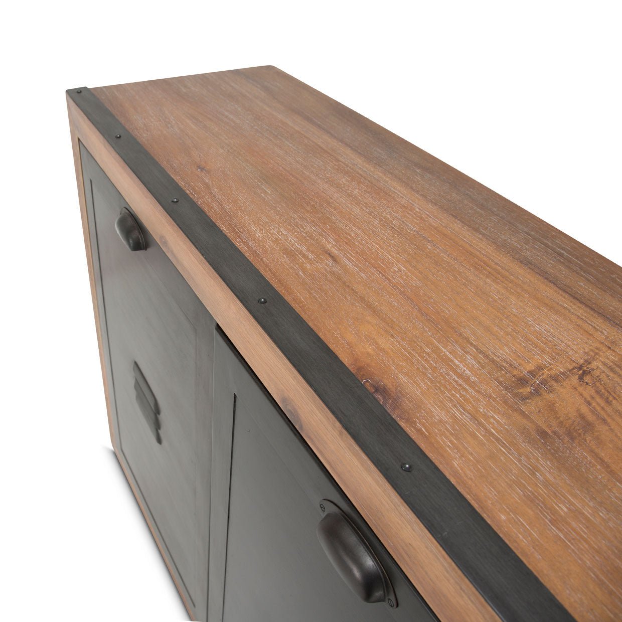 - 3 gabinetes cuentan con carcasa de metal con tiradores con muescas y detalles industriales