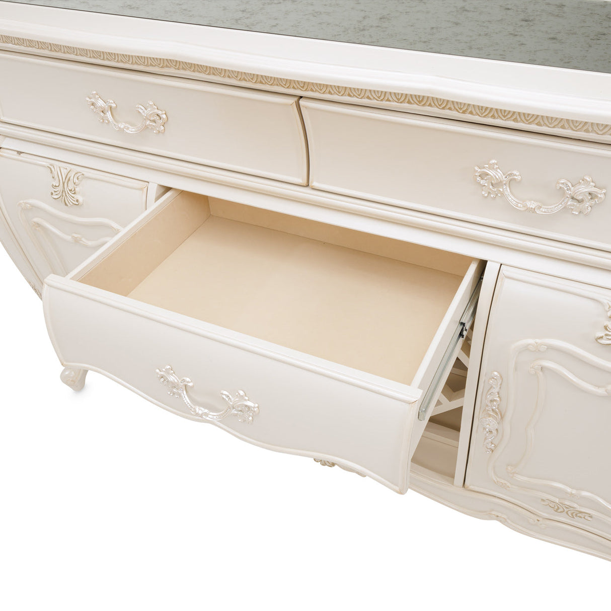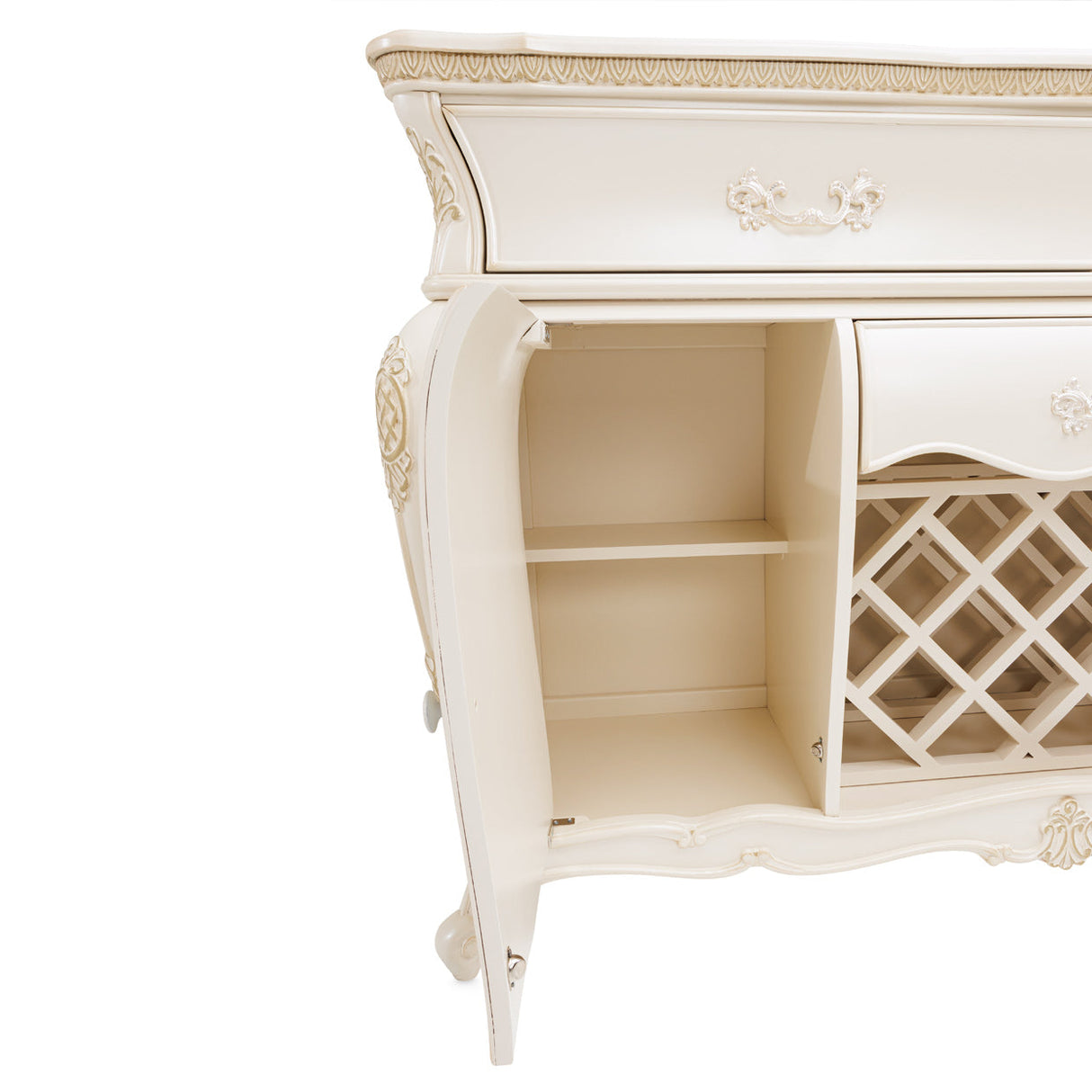 Elegancia atemporal con encanto funcional. El aparador Lavelle en Classic Pearl añade un toque de elegancia y lujo a cualquier hogar tradicional. Adornado con herrajes con detalles de cristal, espejo antiguo y suaves curvas, este aparador es tanto una joya decorativa como una solución de almacenamiento inteligente.
