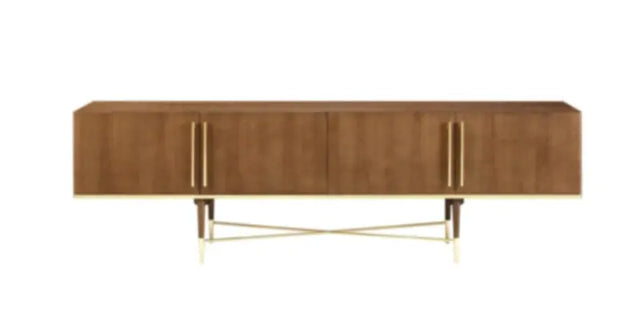El aparador Modrest Bernard Mid-Century Modern en nogal y dorado está diseñado para convertir su comedor en un espacio elegante y organizado. Con un diseño estilizado, presenta un lustroso acabado en chapa de nogal con atractivas vetas de madera. Equipado con cuatro gabinetes con estantes de vidrio en su interior, este aparador rectangular le ofrece amplio espacio de almacenamiento para porcelana fina y otras vajillas. Las manijas y detalles de acero inoxidable dorado en la puerta lo convierten en un mueble práctico. Las patas cónicas con soportes en forma de "X" proporcionan un soporte resistente.