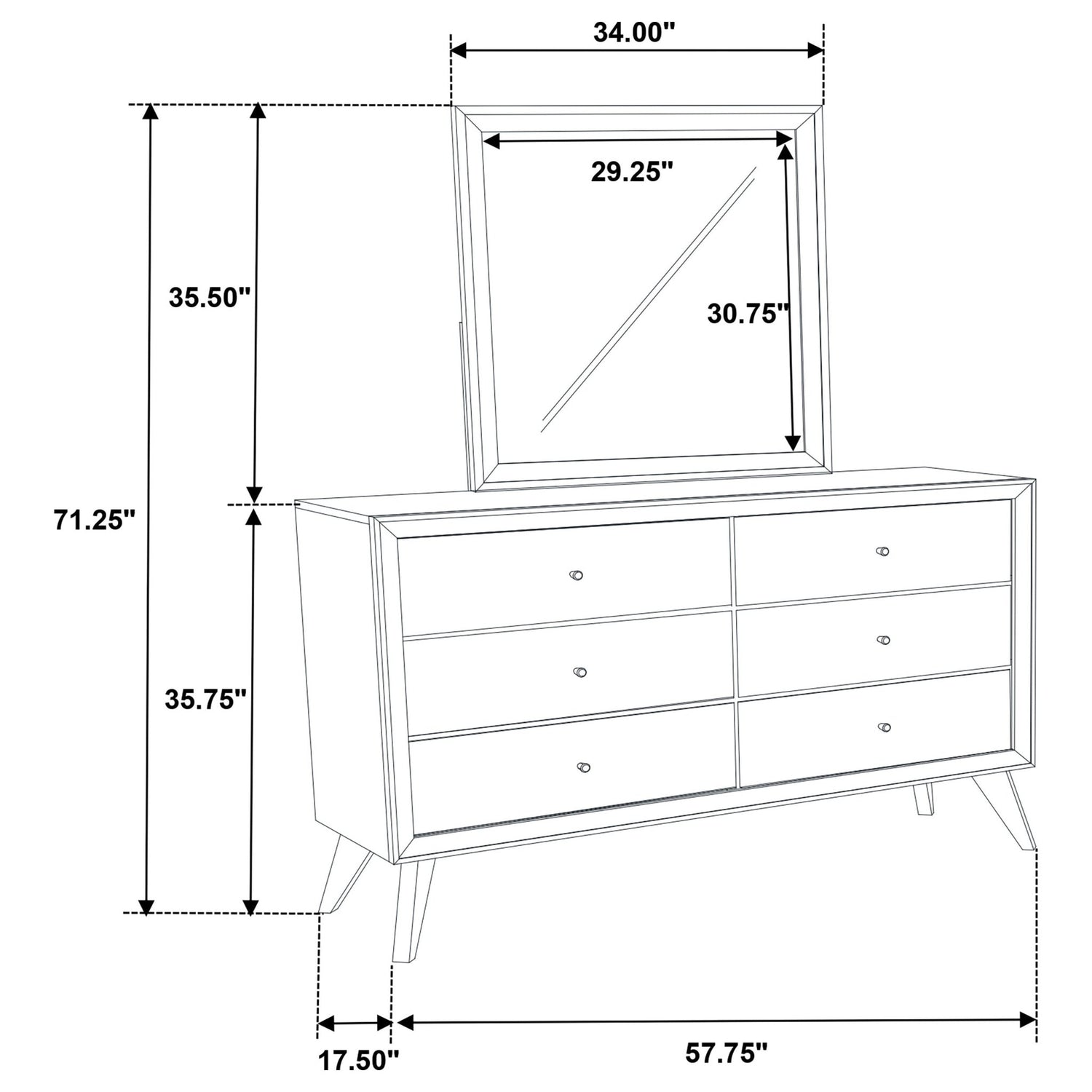 Cómoda con espejo: 57,00" de ancho x 16,75" de profundidad x 71,50" de alto