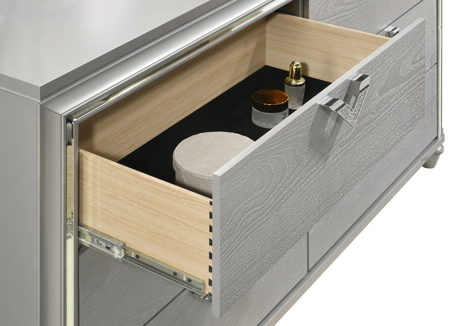 - Un acabado plateado suave y claro resalta los cajones con detalles de vetas de madera y ofrece una gran dimensionalidad.