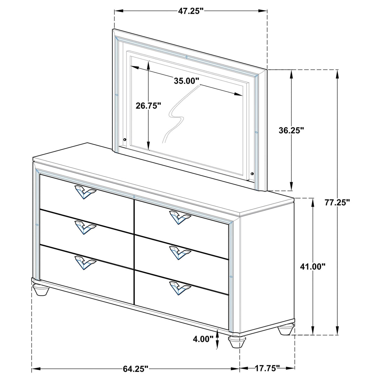 Cómoda con espejo: 64,25" de ancho x 18,25" de profundidad x 77,50" de alto