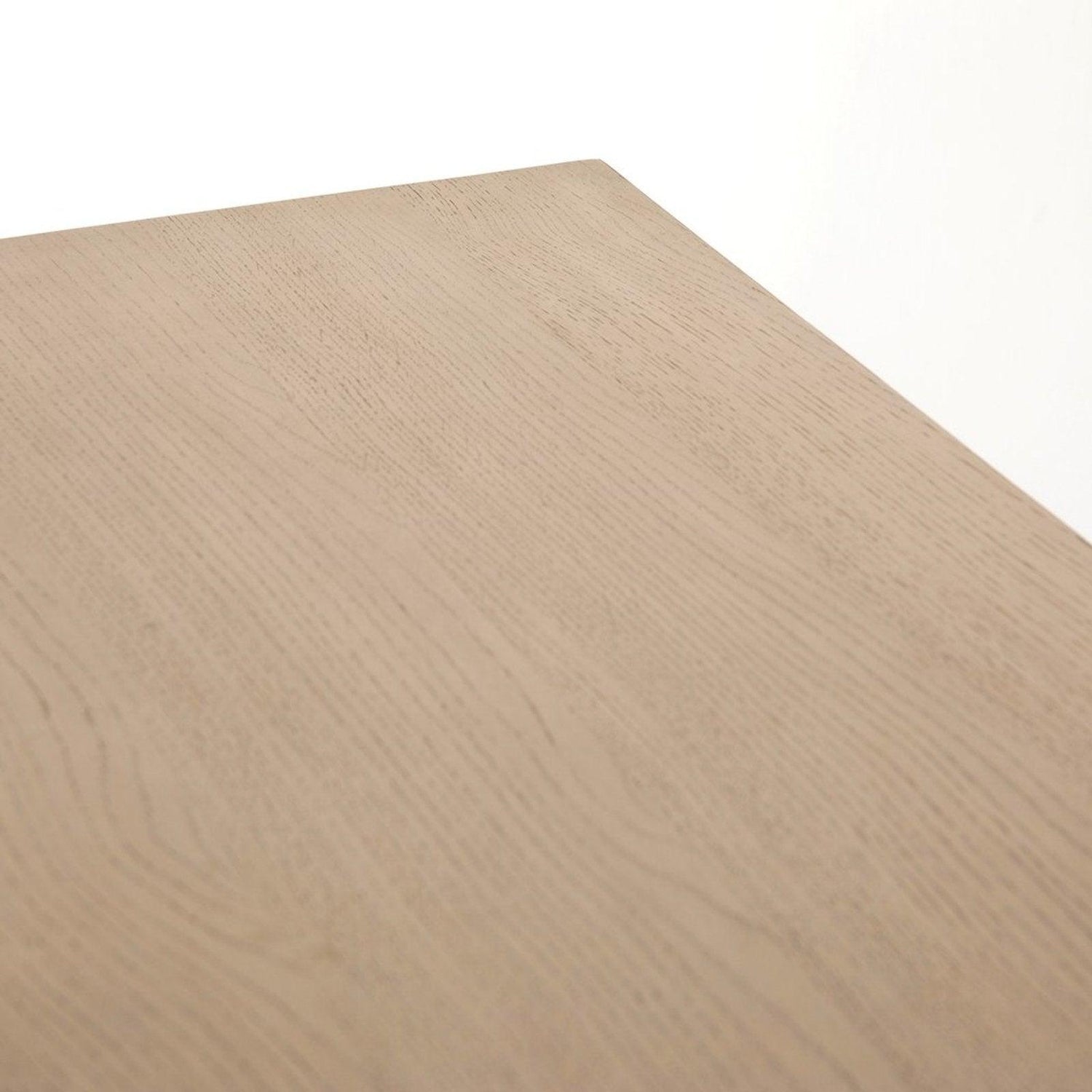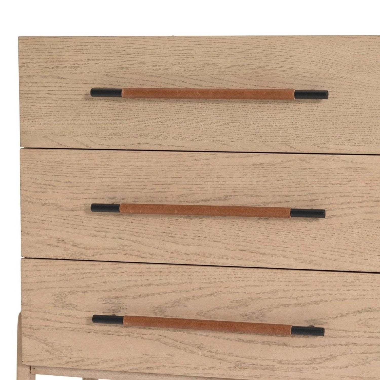 - El roble con acabado claro forma una silueta limpia para seis cajones espaciosos con herrajes de hierro envueltos en cuero de grano superior color tostado.