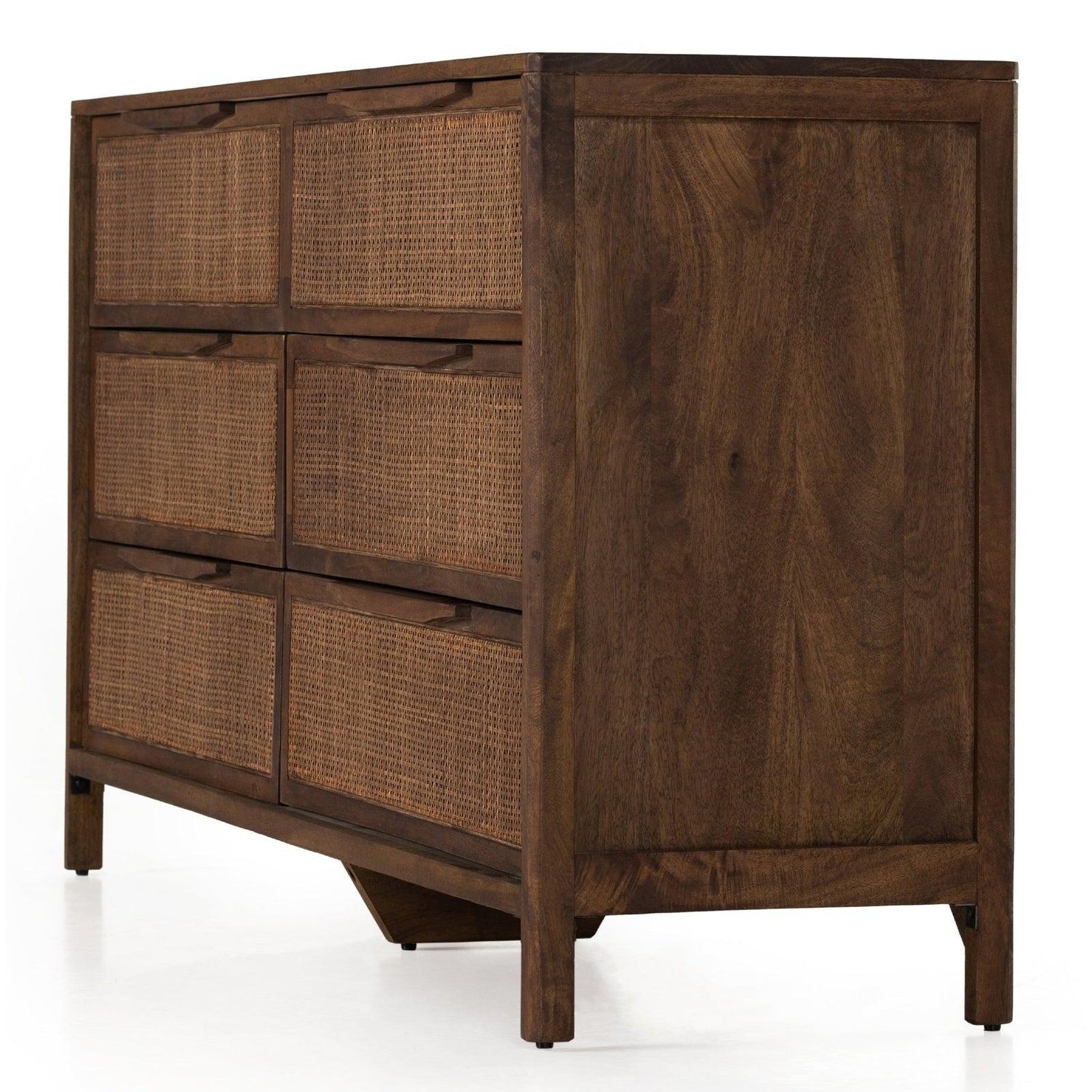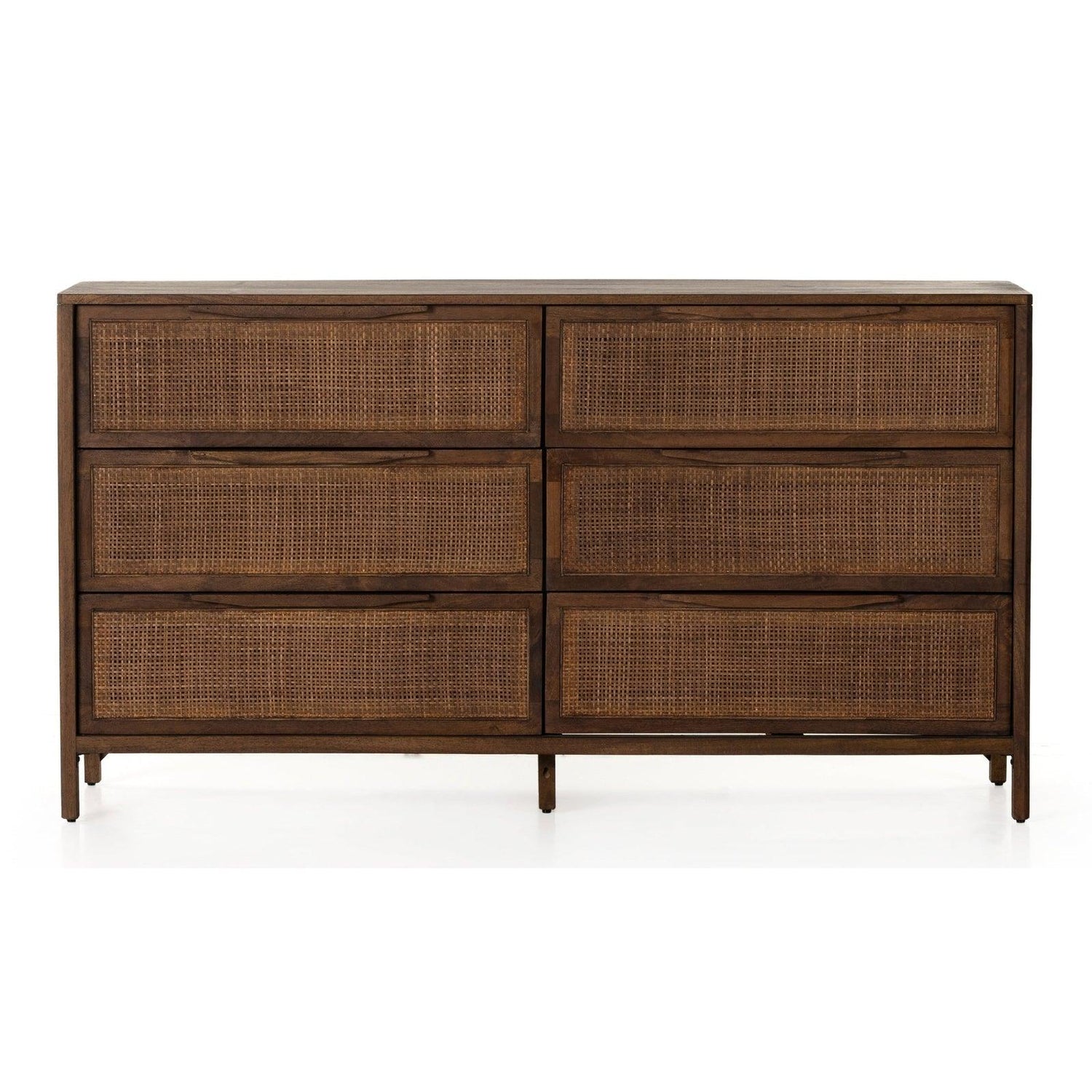 - El mango lavado en marrón encierra seis espaciosos cajones de caña tejida, para lograr una apariencia texturizada con toques monocromáticos.