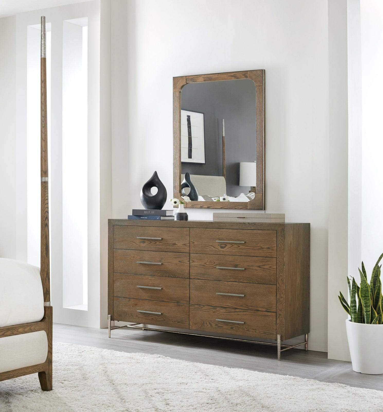Combinando el estilo artesanal con un toque contemporáneo, la cómoda Chapman de ocho cajones de Hooker Furniture es una sofisticada solución de almacenamiento inspirada en la vida urbana. Con un acabado en una cálida chapa de roble Sorrel marrón, esta elegante cómoda se acentúa con herrajes de peltre personalizados , finas patas metálicas y una base de bastidor. Con guías de cajones de cierre suave y un almacenamiento interno bien pensado, incluyendo cajones forrados en fieltro y cedro, esta pieza es tan práctica como elegante.