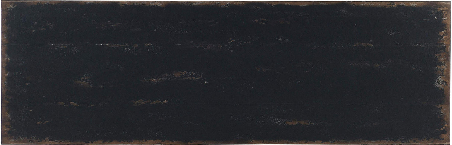 - Acabado negro desgastado por el tiempo con agujeros de gusano y frotamiento multicapa.
