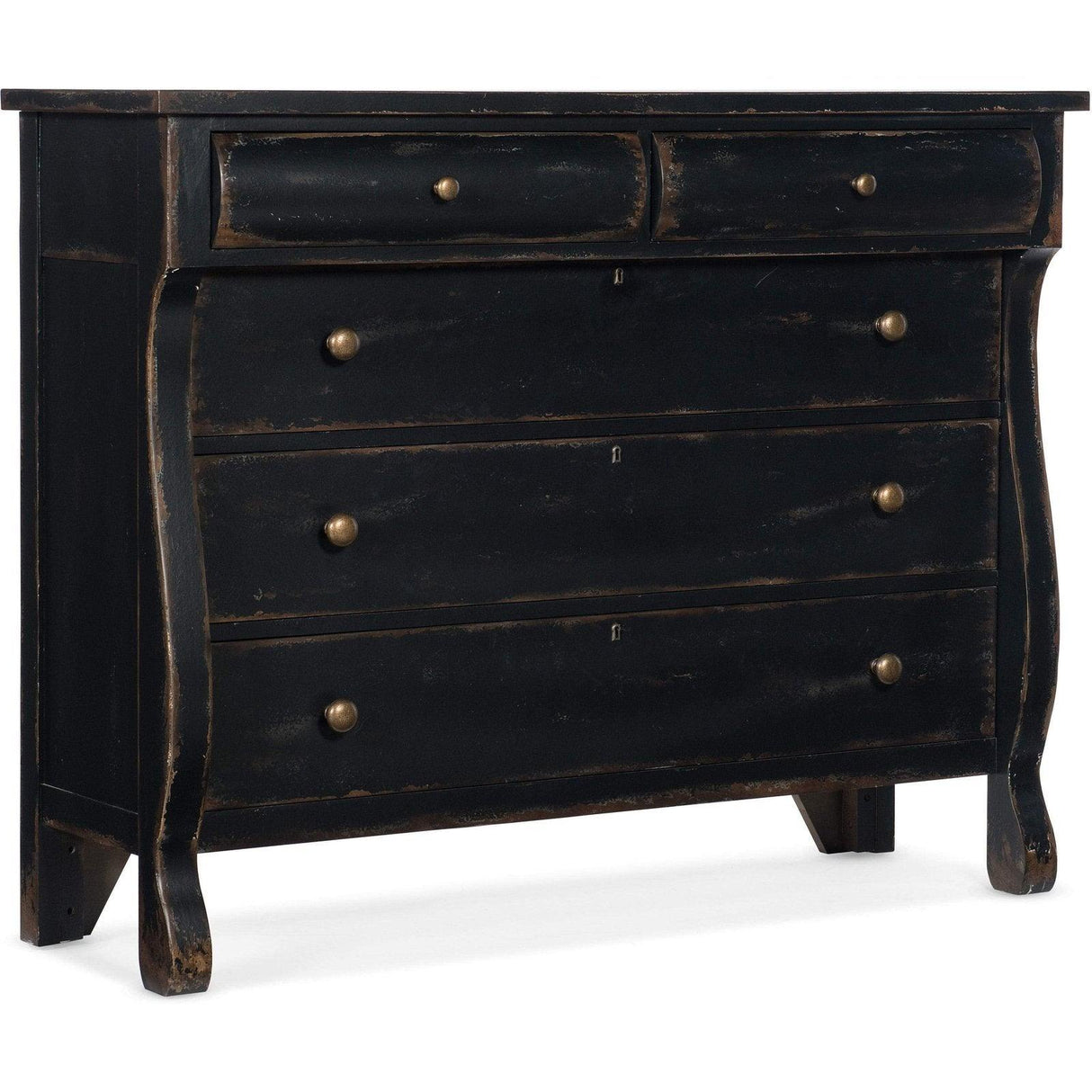 El buró Ciao Bella de cinco cajones de Hooker Furniture captura el encanto de las casas rurales europeas con su silueta de suaves curvas, herrajes de latón bruñido y un rico acabado negro envejecido . Fabricado con chapa de arce, cedro y maderas nobles macizas , este buró evoca una sensación de historia y romance, perfecto para interiores acogedores y rústicos.
