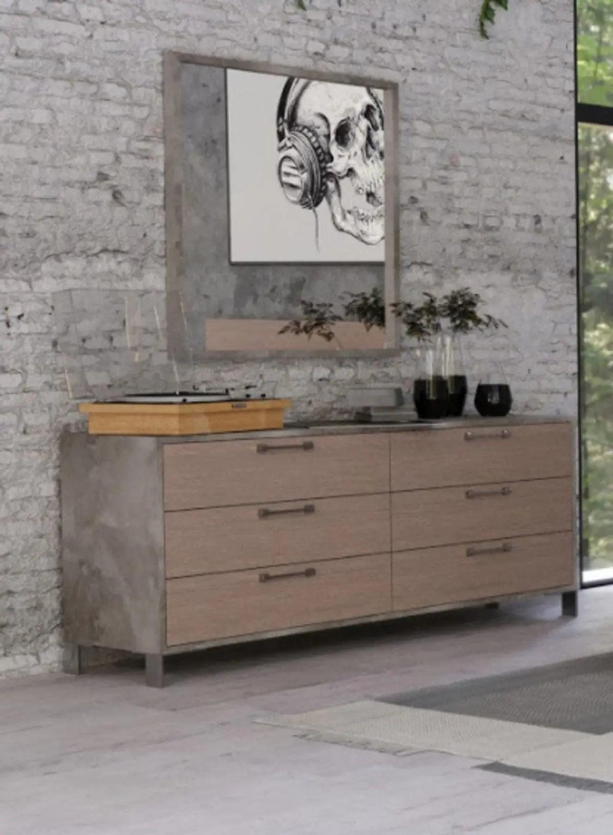 El laminado imitación hormigón envuelve las elegantes líneas limpias de la cómoda Boston, creando una atractiva yuxtaposición. Elegantes tiradores de acero inoxidable adornan los seis cajones de cierre suave, revestidos con laminado de roble marrón. Con patas de acero inoxidable a juego, esta pieza es el complemento perfecto para tu hogar urbano. Combínala con la cama Boston, las mesitas de noche, la cómoda y el espejo para completar el conjunto.