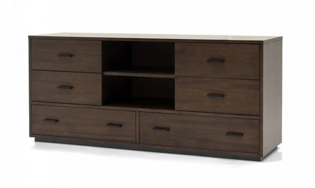 En la era tecnológicamente avanzada de hoy, la necesidad de una cómoda que pueda contener ropa y también un televisor de pantalla plana nunca ha sido mayor. Esta cómoda contemporánea, con seis cajones forrados de fieltro y dos compartimentos abiertos, está construida en acacia maciza y MDF.