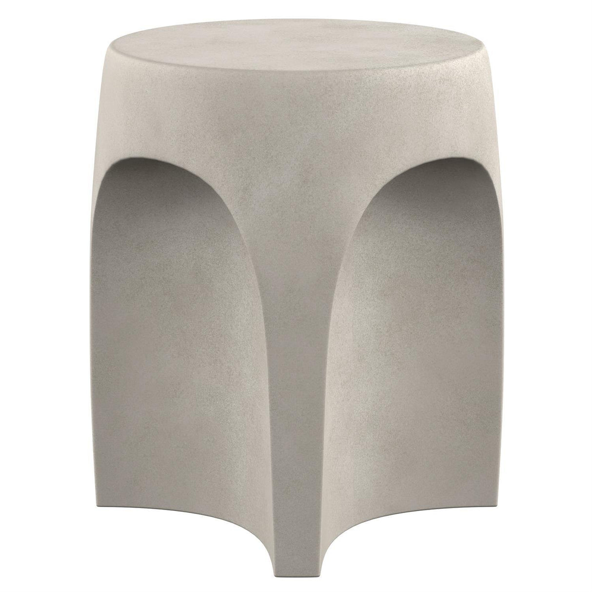 - Una forma de tambor primitiva se redefine con arcos profundamente tallados en esta mesa auxiliar.