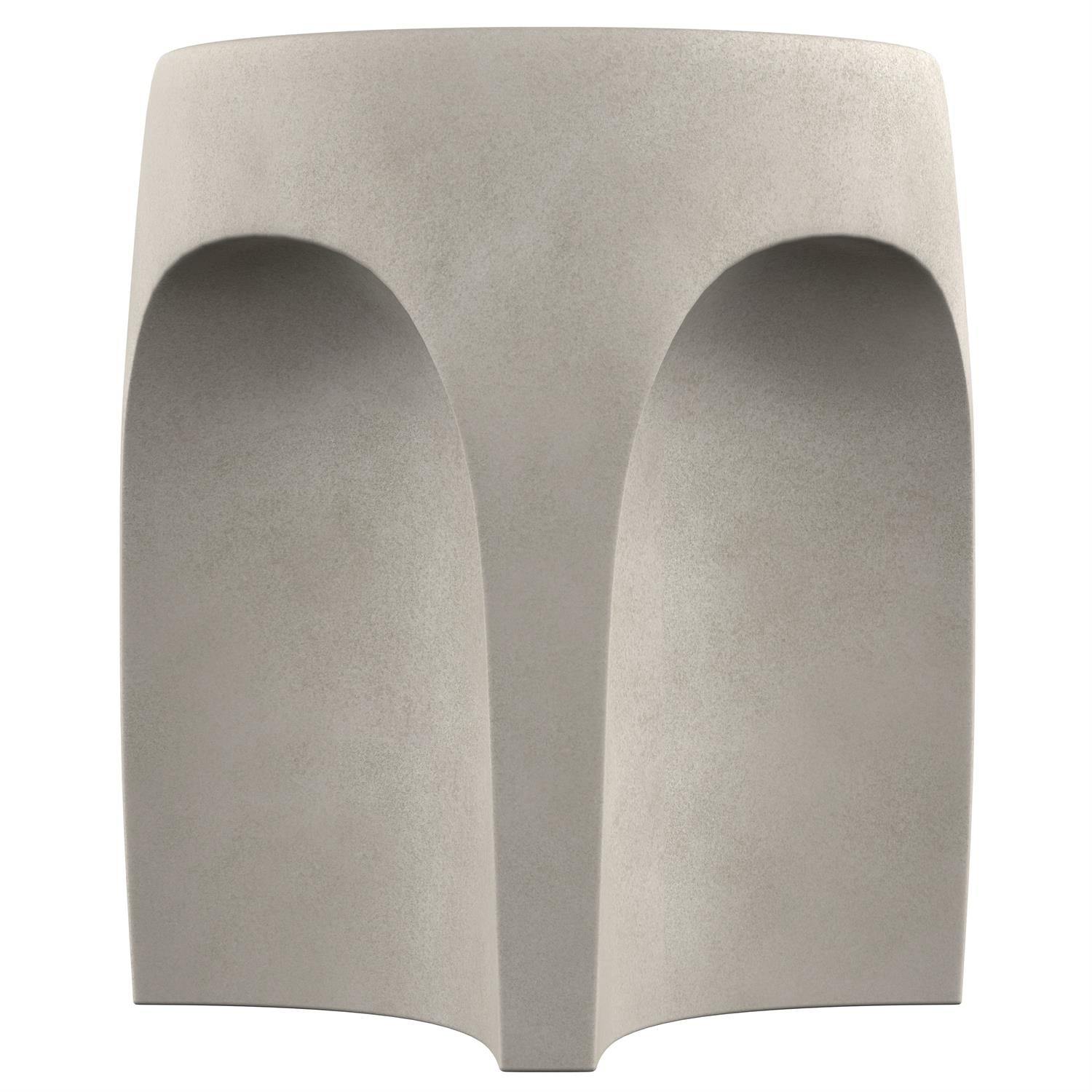 - Fabricada en hormigón reforzado con vidrio con acabado Bedrock, la mesa tiene arcos laterales profundamente tallados y una superficie lisa.