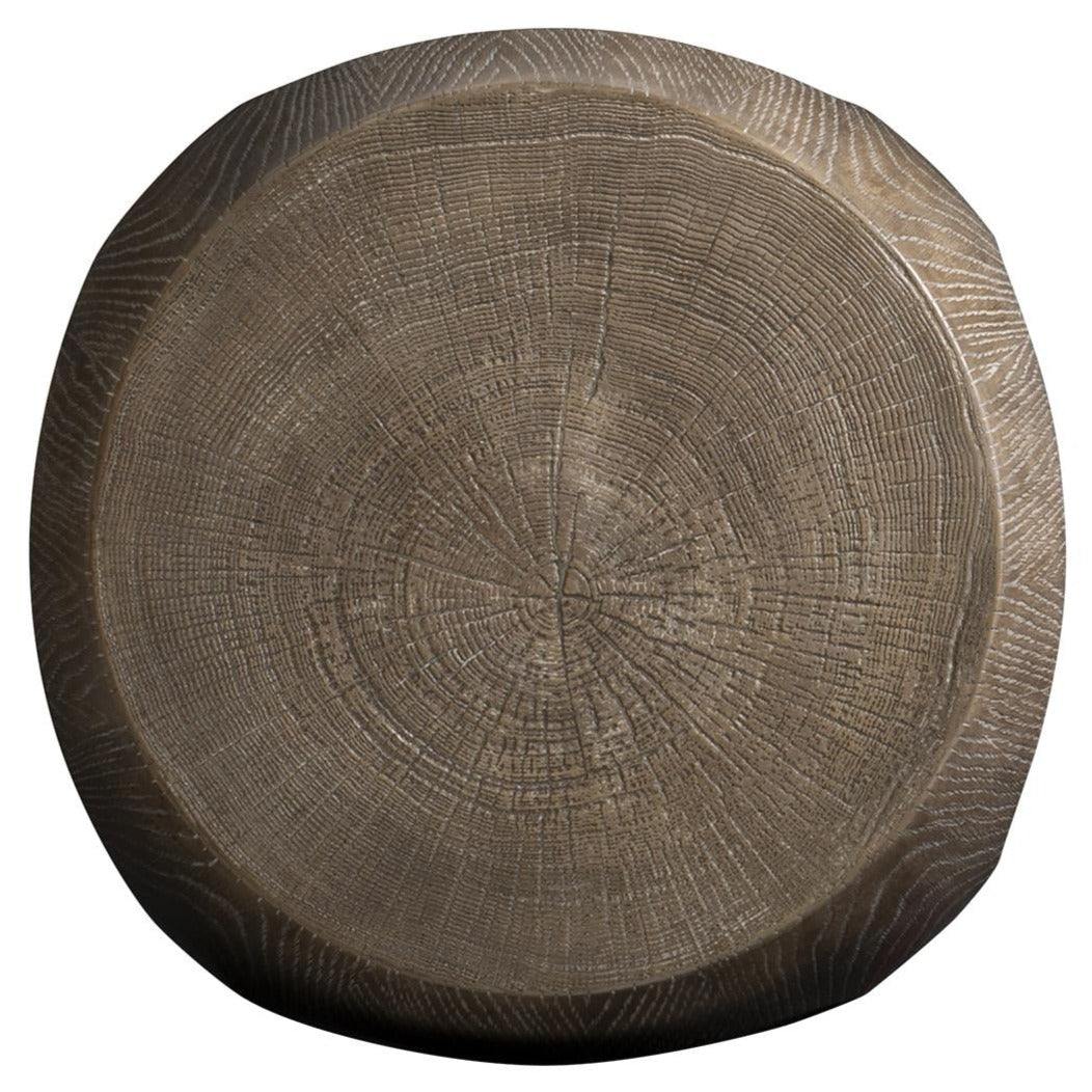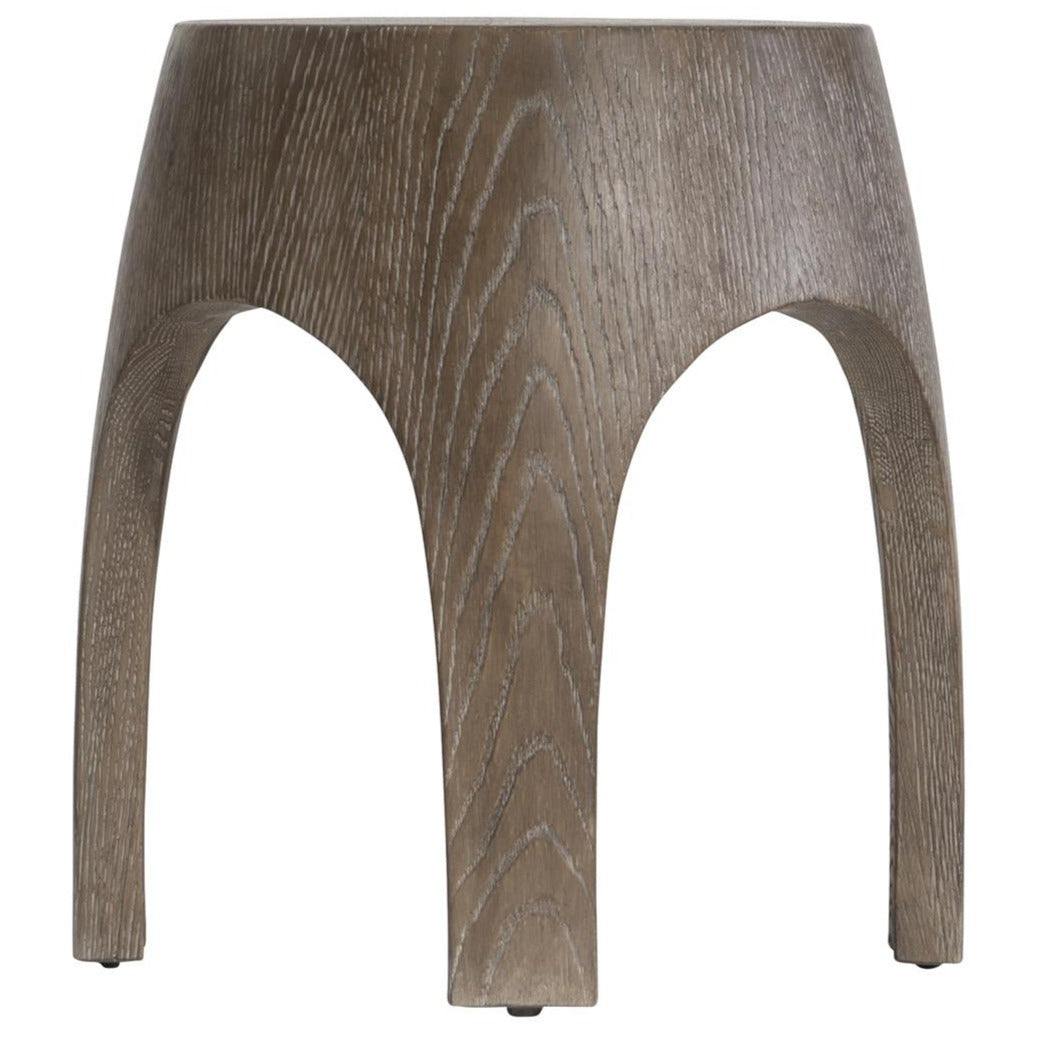- Una forma de tambor primitiva se redefine con patas arqueadas en esta mesa auxiliar de madera.