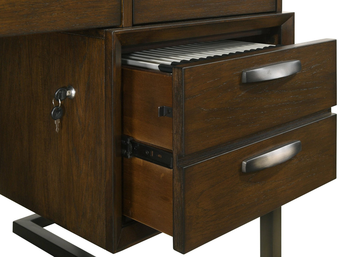Un diseño atractivo se combina con la máxima funcionalidad en este encantador escritorio ejecutivo de transición para su oficina en casa. Su acabado en nogal oscuro realza los intrigantes detalles de diseño, creando una sensación sofisticada y refinada que sin duda impresionará. Los tiradores con acabado gunmetal y la base metálica decorativa y abierta crean contraste y personalidad, garantizando un espacio de trabajo acogedor y cálido. El escritorio está equipado con un panel de alimentación y un sistema de gestión de cables para un aspecto ordenado, especialmente cuando se integra en su oficina. Un cajón para archivos con cerradura, dos cajones pequeños con forro de fieltro, dos cajones para accesorios más grandes y una bandeja para teclado abatible añaden amplio espacio de almacenamiento y versatilidad para personalizar su espacio a la perfección.