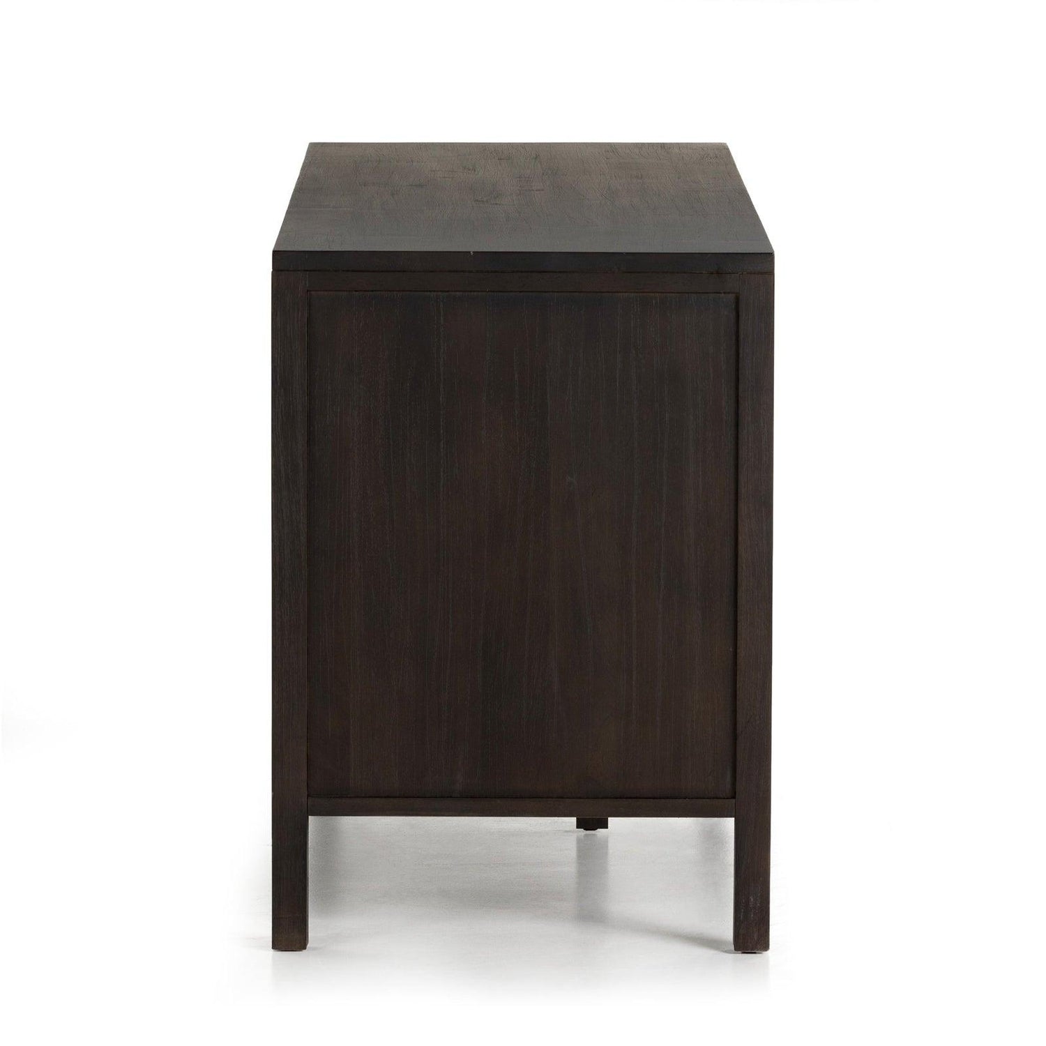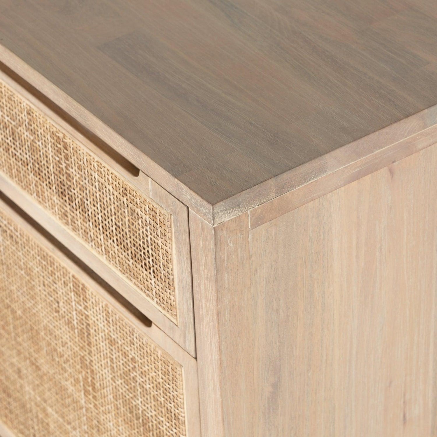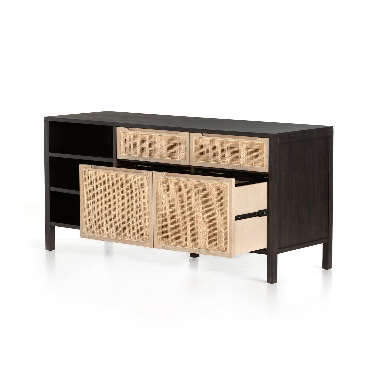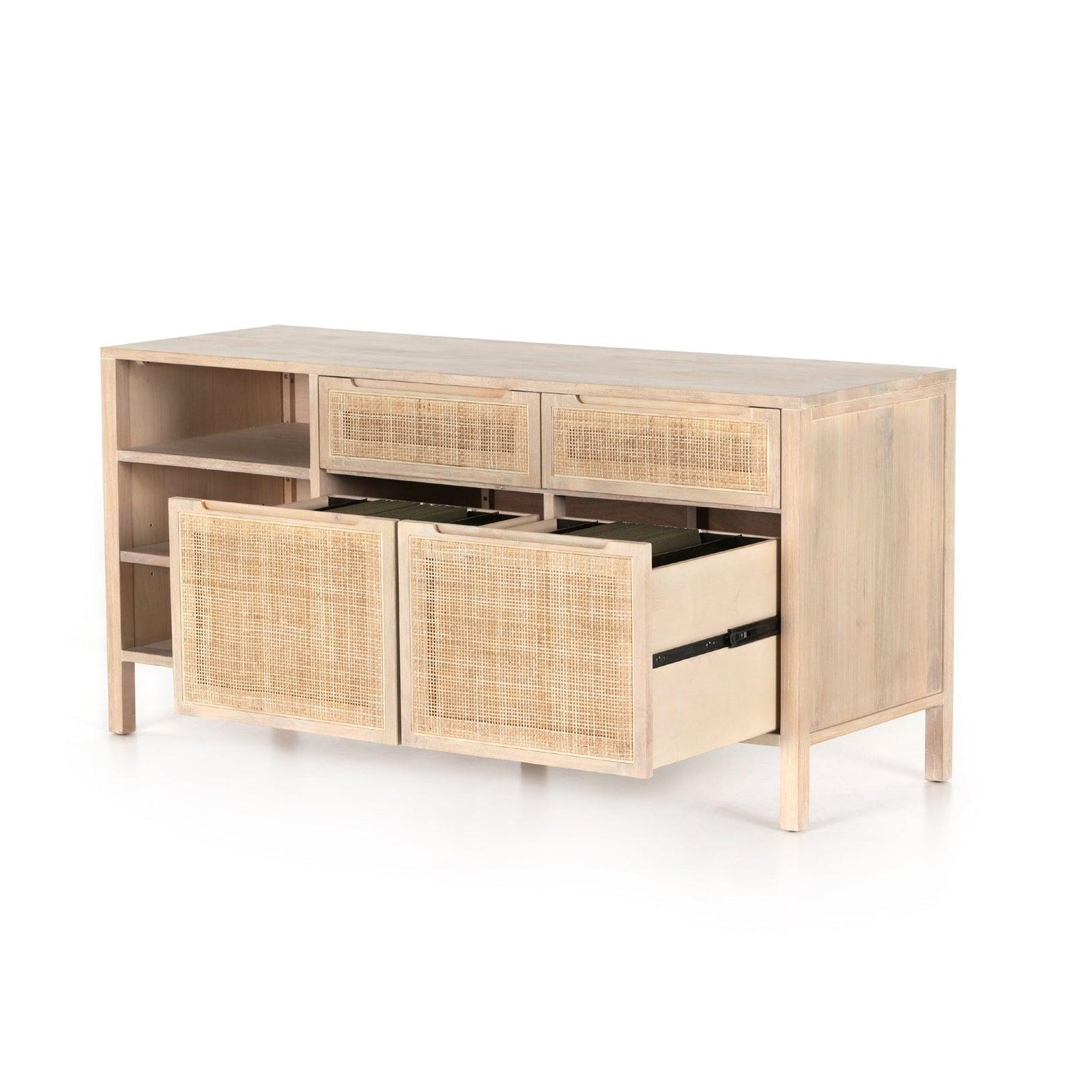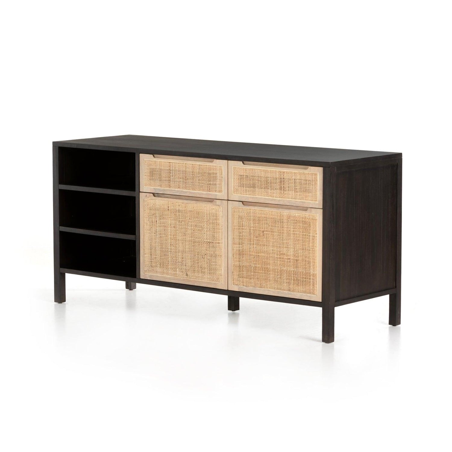- Un archivador de líneas limpias en mango lavado en negro/mango lavado en blanco presenta frentes de cajones cubiertos de caña natural y estantes abiertos, que aportan almacenamiento, contraste y textura a la oficina moderna.