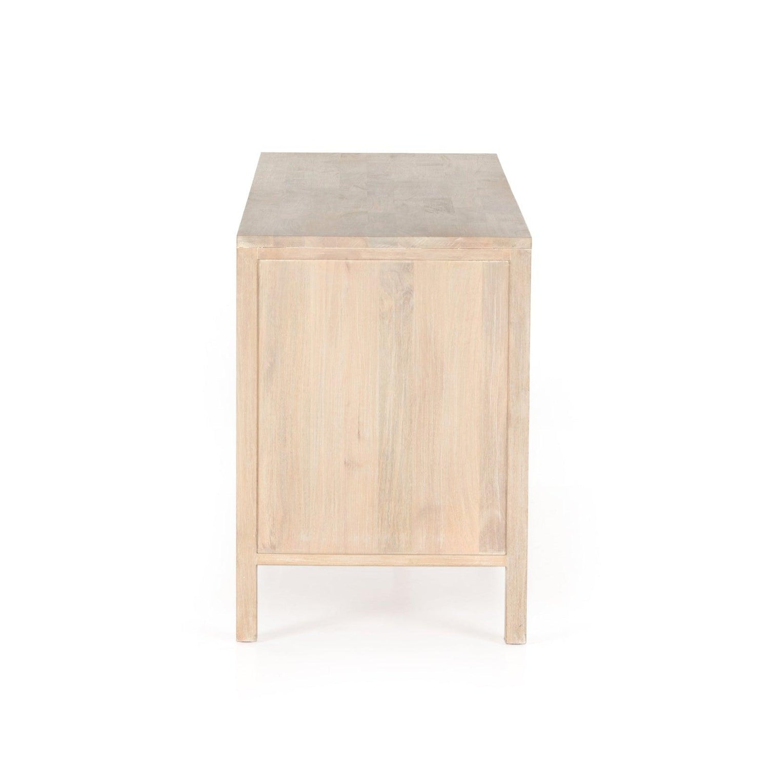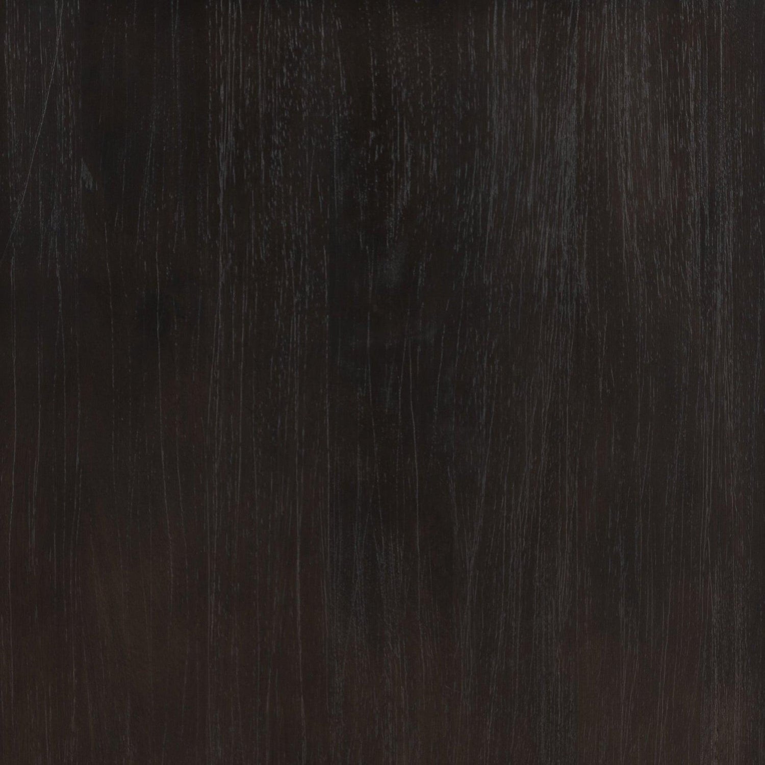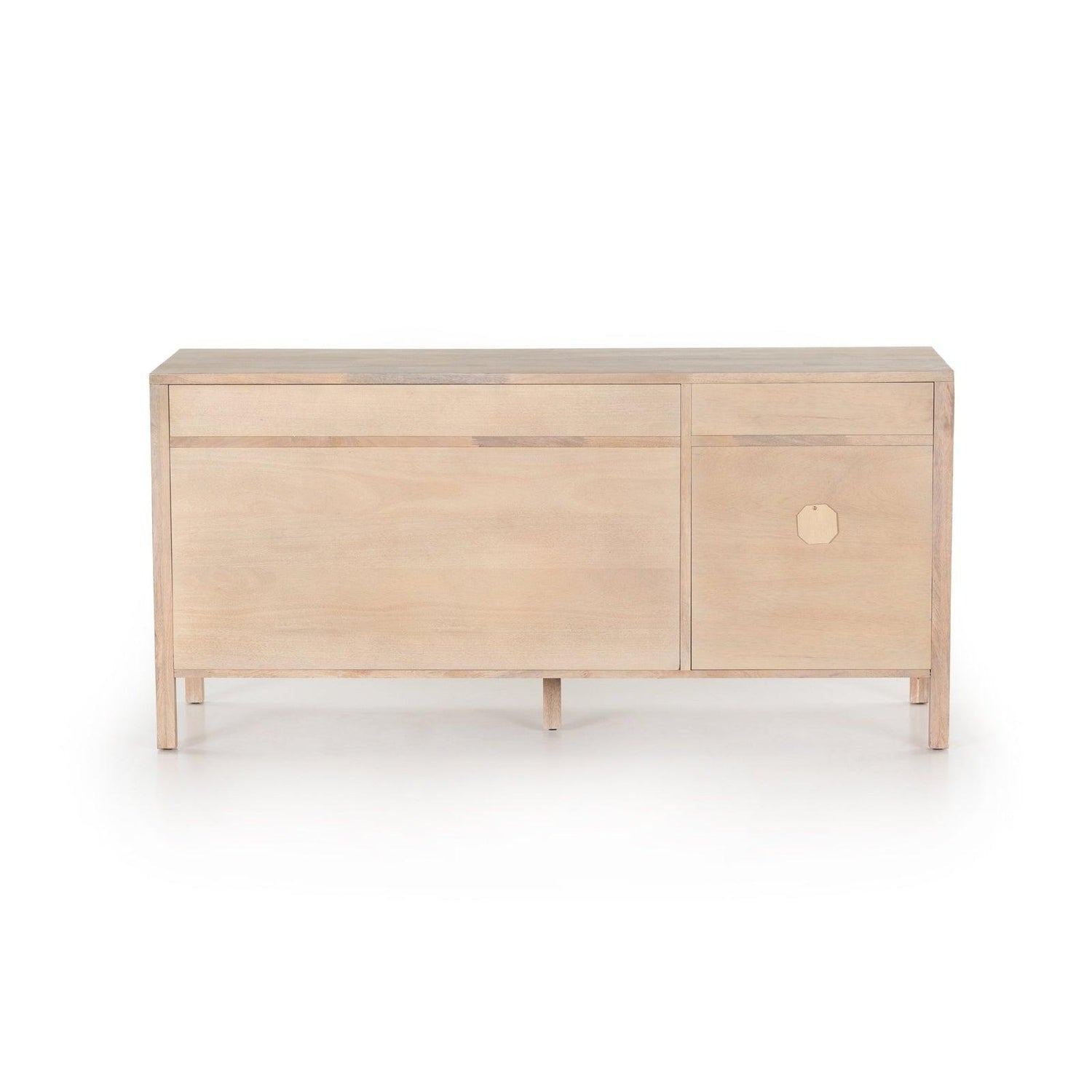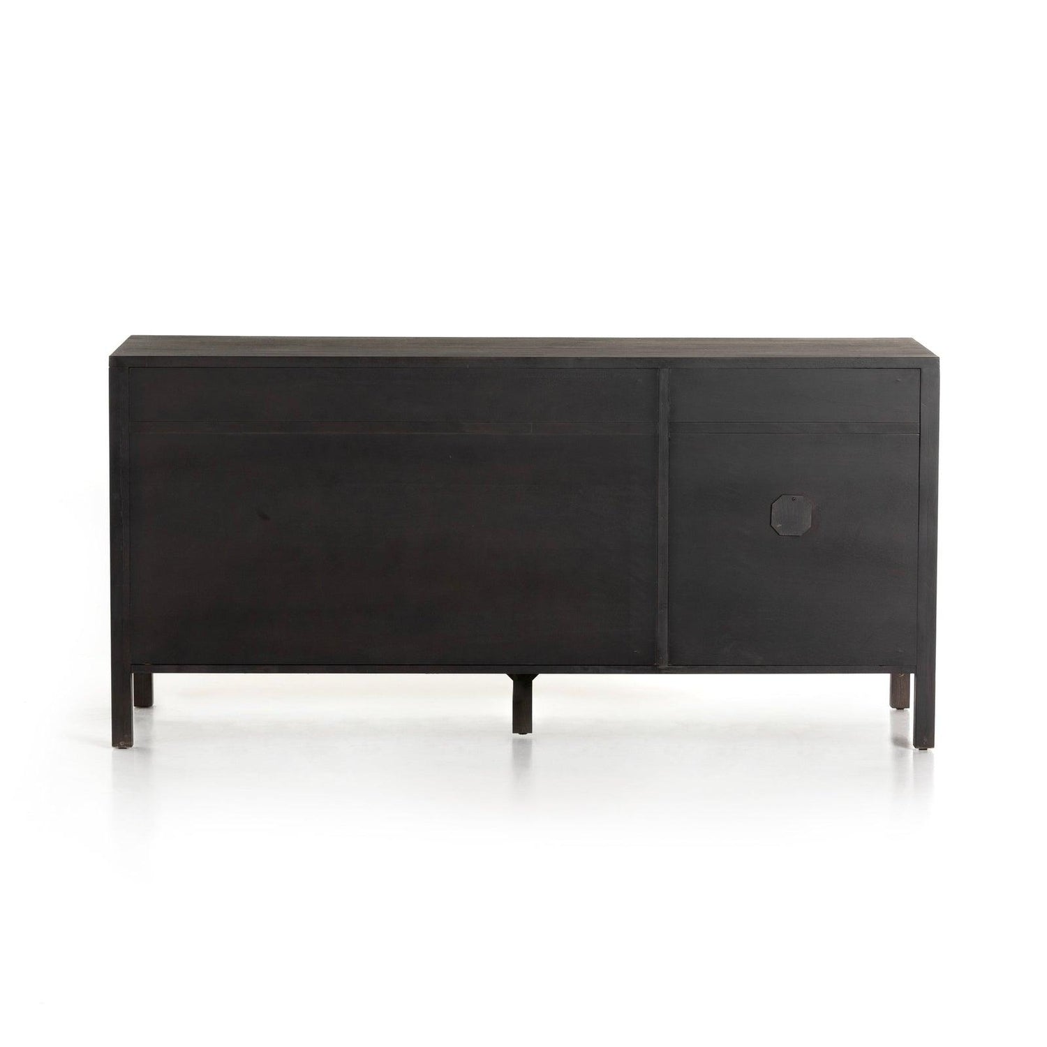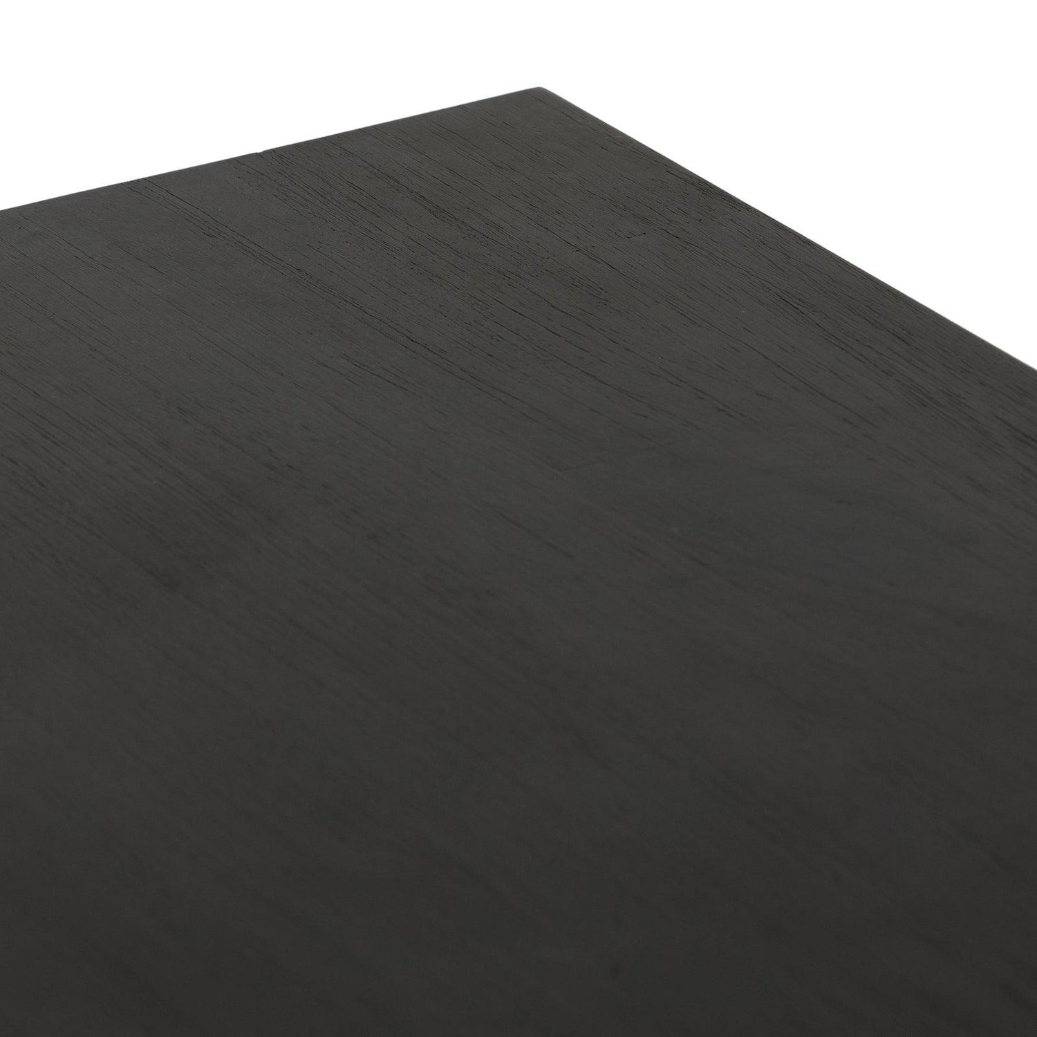 - Un archivador de líneas limpias en mango lavado en negro/mango lavado en blanco presenta frentes de cajones cubiertos de caña natural y estantes abiertos, que aportan almacenamiento, contraste y textura a la oficina moderna.