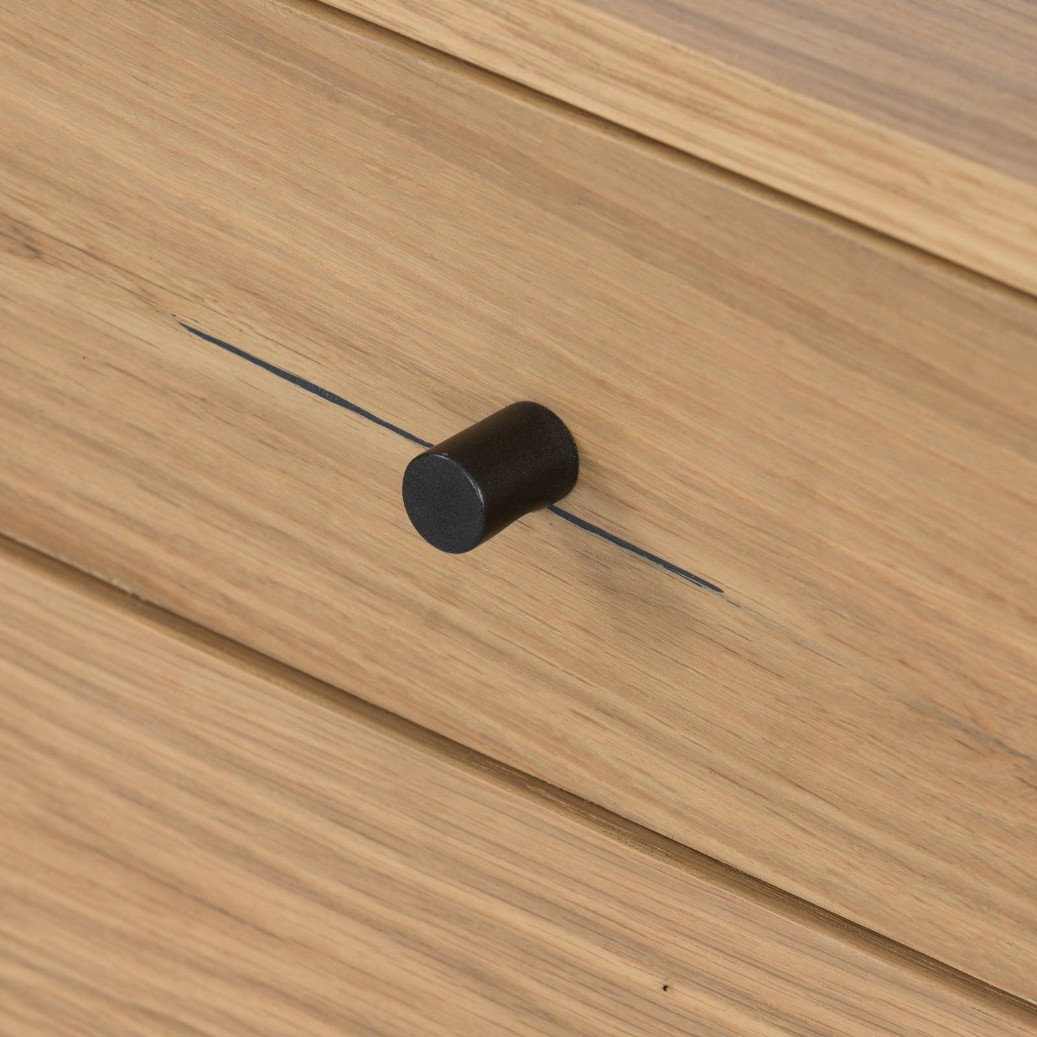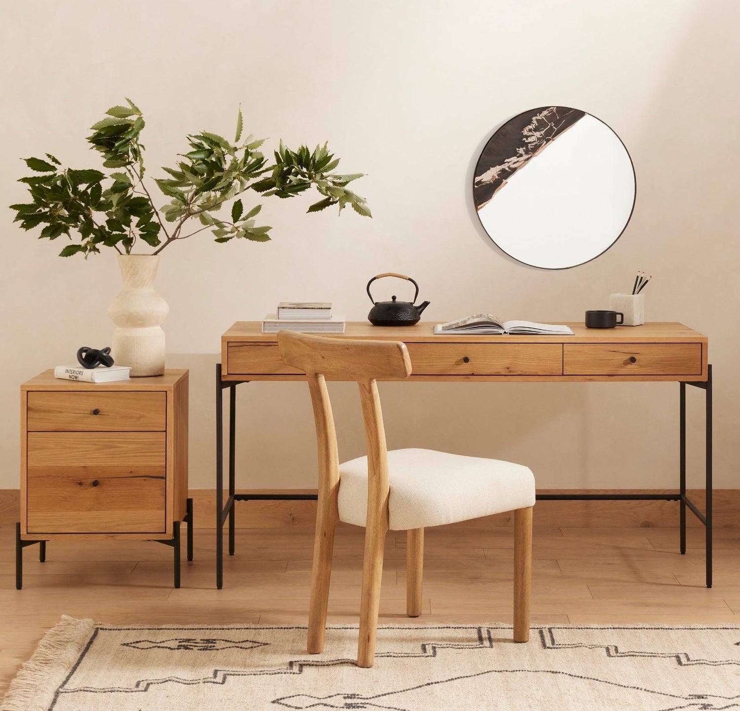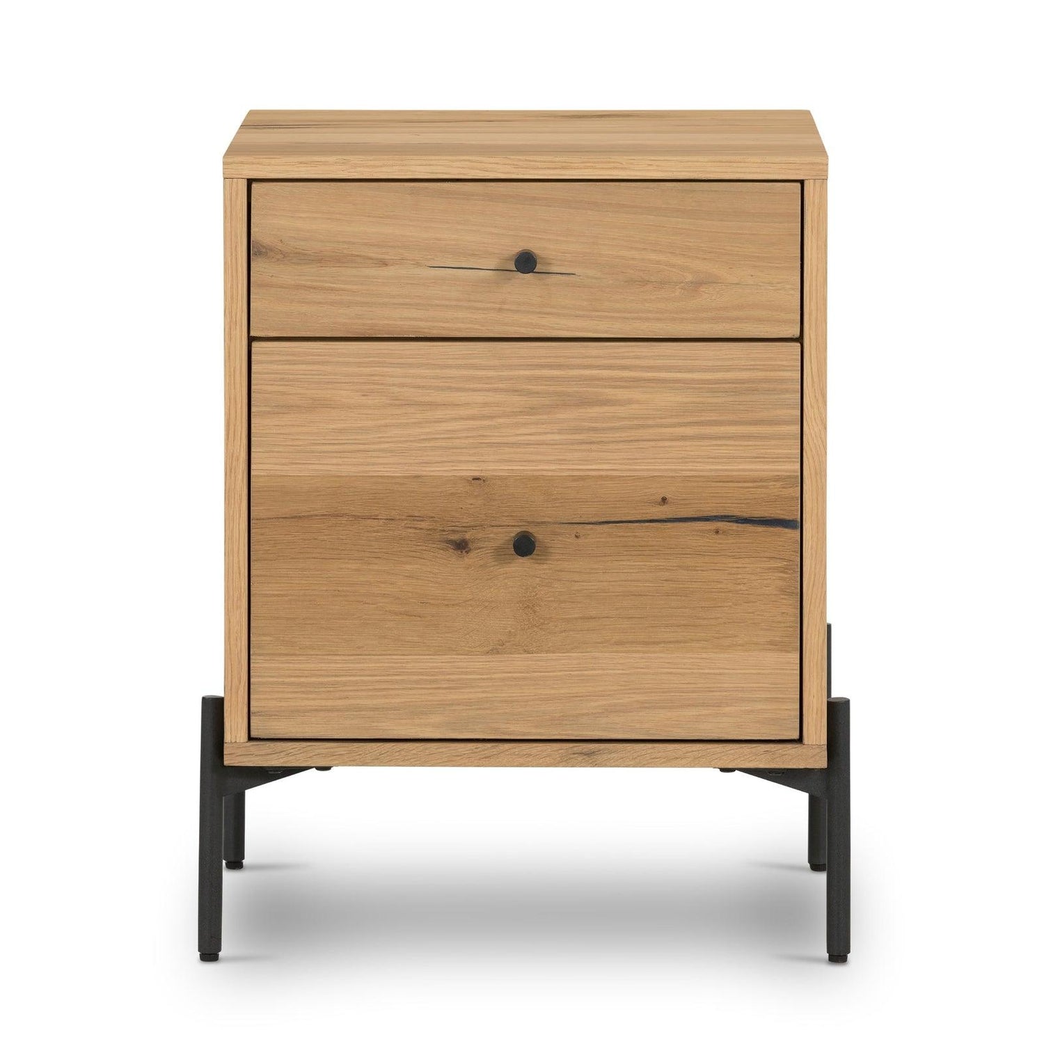 - El roble con acabado claro y la resina contrastante forman un archivador de líneas limpias con cajones dobles y herrajes con acabado metalizado, que aporta espacio de almacenamiento de archivos a la oficina moderna.