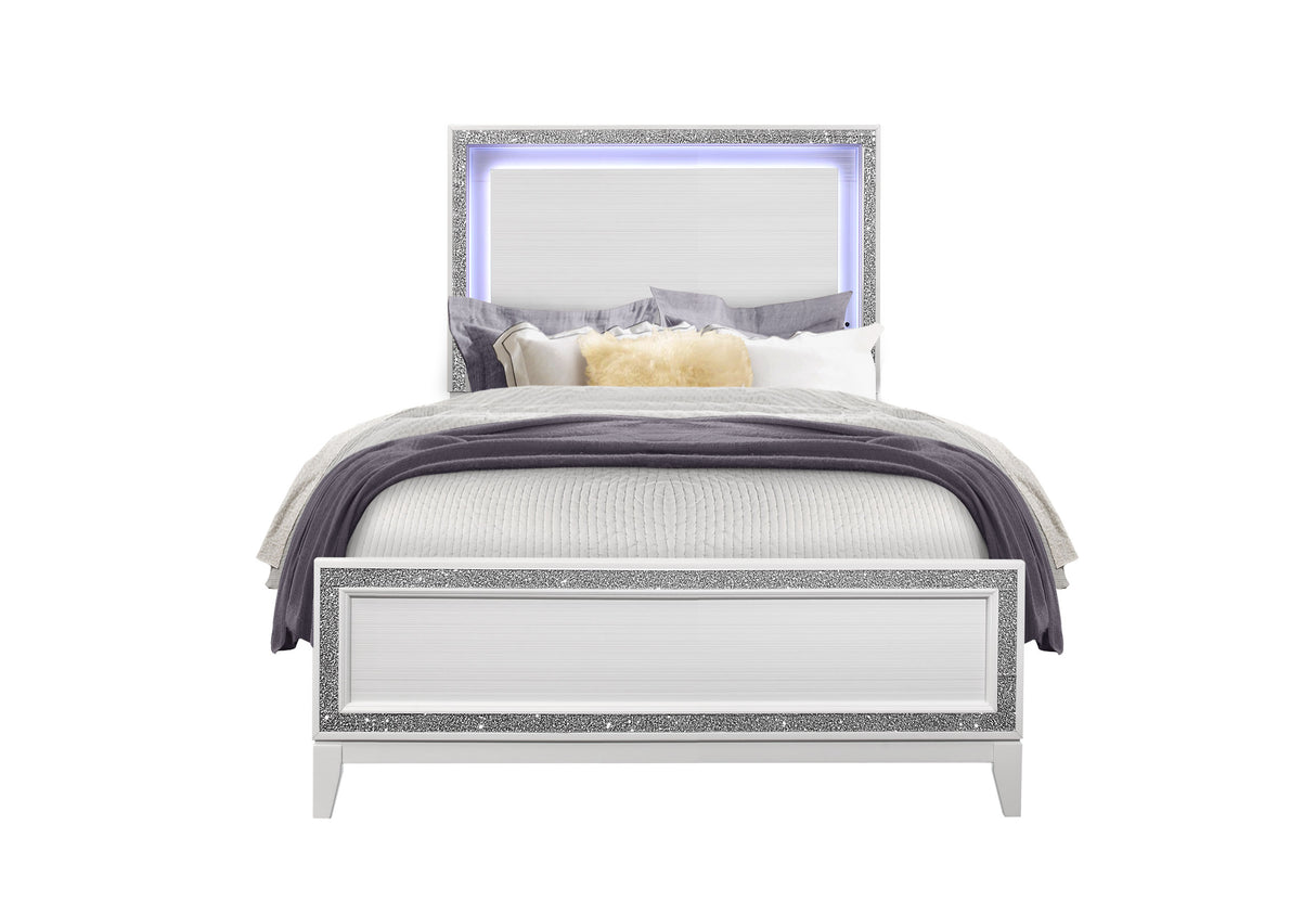 El dormitorio Lily fusiona dos mundos. Las líneas clásicas y los toques modernos crean un hermoso y glamuroso dormitorio de transición. El diseño de cristal triturado realza todas las piezas, junto con la iluminación LED que realza el cabecero. Este diseño no solo se utiliza como moldura decorativa, sino que también se extiende a los herrajes. El resultado final es un hermoso y glamuroso dormitorio.