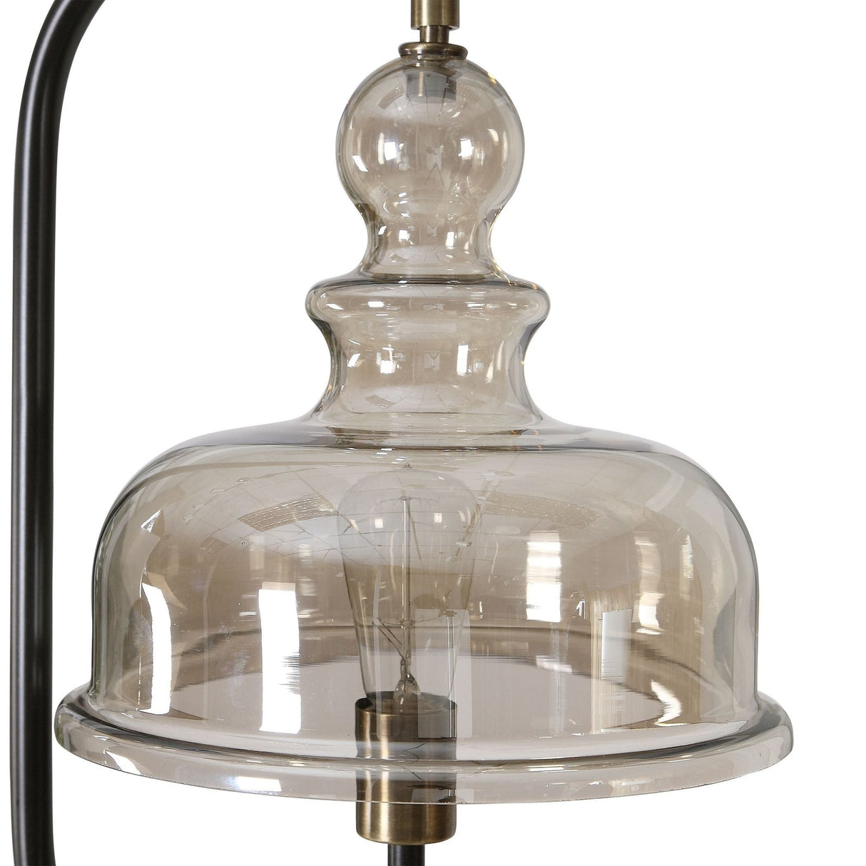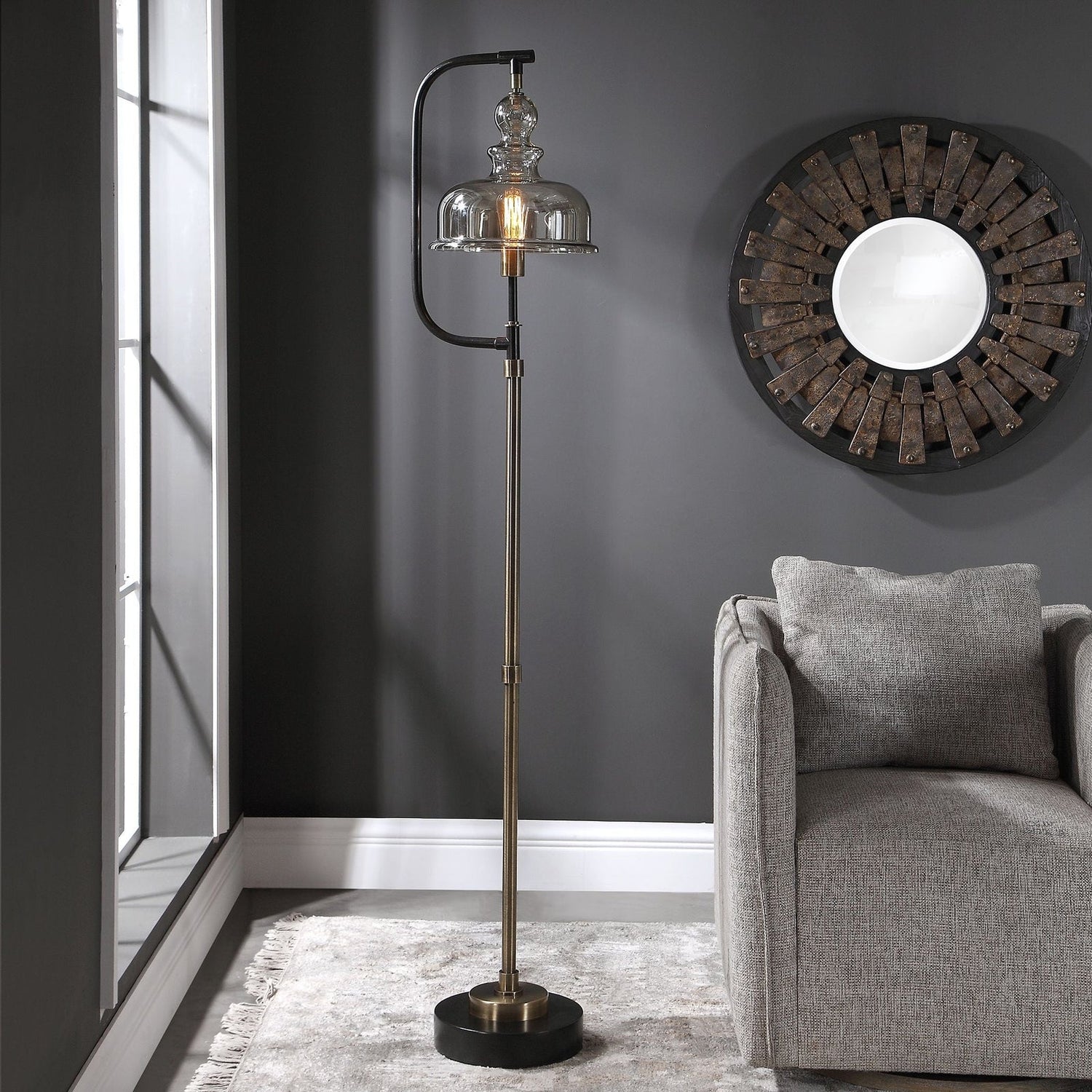 - Esta lámpara de pie presenta un diseño delicado con acabado en latón cepillado envejecido y negro envejecido oxidado.