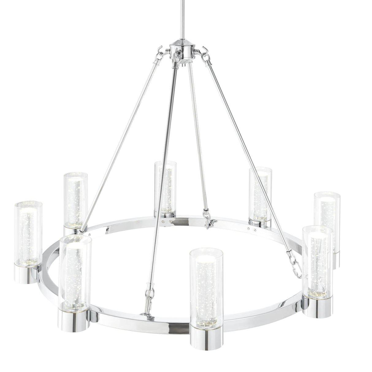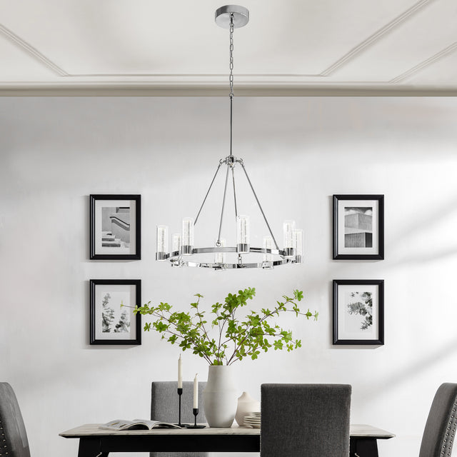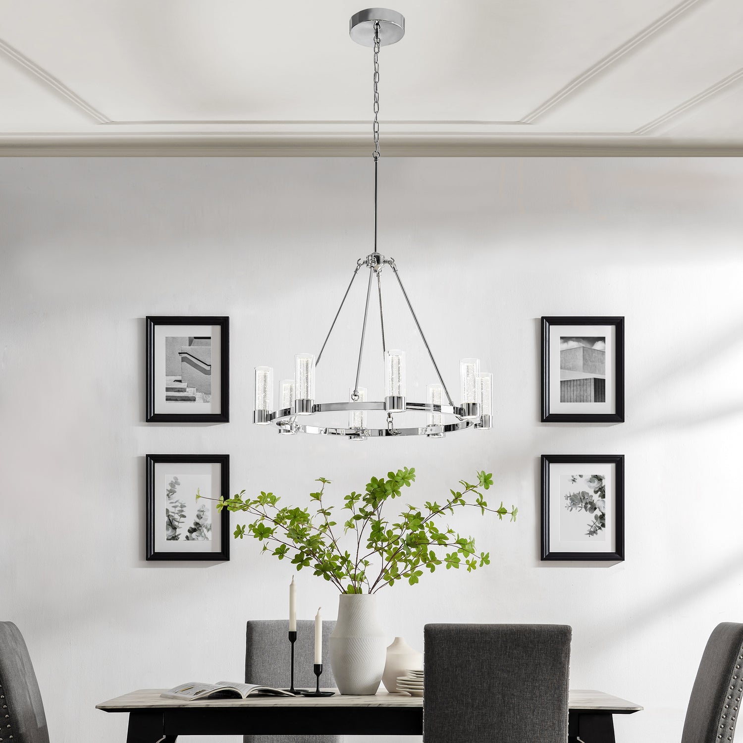 Esta impresionante lámpara de araña contemporánea cuenta con una base cromada y 8 cristales colgantes de 18 cm de alto. Cada cristal tiene dos bombillas para que la luz que emite ilumine todo el espacio. La lámpara cuelga de una cadena de 89 cm con una barra de 33 cm y se puede ajustar desde la cadena.