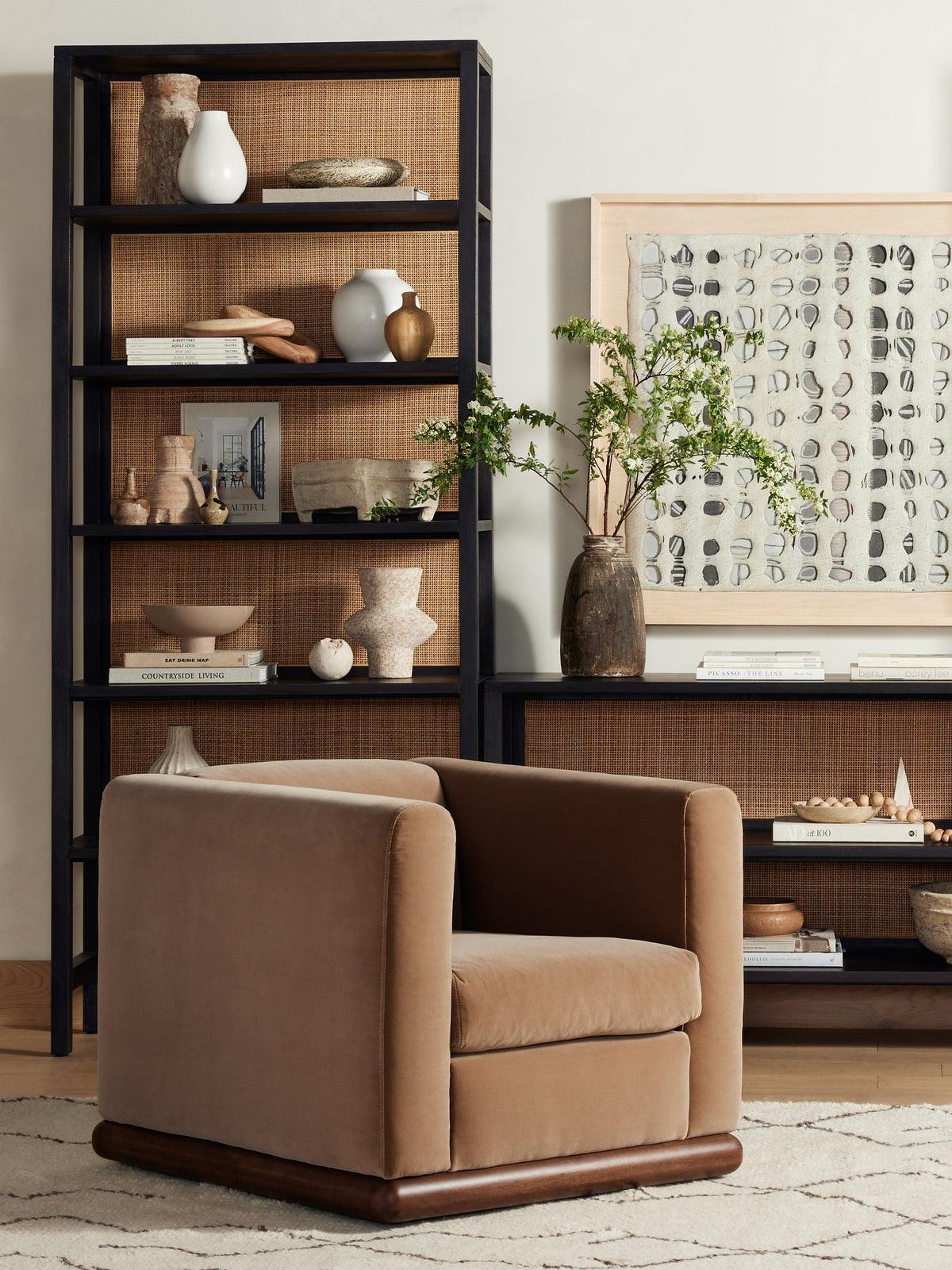 - El Art Déco se moderniza. Su tapizado aterciopelado en gris topo y su giro de 360 grados elevan esta elegante silla decorativa a un nuevo nivel.