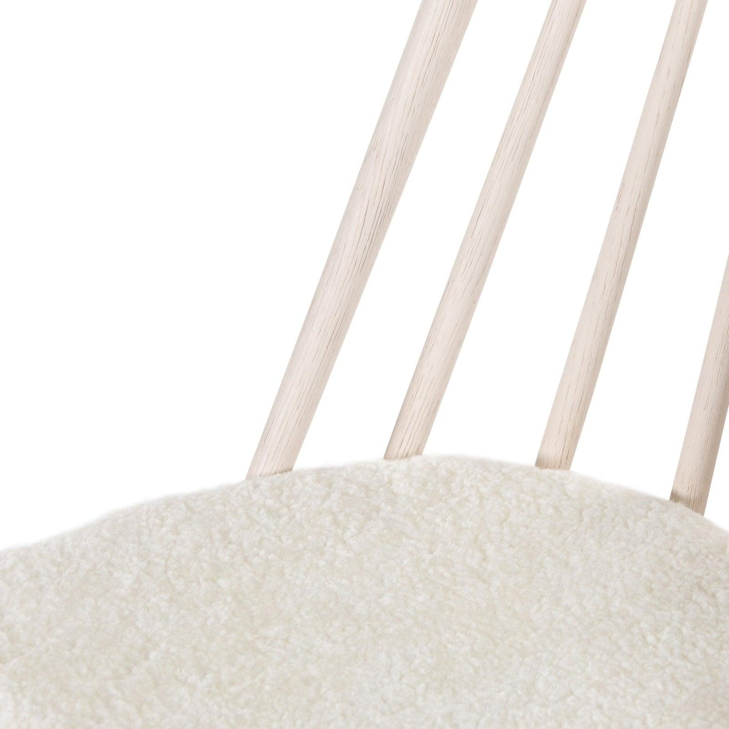- Mientras tanto, un cojín de asiento suelto de piel de oveja esquilada agrega comodidad a la mezcla.