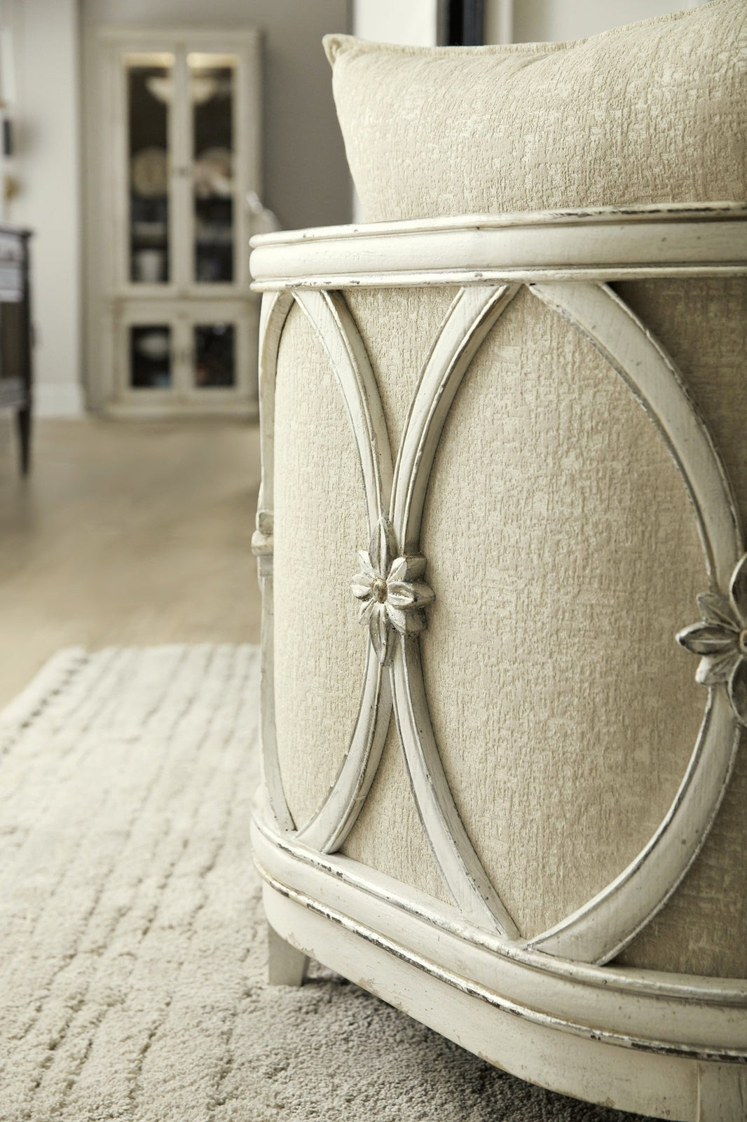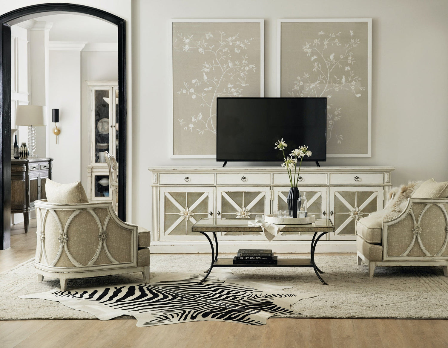 Como si fuera ropa de resort para el hogar, el sillón Sanctuary Mariette de Hooker Furniture combina una elegancia relajada con una artesanía refinada. Su escultural estructura de chapa de roble está adornada con óvalos entrelazados y encantadores medallones florales, todo ello bañado por el soñador acabado Chalet : una combinación de dos tonos de madera Latte claro y Blanc cremoso, con detalles en champán y ribetes plateados.