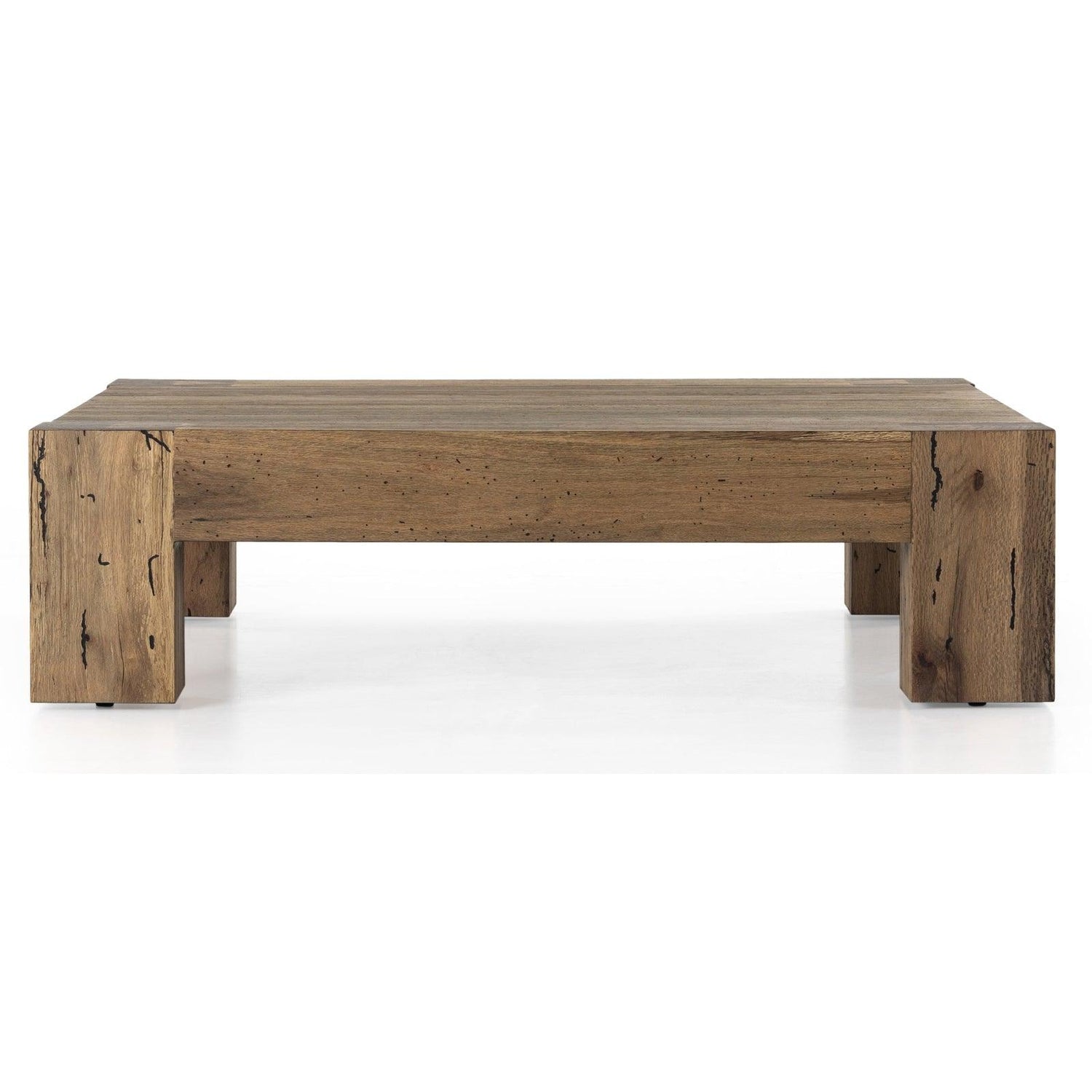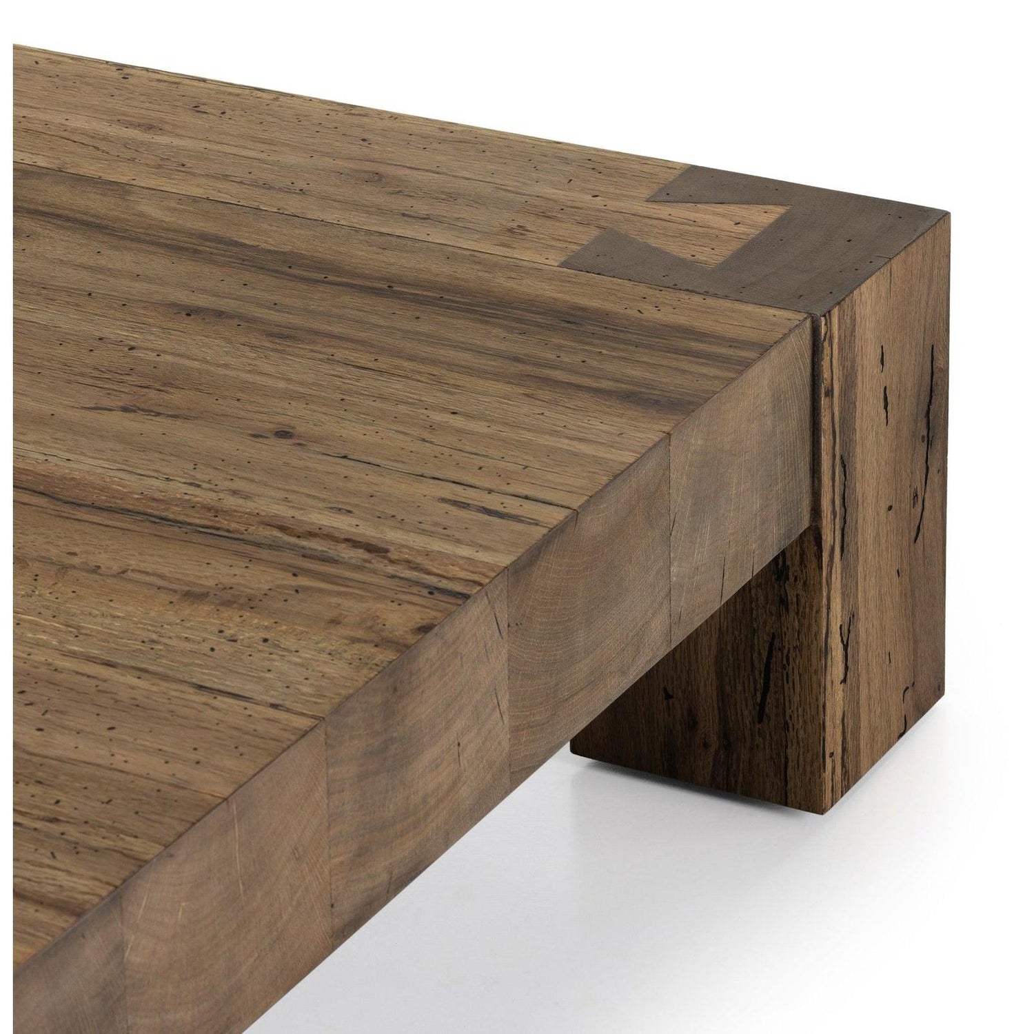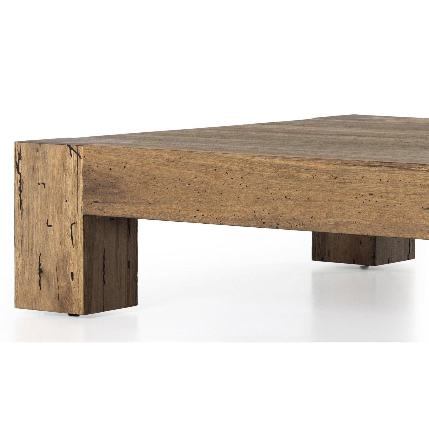 - Esta mesa de centro baja y de gran tamaño está hecha de chapa de roble de corte grueso con un acabado rústico falso que imita el ajenjo y presenta patas cuadradas gruesas y detalles de unión de cola de milano.