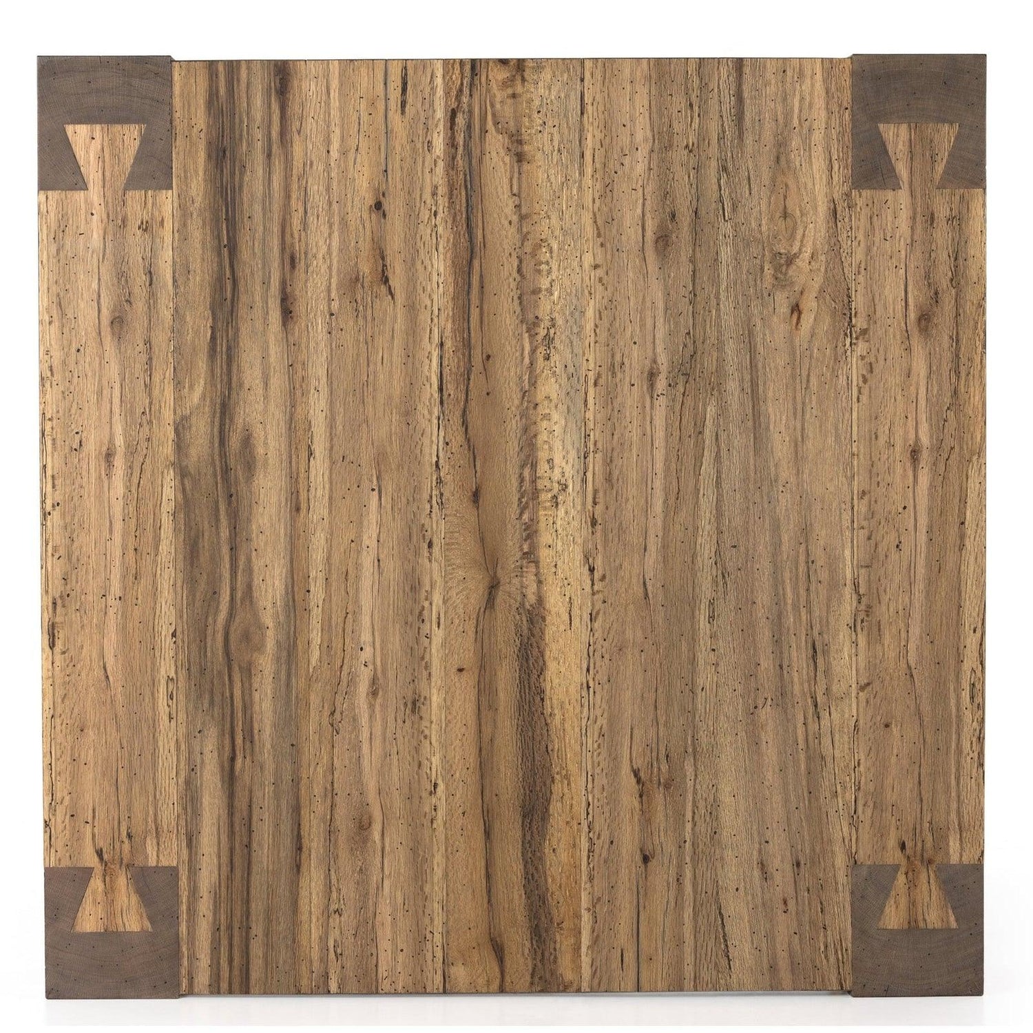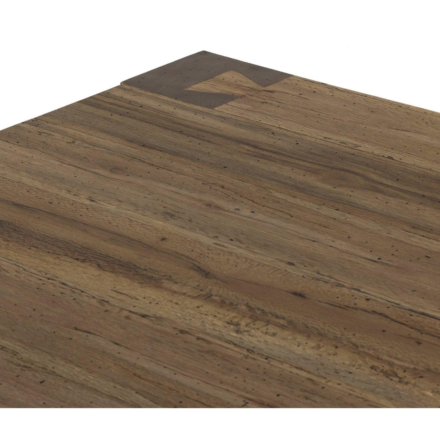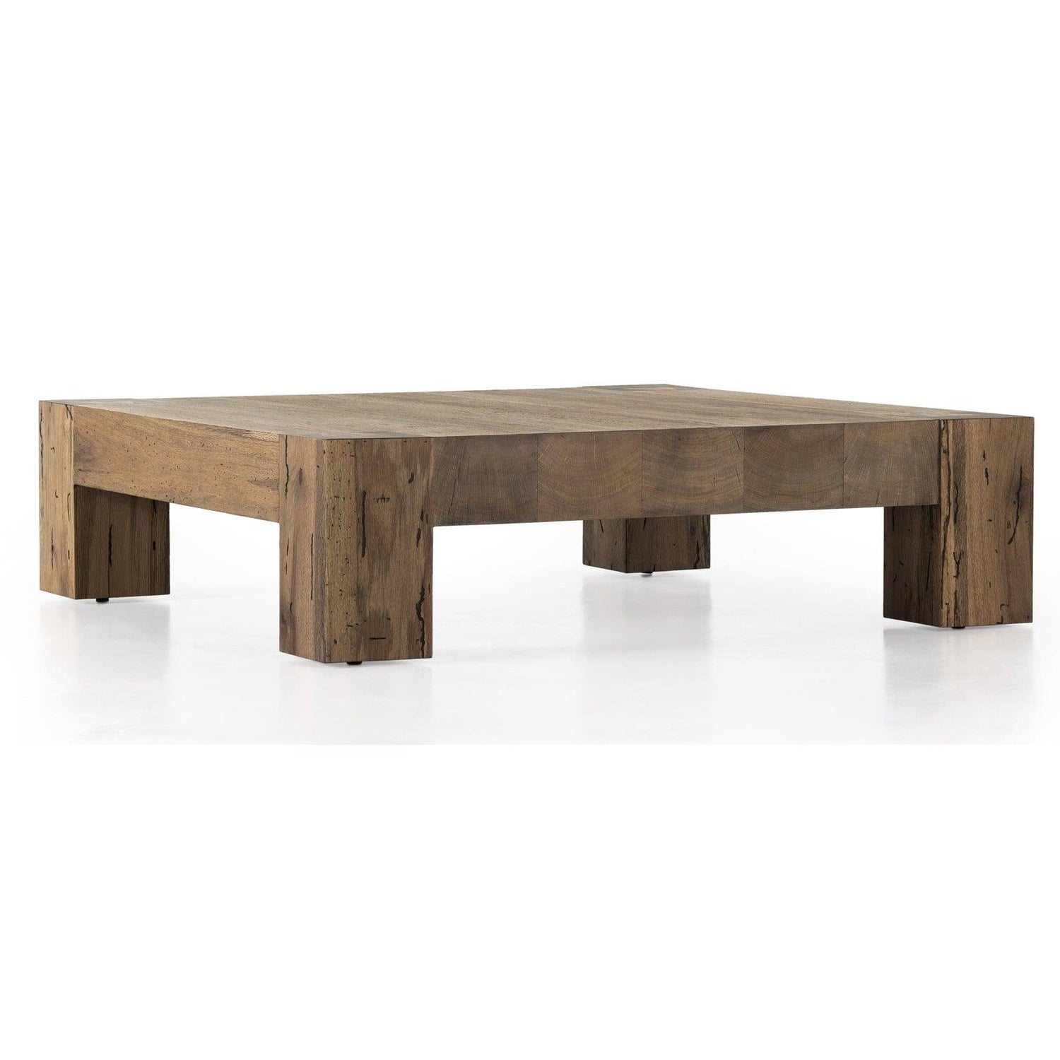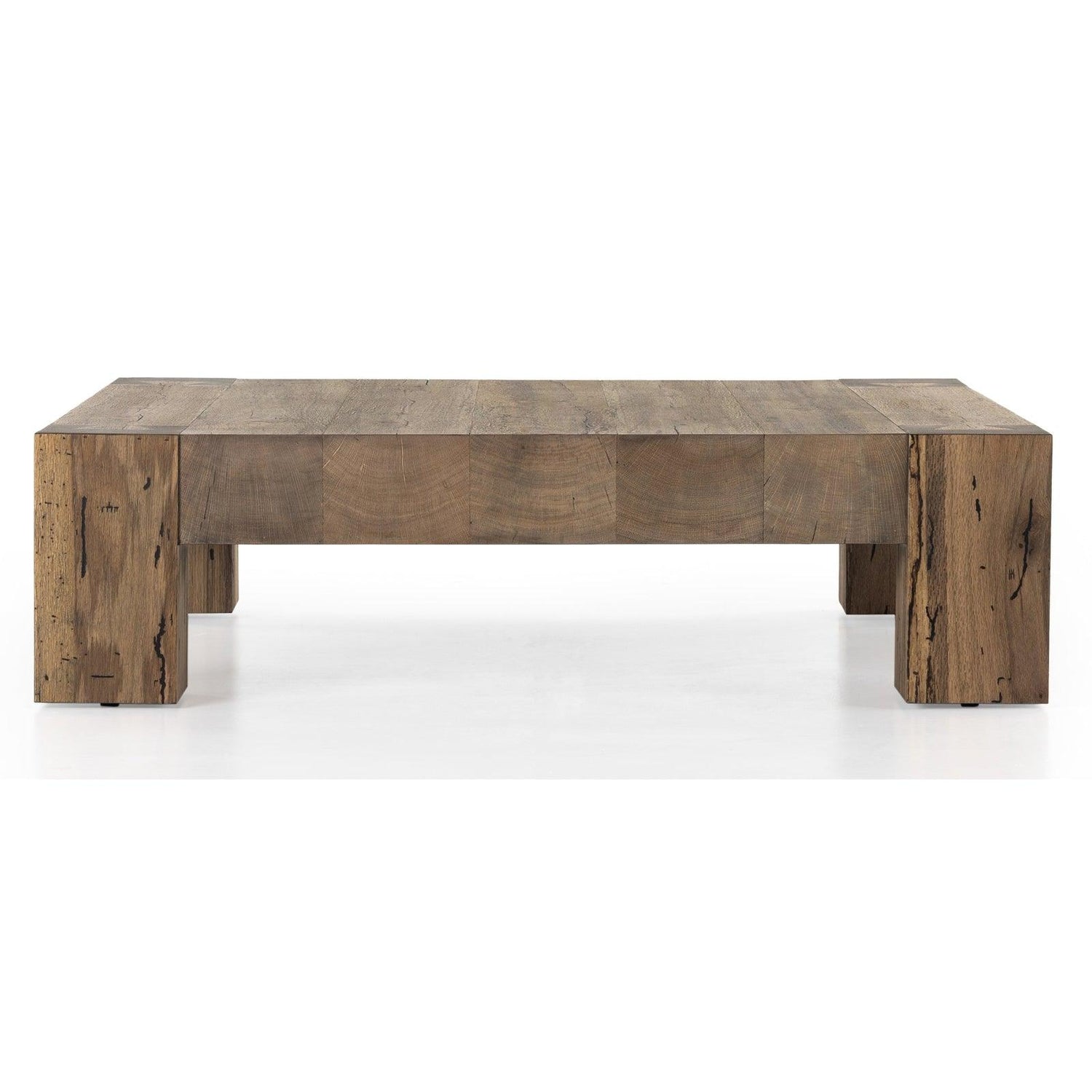 - Esta mesa de centro baja y de gran tamaño está hecha de chapa de roble de corte grueso con un acabado rústico falso que imita el ajenjo y presenta patas cuadradas gruesas y detalles de unión de cola de milano.