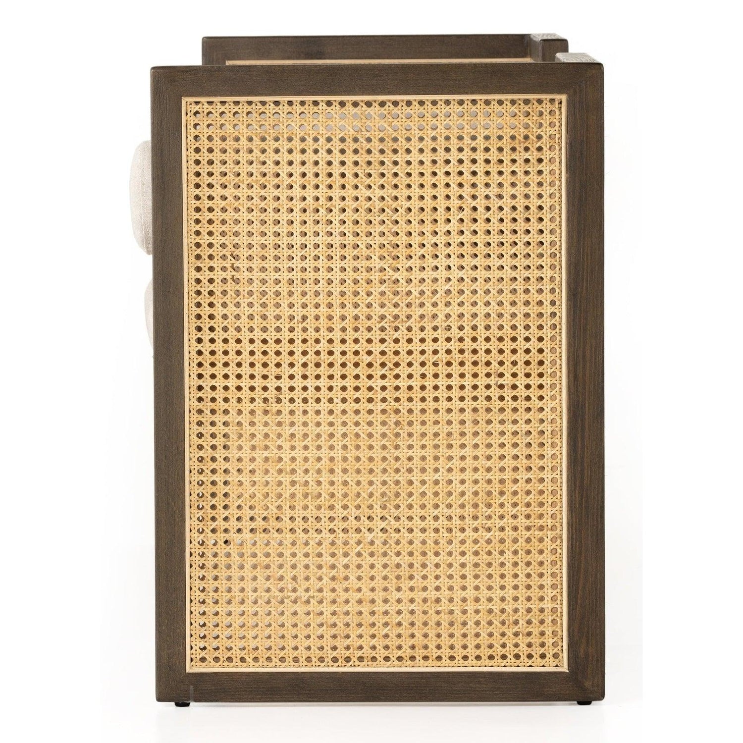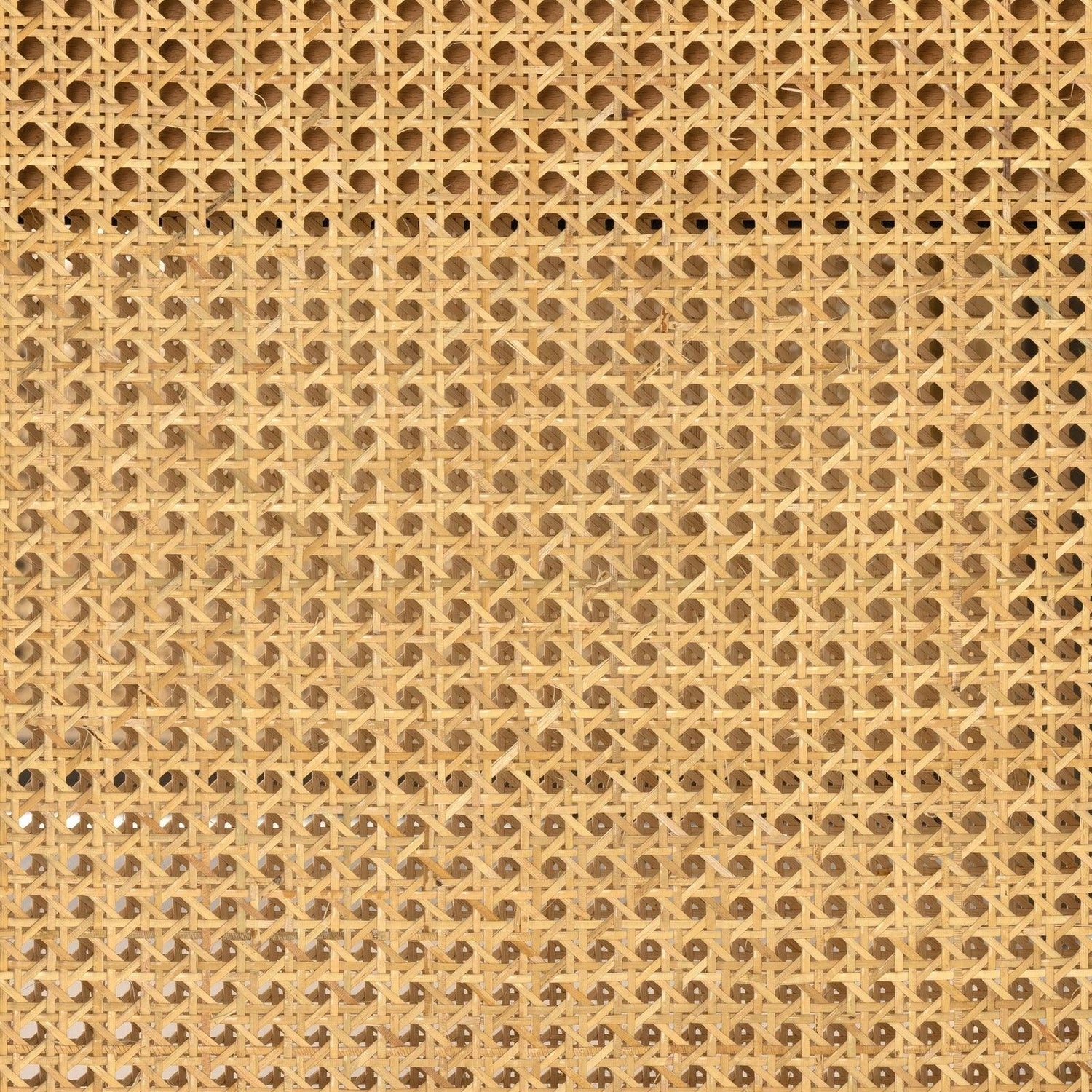 - La madera maciza de haya forma un marco angular para paneles de caña natural y asientos de mezcla de lino estilo flotante.