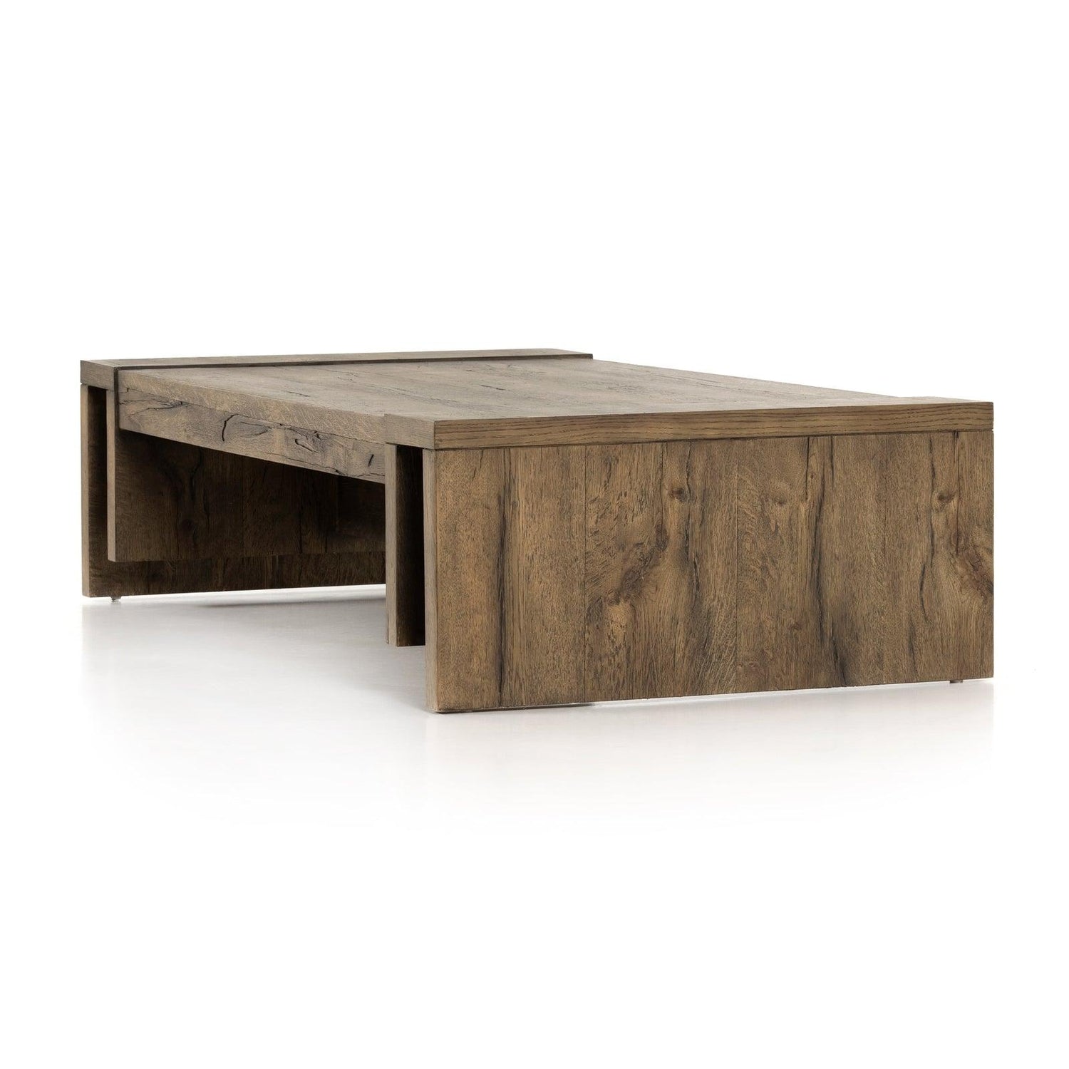 • Terminada en un marrón rústico intenso, esta mesa de centro doble estilo altar de chapa de roble gruesa seleccionada a mano presenta nudos y vetas visibles para una apariencia bellamente recuperada.