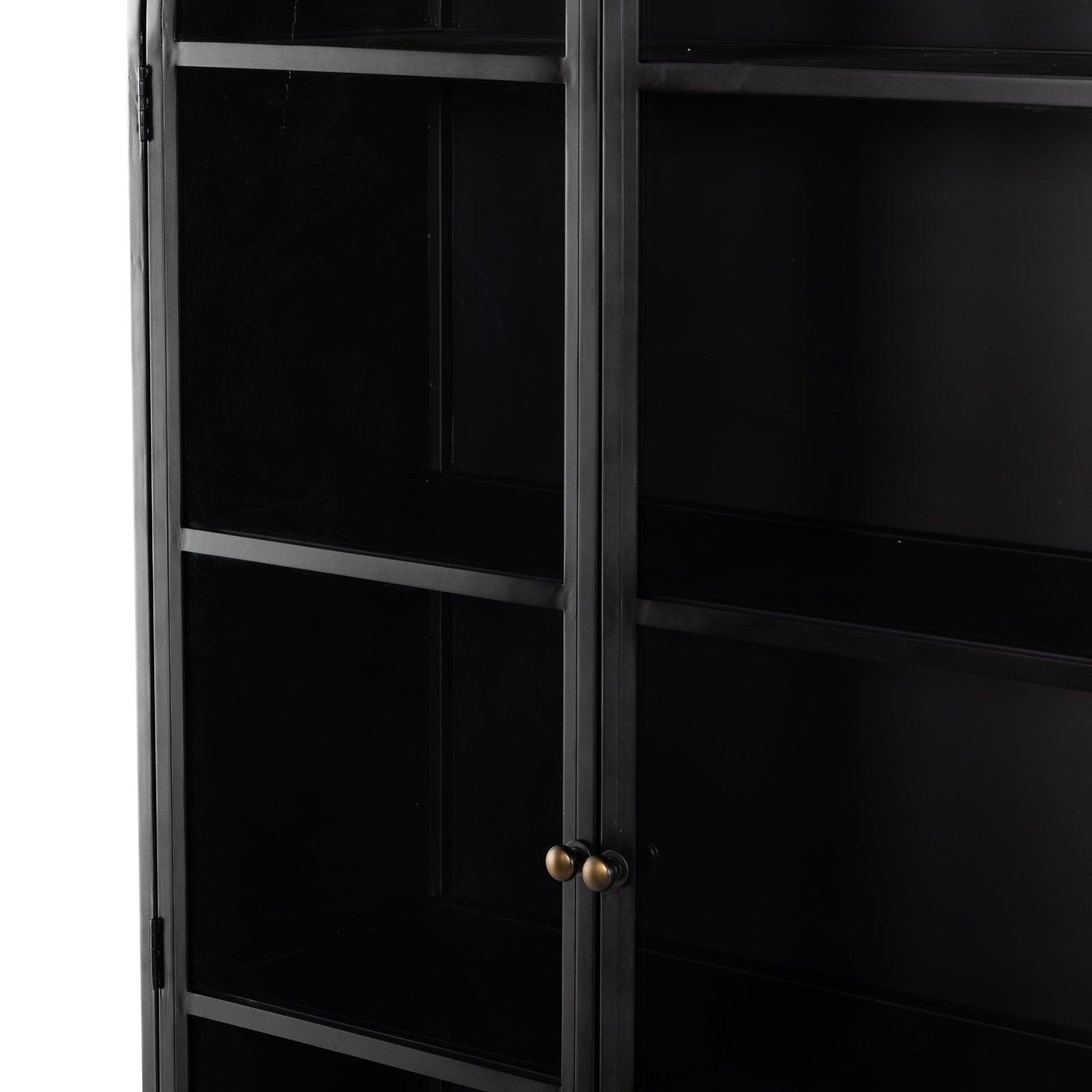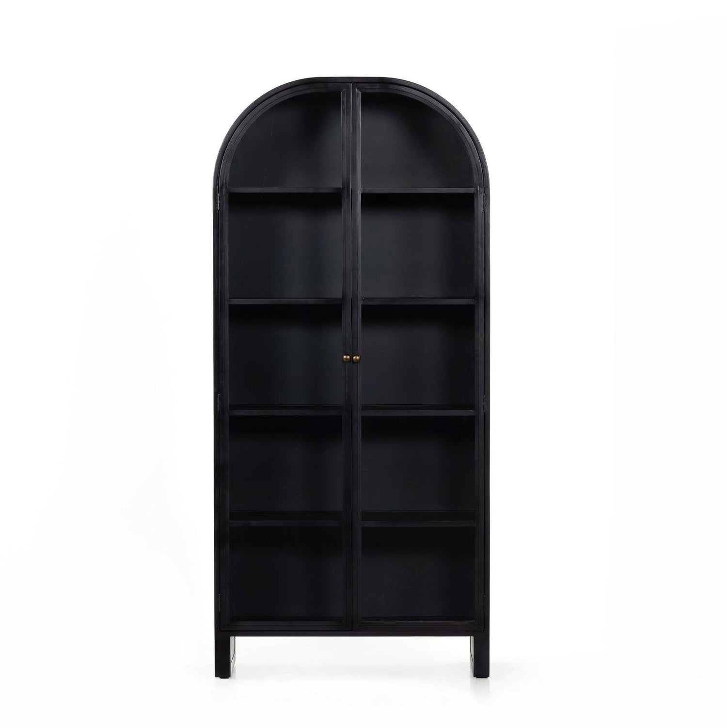 - Fabricados en hierro con acabado negro, estos gabinetes bellamente arqueados cuentan con puertas con frente de vidrio, ideales para guardar y exhibir libros favoritos, fotos, recuerdos y más.