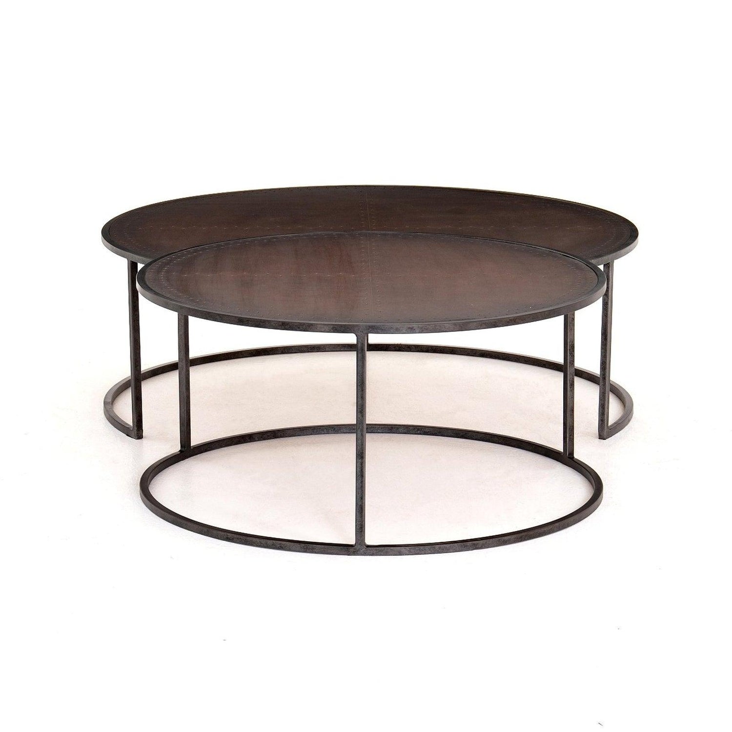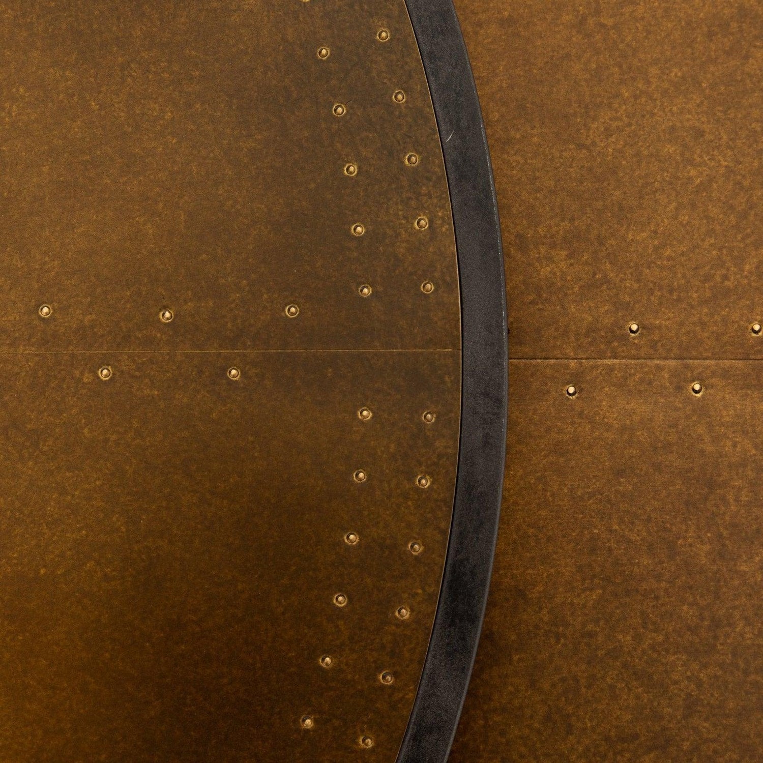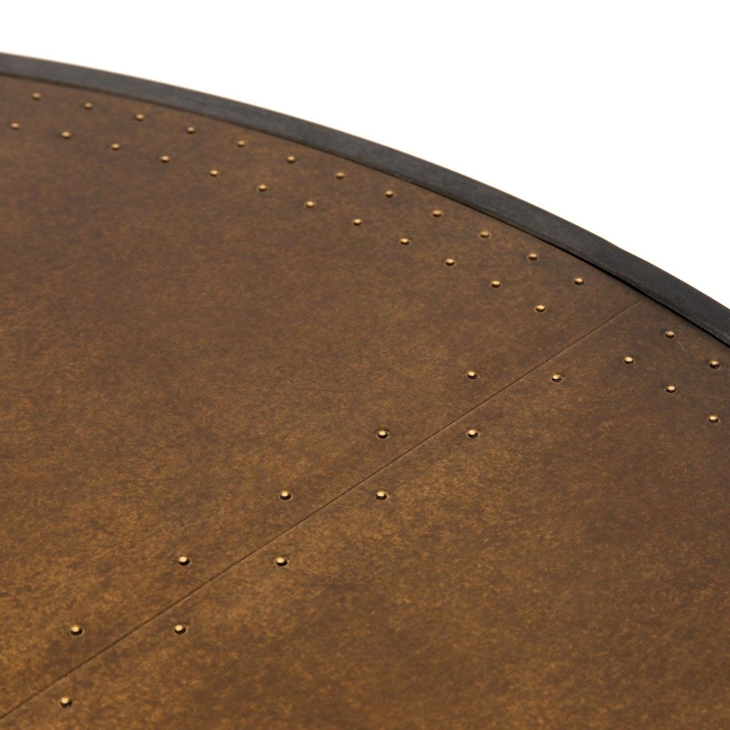 - Las delgadas bases negras sostienen tableros de mesa redondeados, revestidos de latón envejecido, con filas dobles de cabezas de clavos en contraste.