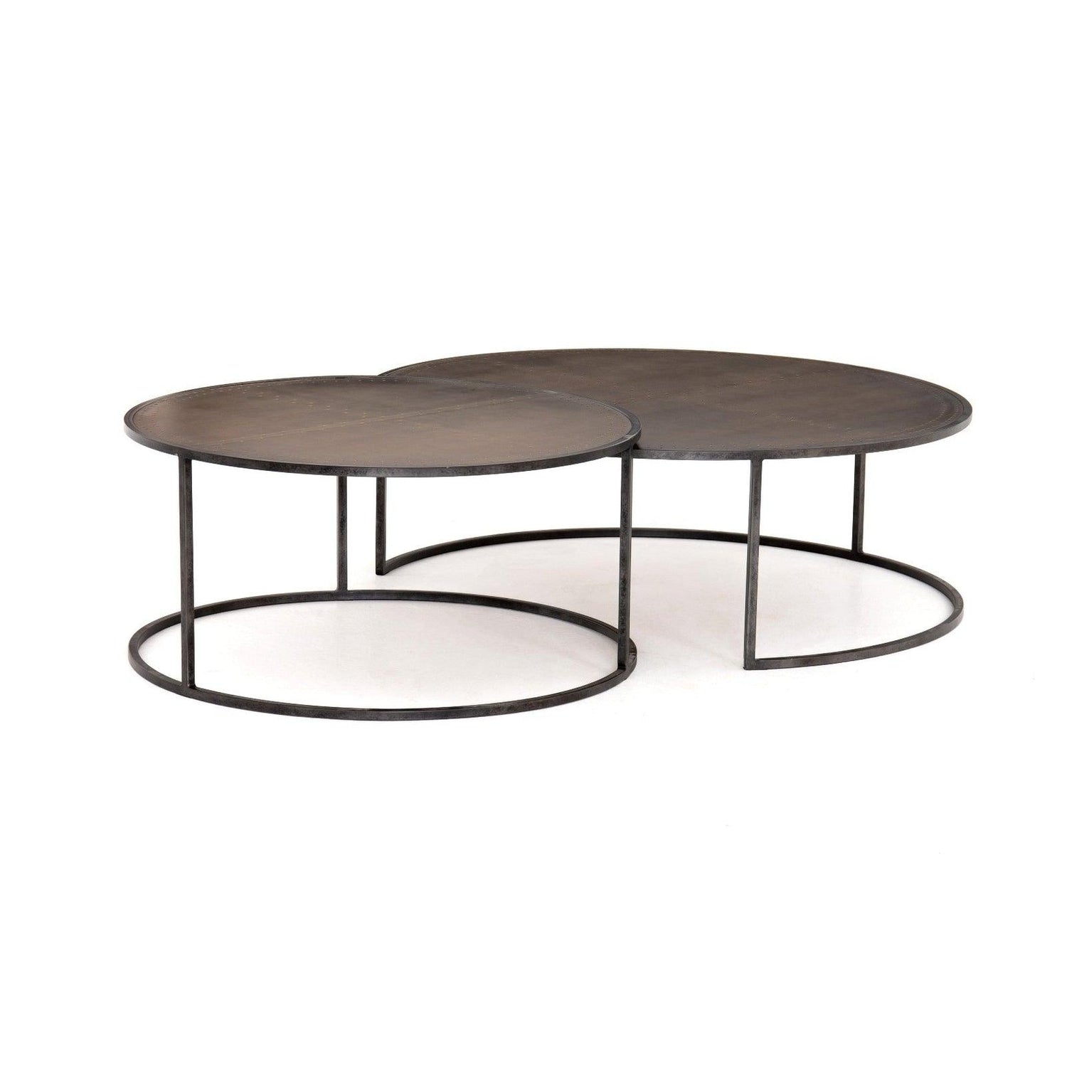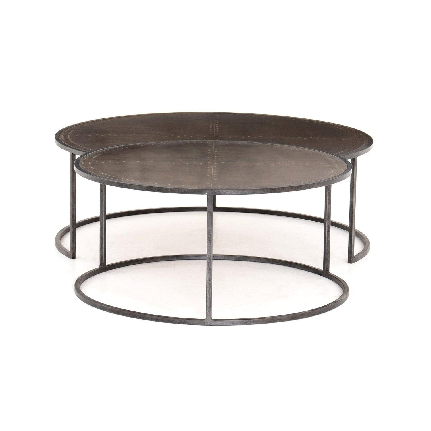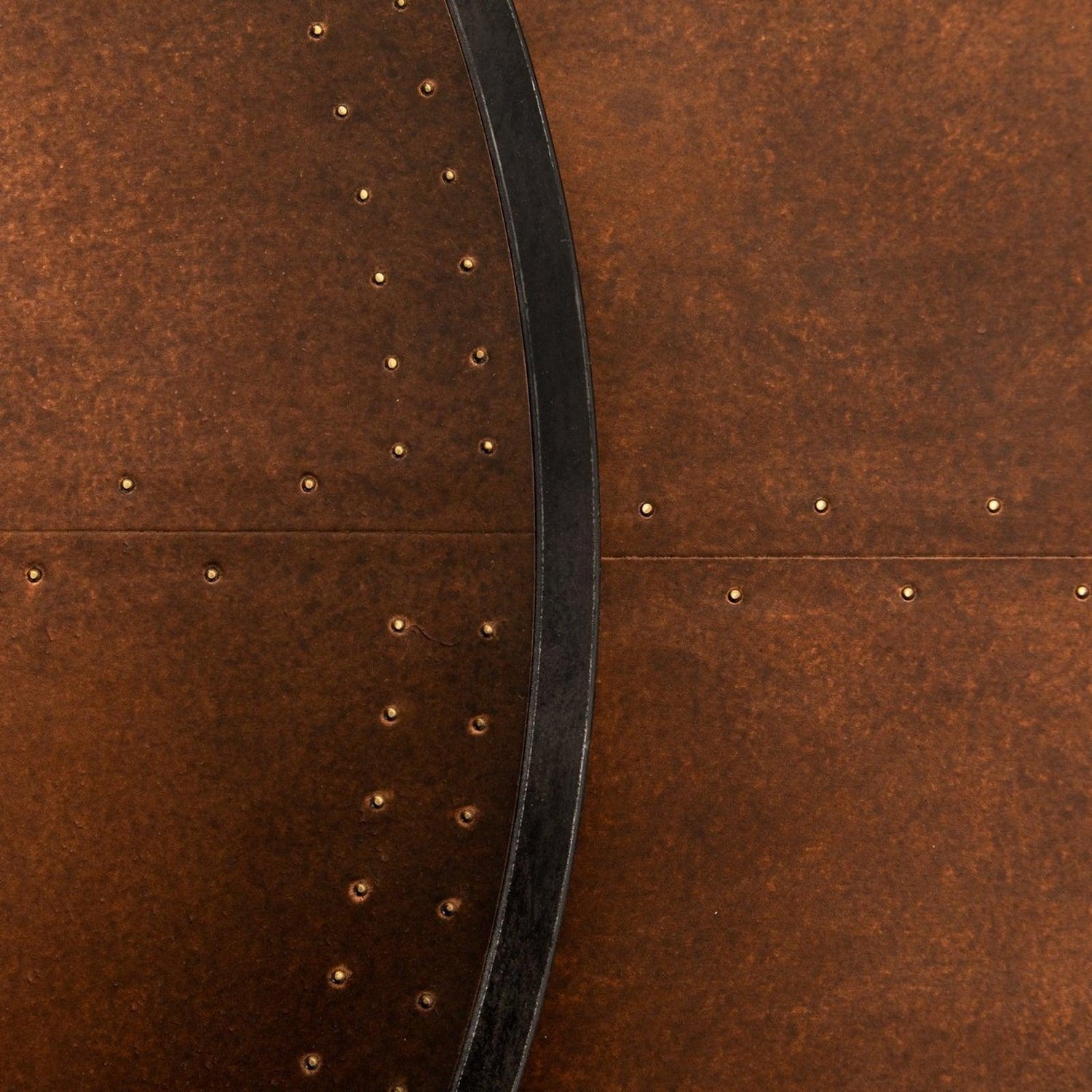 - Las delgadas bases negras sostienen tableros de mesa redondeados, revestidos de latón envejecido, con filas dobles de cabezas de clavos en contraste.