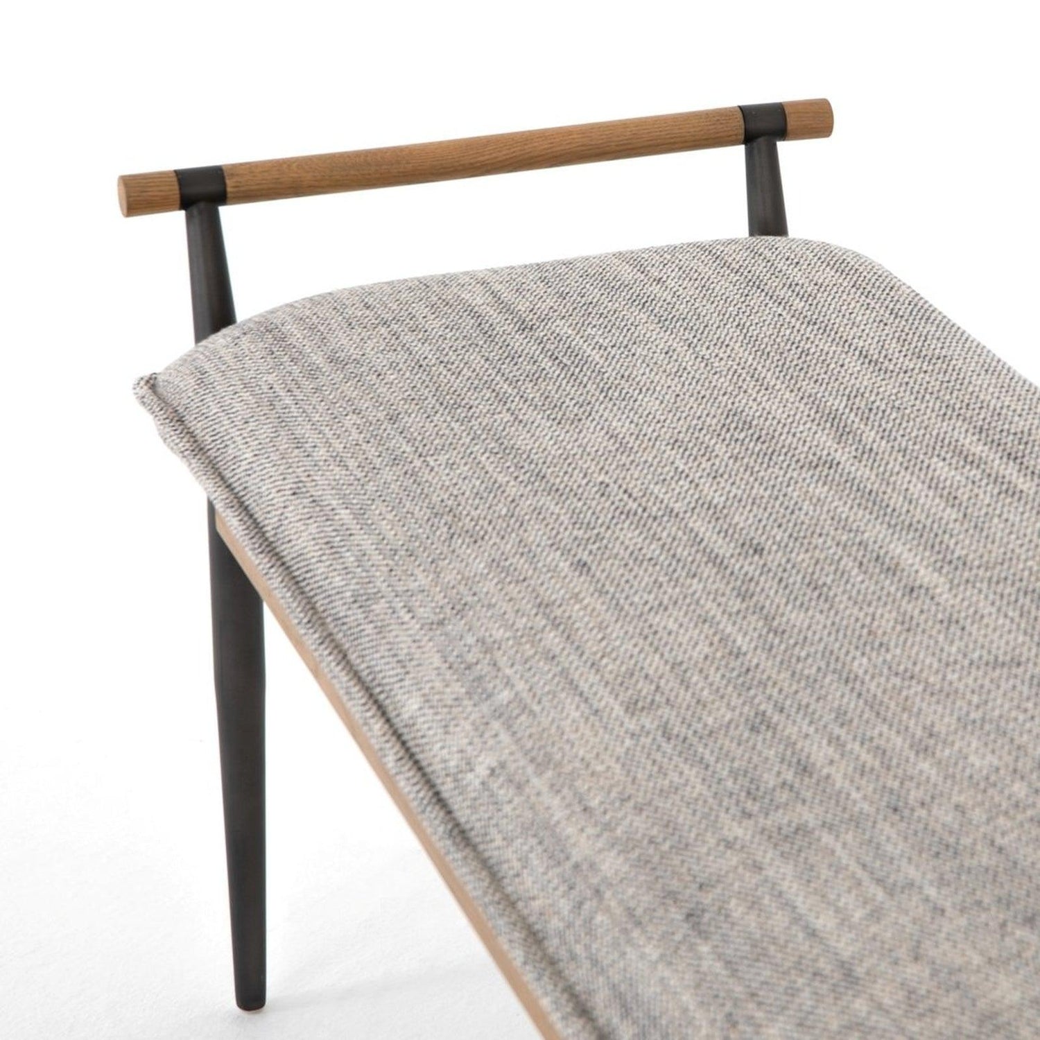 - Estructura de roble macizo, patas de acero con acabado negro y asientos suaves y texturizados en un negro moteado.