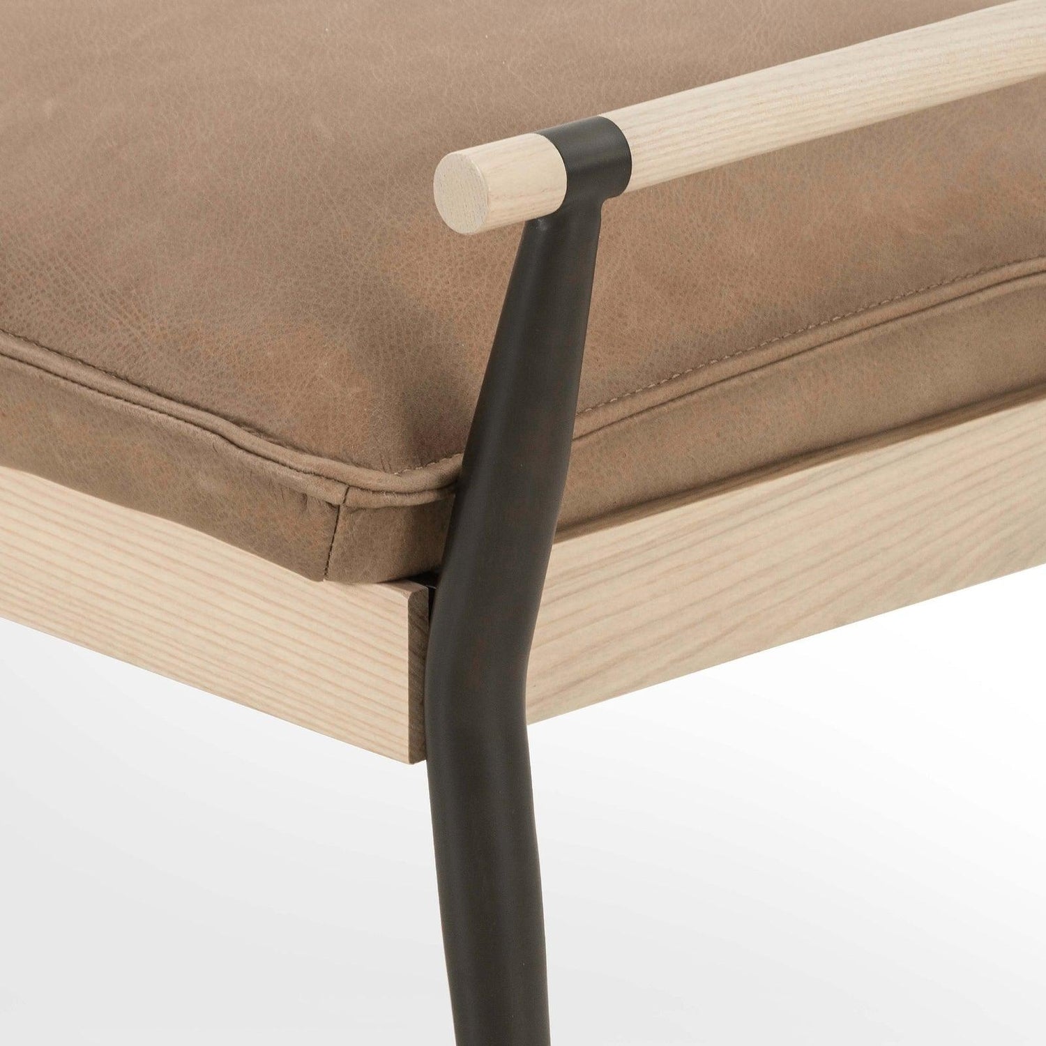 - Estructura de fresno macizo encalado, patas de acero con acabado negro y asientos suaves y elegantes de cuero de grano superior de color tostado.