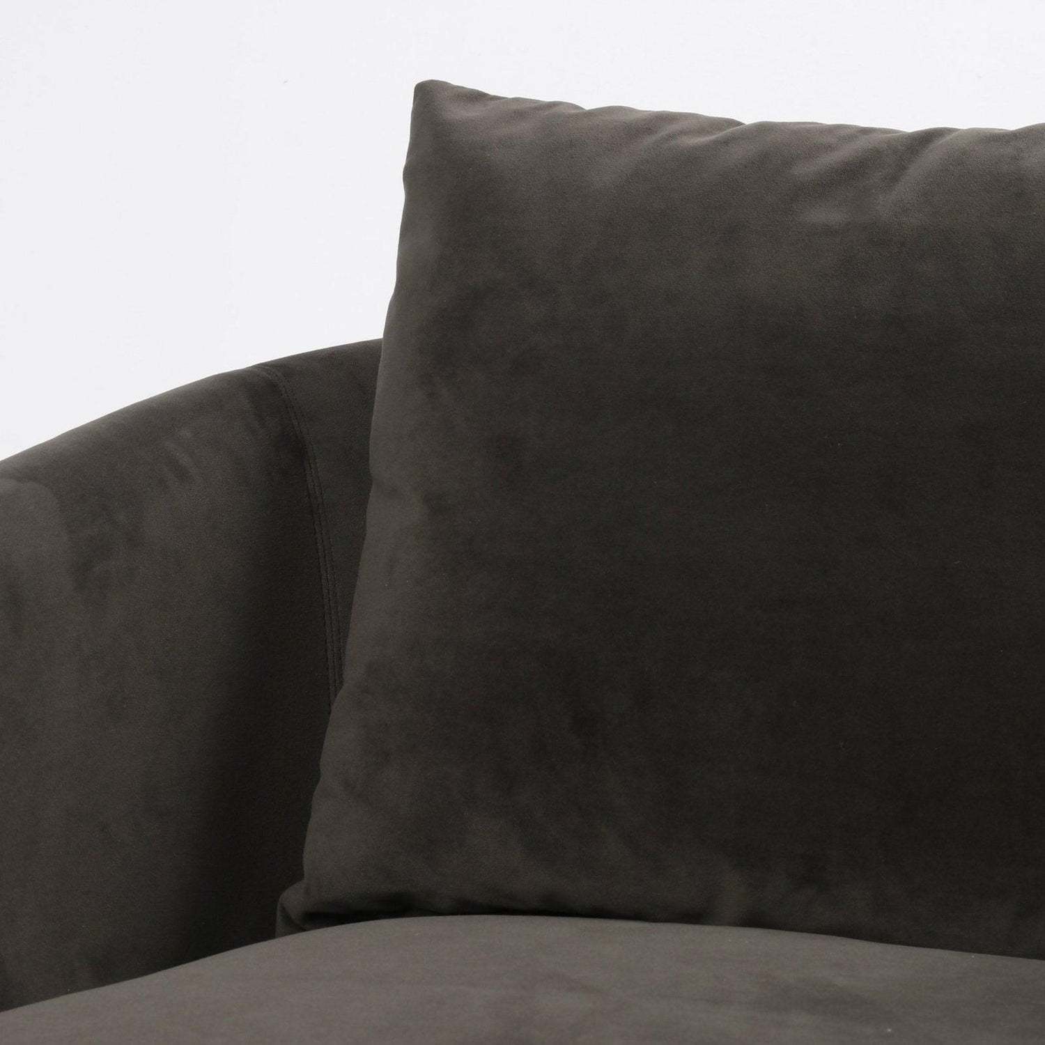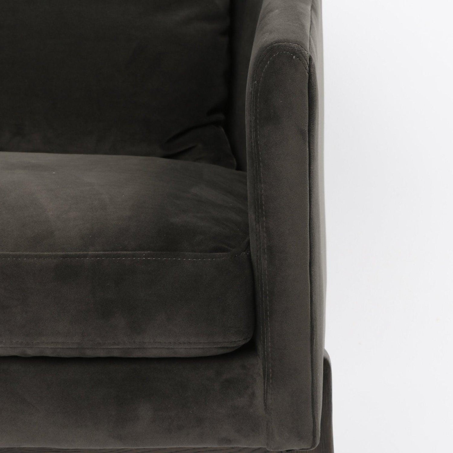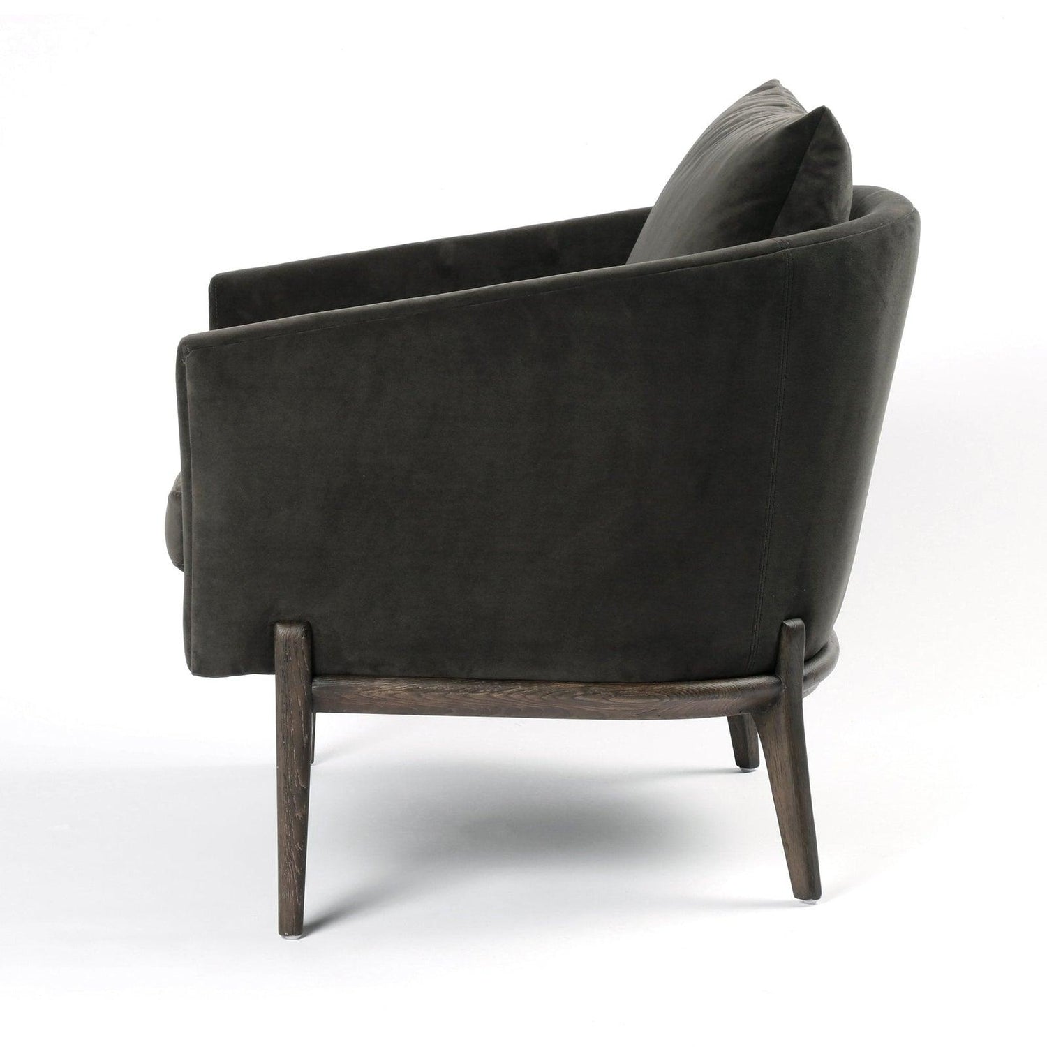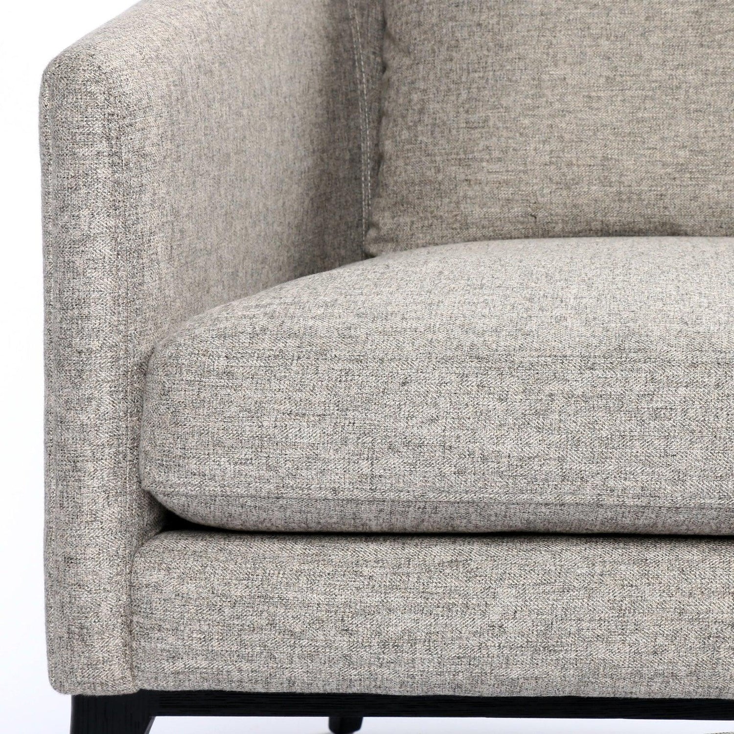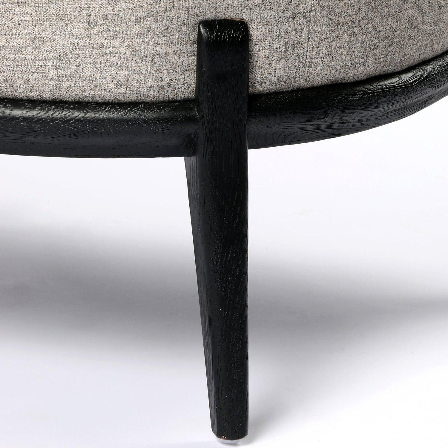 - Una estructura delgada y esbelta de roble negro sostiene asientos en tonos grises neutros con un sutil patrón en espiga.
