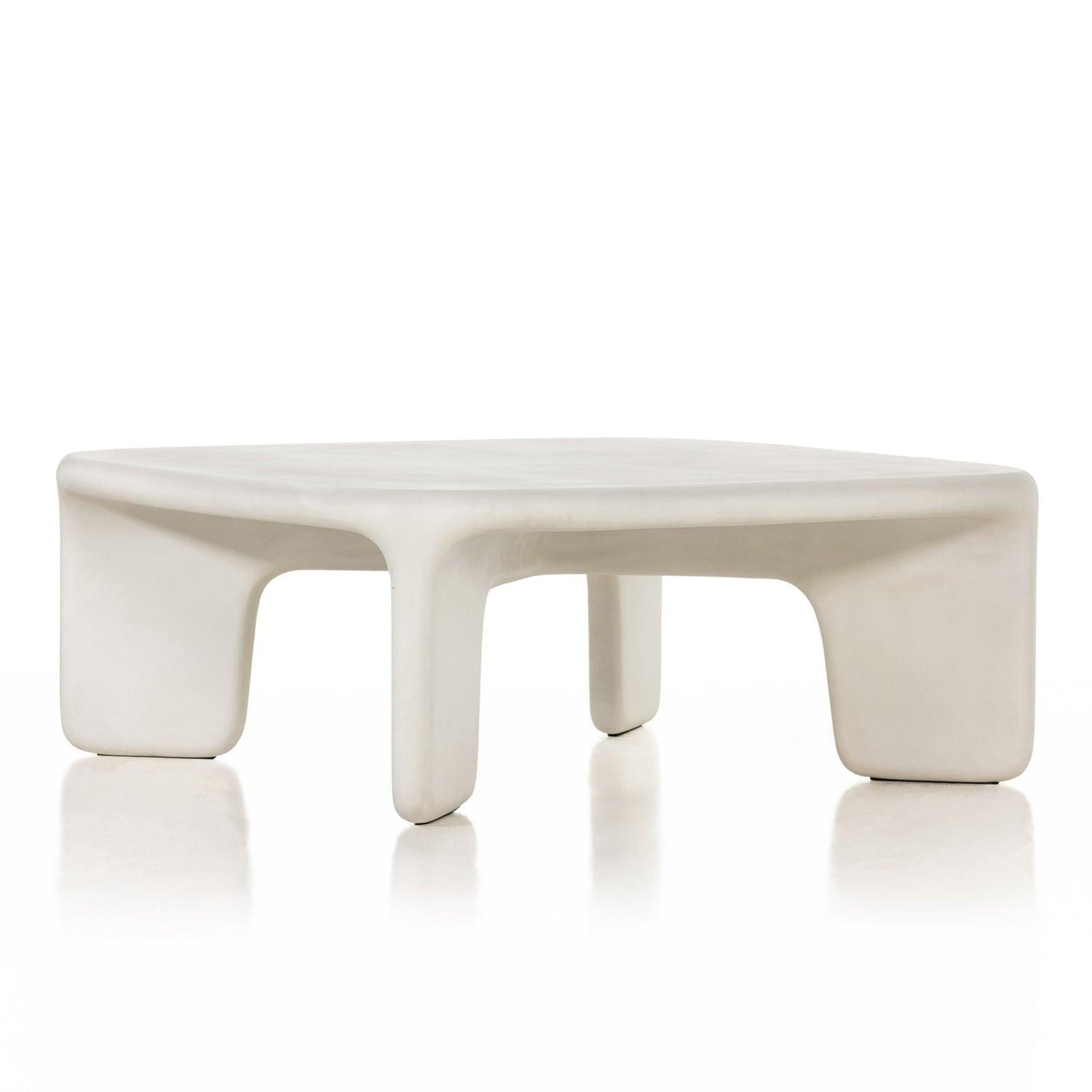 • Ambiente de adobe. Fabricada íntegramente en hormigón fundido con acabado blanco, sus proporciones suaves y robustas aportan profundidad a esta mesa de centro voluminosa y de esculpido único.
