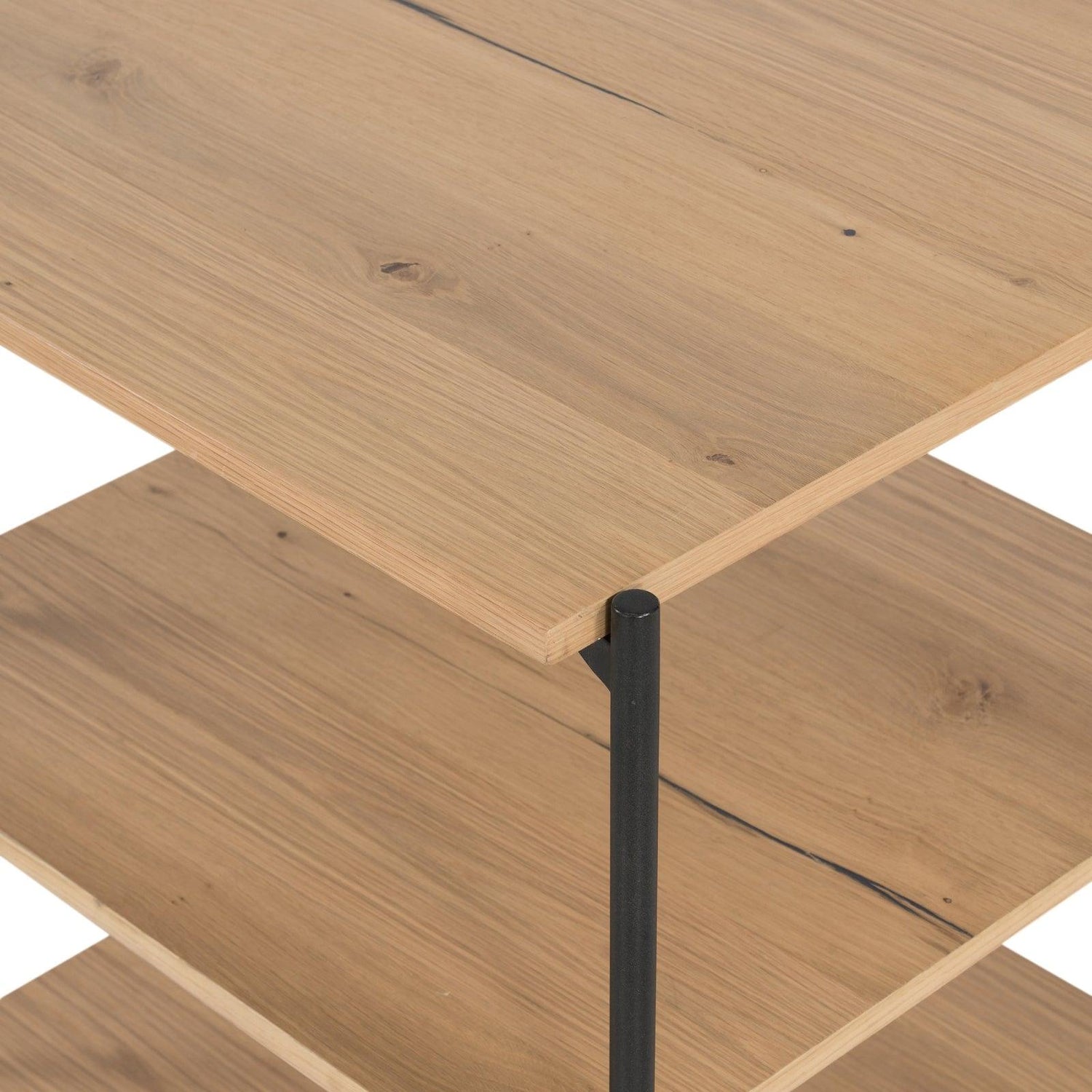 - Enmarcado por un hierro delgado con acabado en bronce oscuro, roble con acabado claro y resina contrastante, forma un estante abierto modular para una apariencia liviana y minimalista.