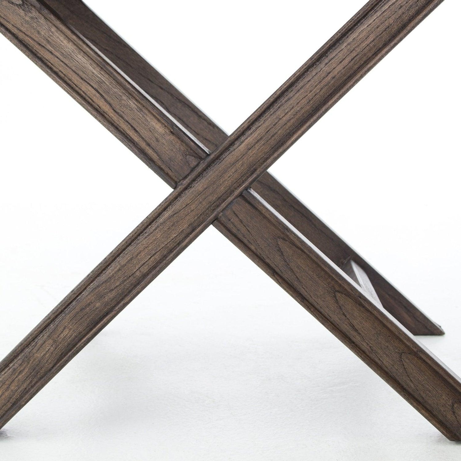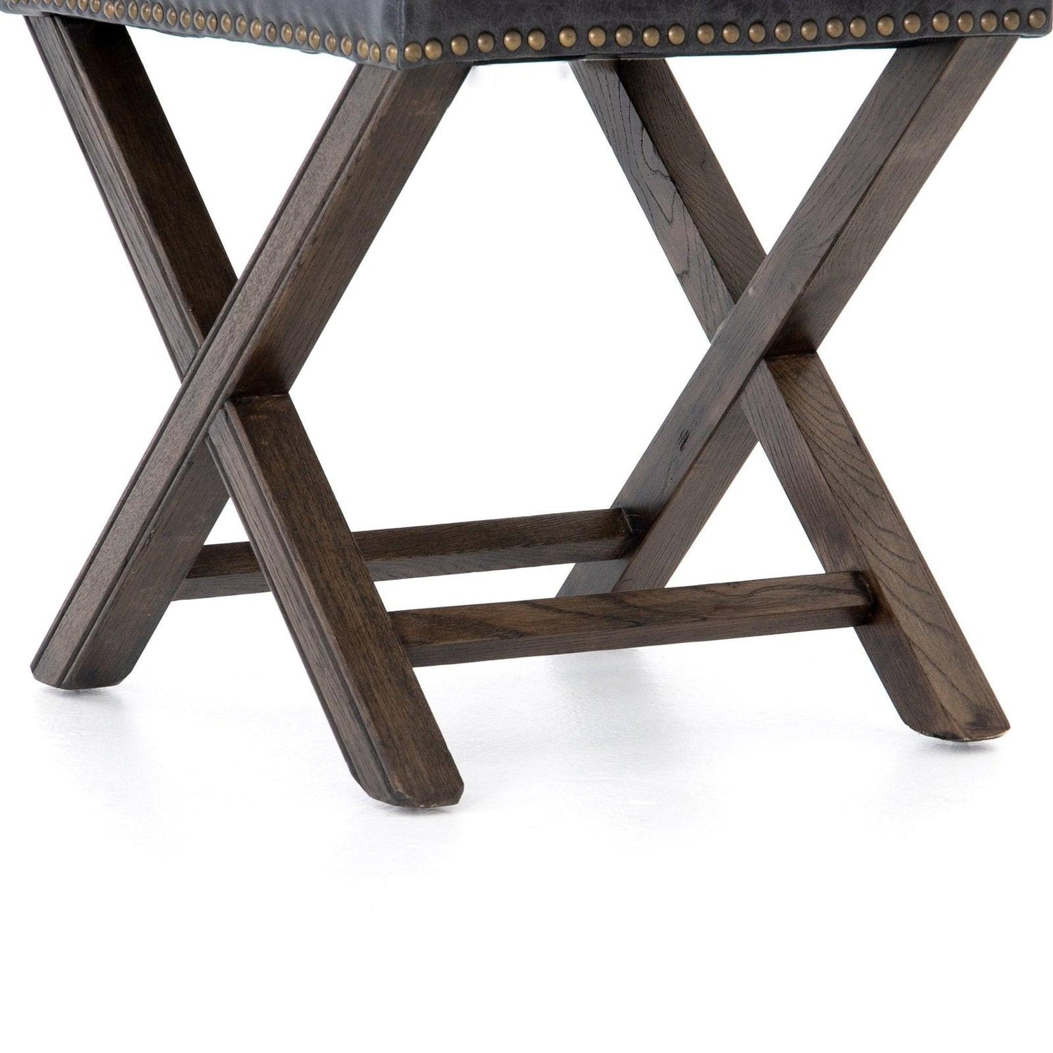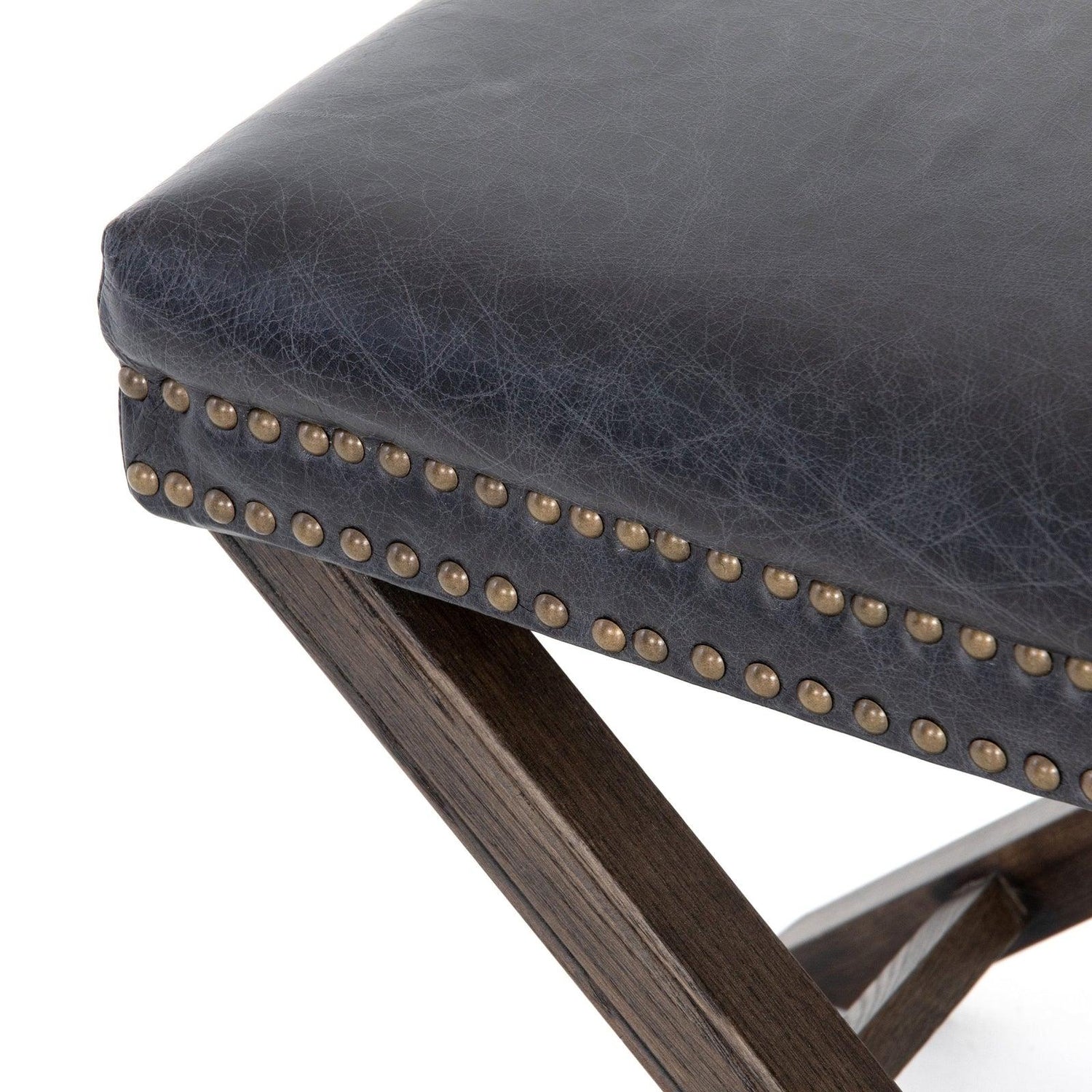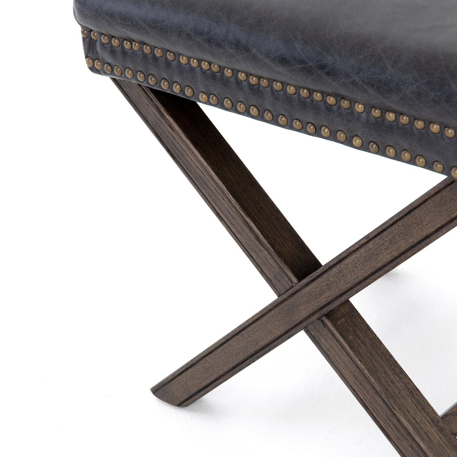 - La base de roble con estructura en forma de X está rematada con un tapizado índigo suave, acentuado por una doble fila de cabezas de clavos con acabado de latón.