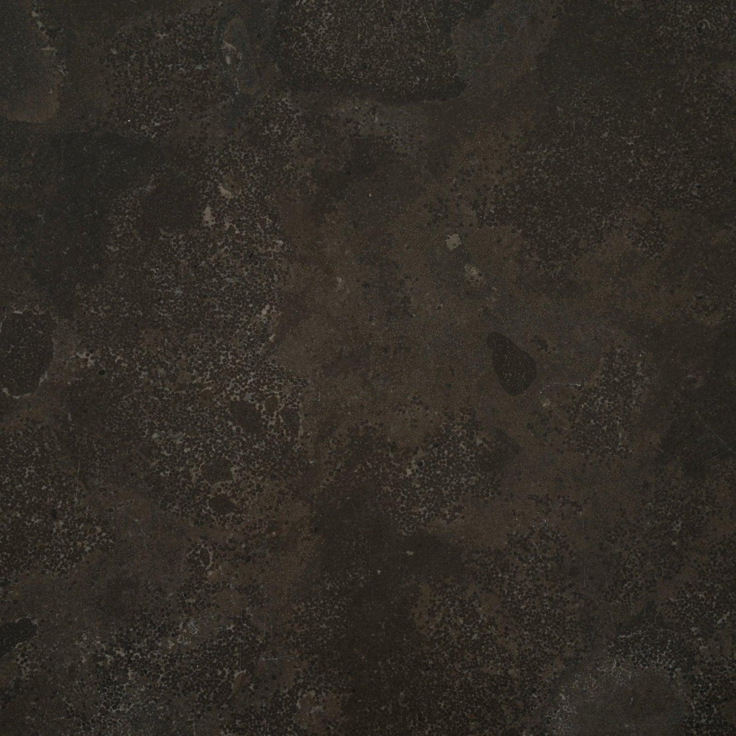 - Una base Parsons con acabado en bronce y bordes dimensionales frotados a mano sostiene dos losas de roble marrón inglés y piedra azul toscamente talladas que parecen encontradas y perfectamente colocadas.