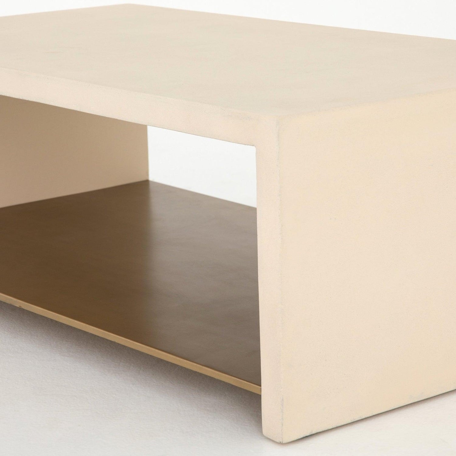 • Un estante de acero con acabado de latón antiguo parece flotar entre un marco de hormigón minimalista en blanco pergamino.