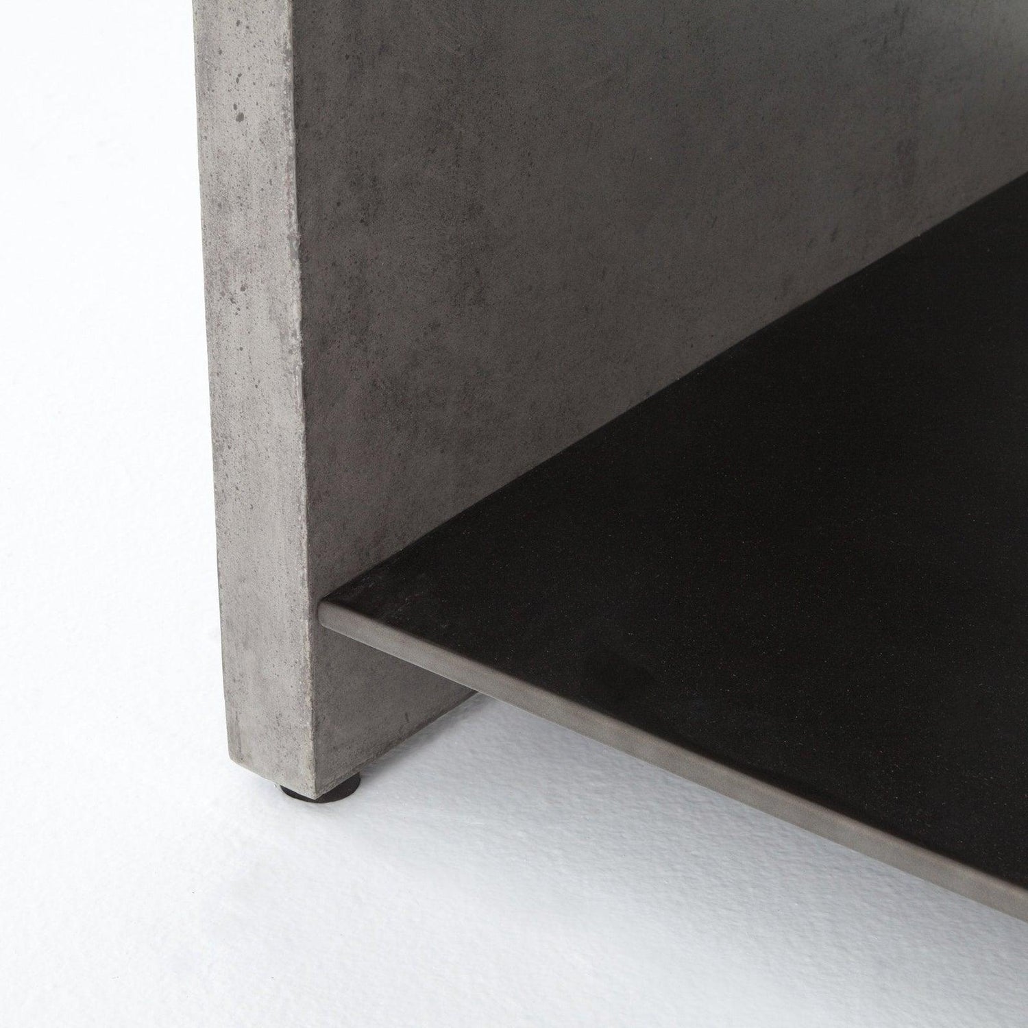 • Un estante de metal negro parece flotar entre un marco de hormigón minimalista en gris oscuro, para una apariencia elegante de inspiración industrial.
