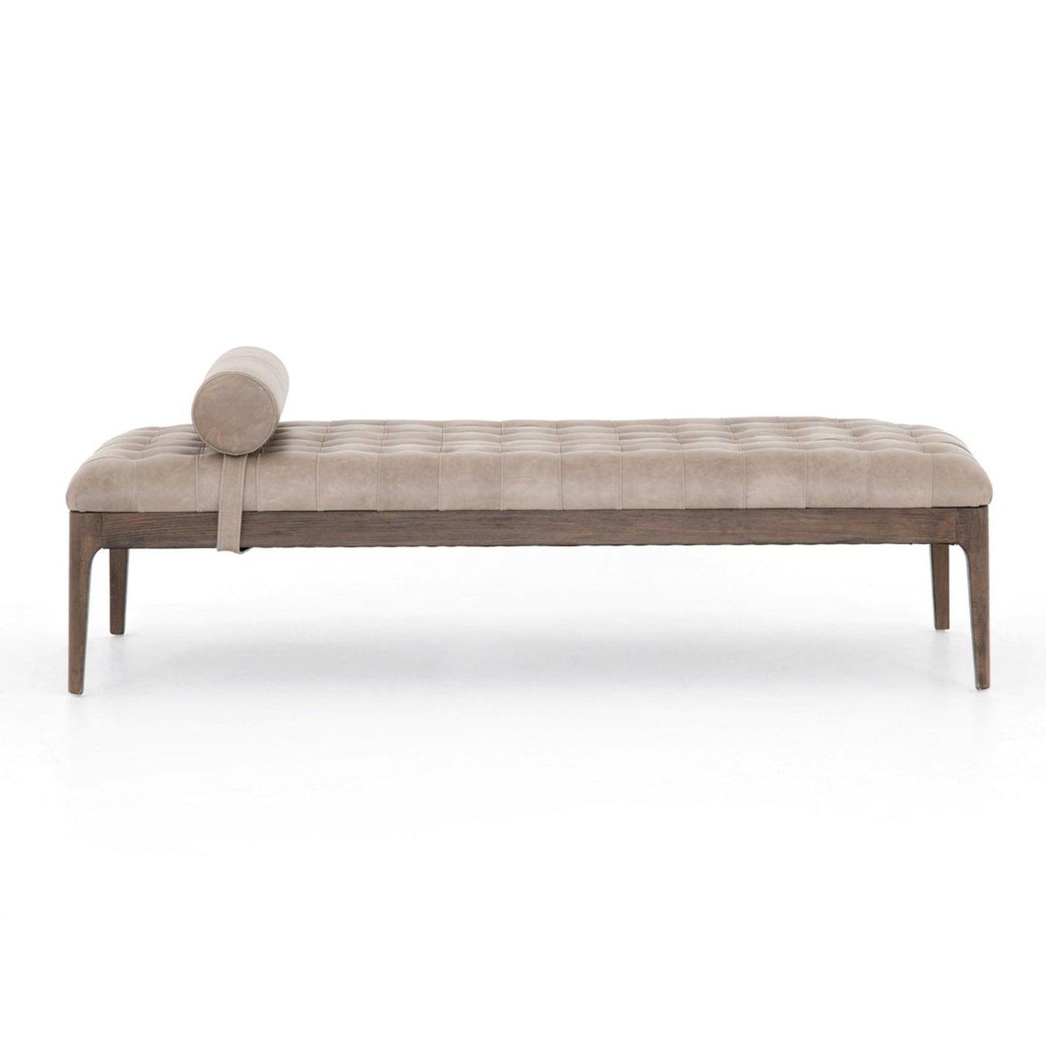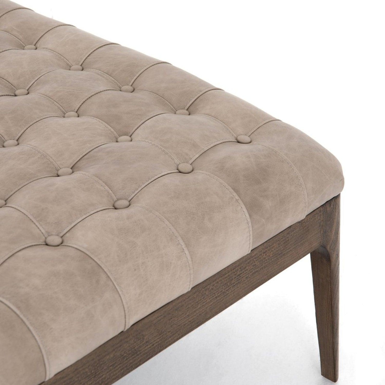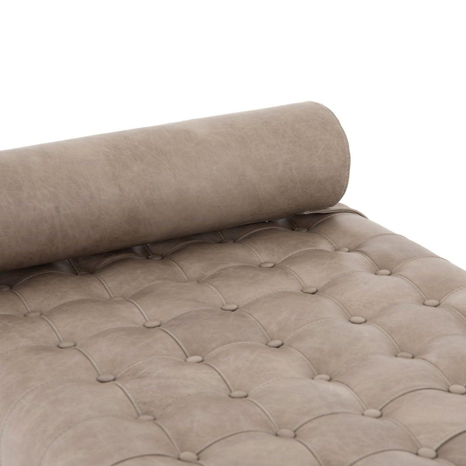 - Con un capitoné profundo y dramático y una almohada auxiliar removible, el cuero de grano superior de color topo ofrece un lugar lujoso para sentarse, en una entrada o al pie de una cama.