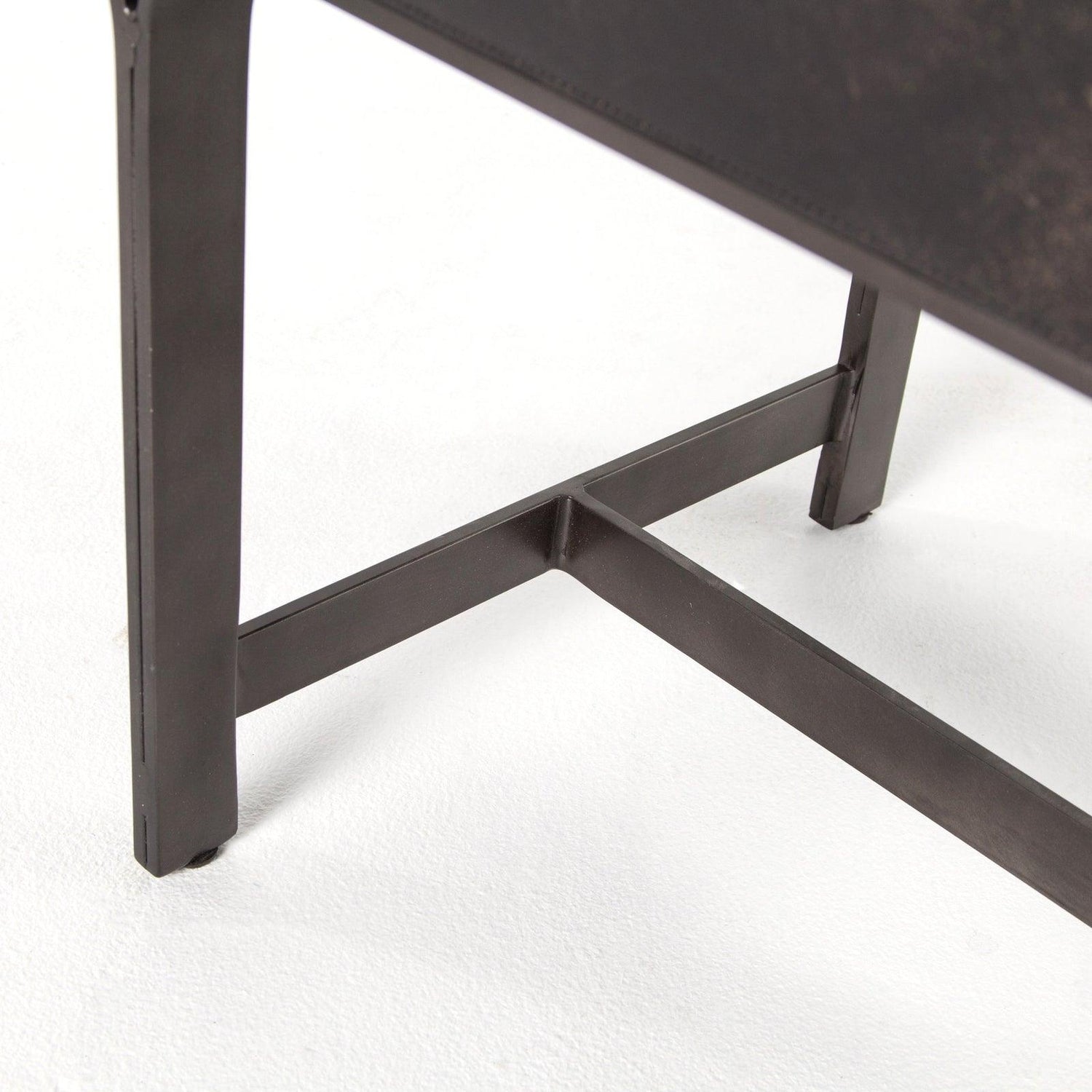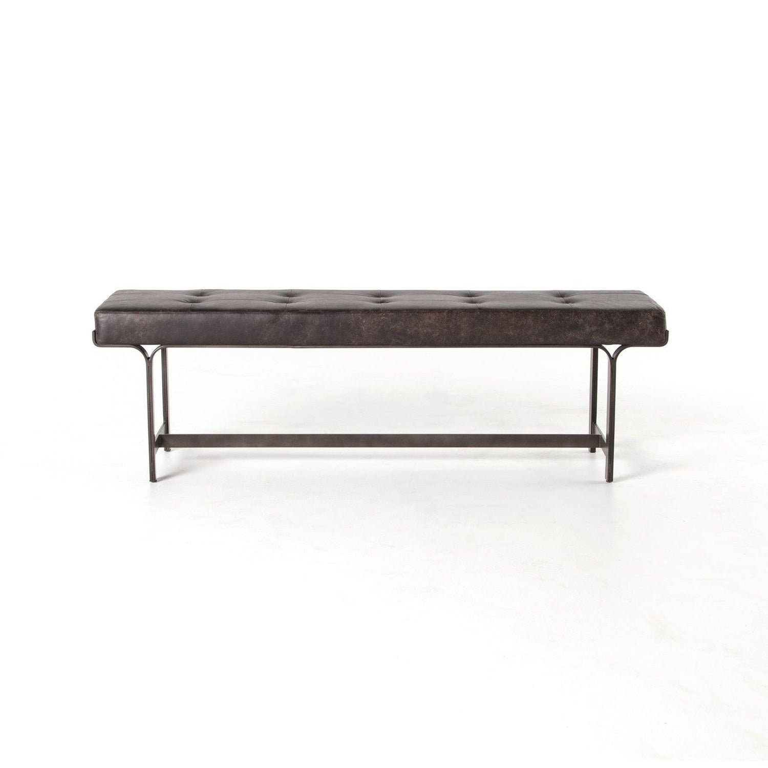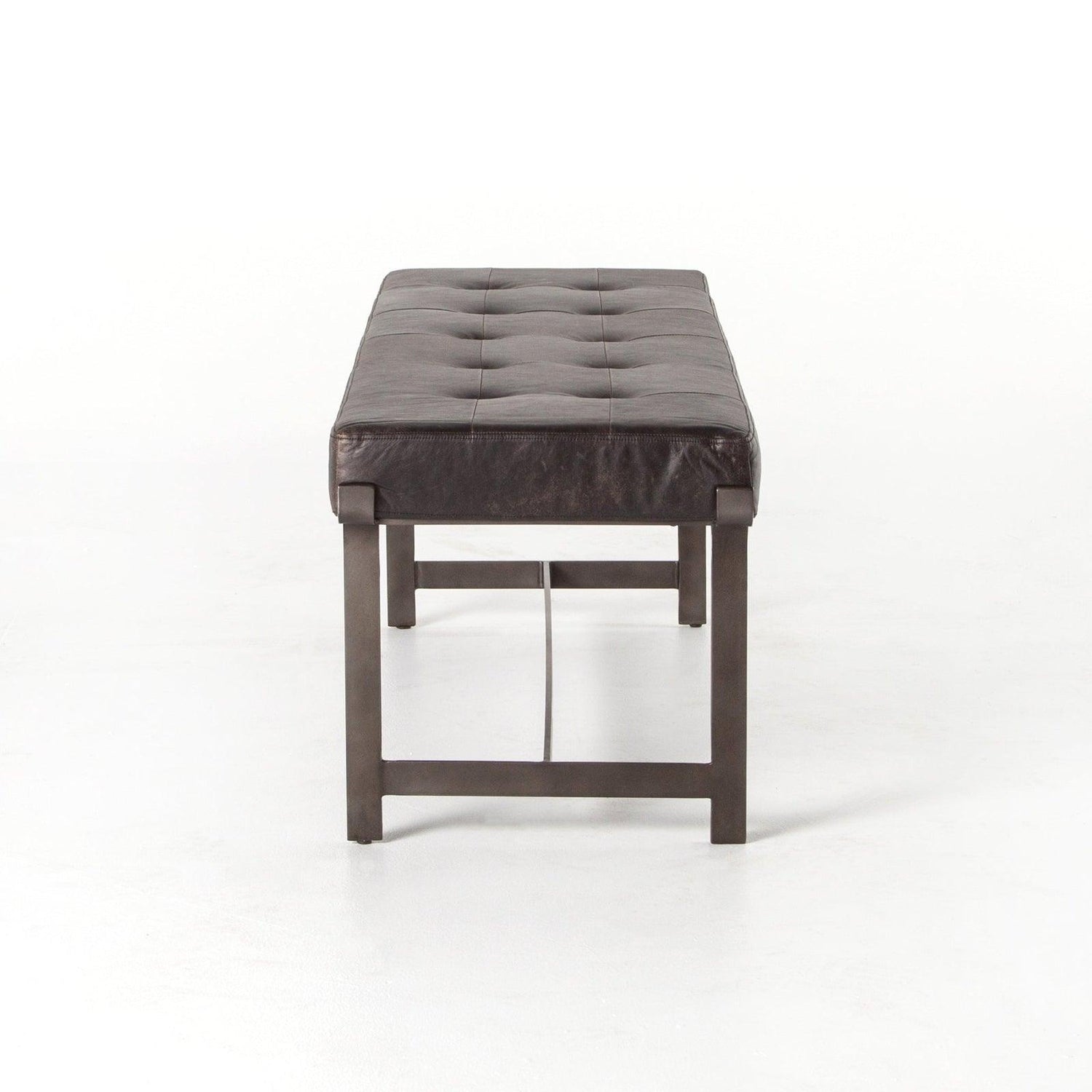 - Este majestuoso banco está cubierto de suave cuero encerado de ébano con capitoné tradicional y sostenido por una sencilla base de hierro.