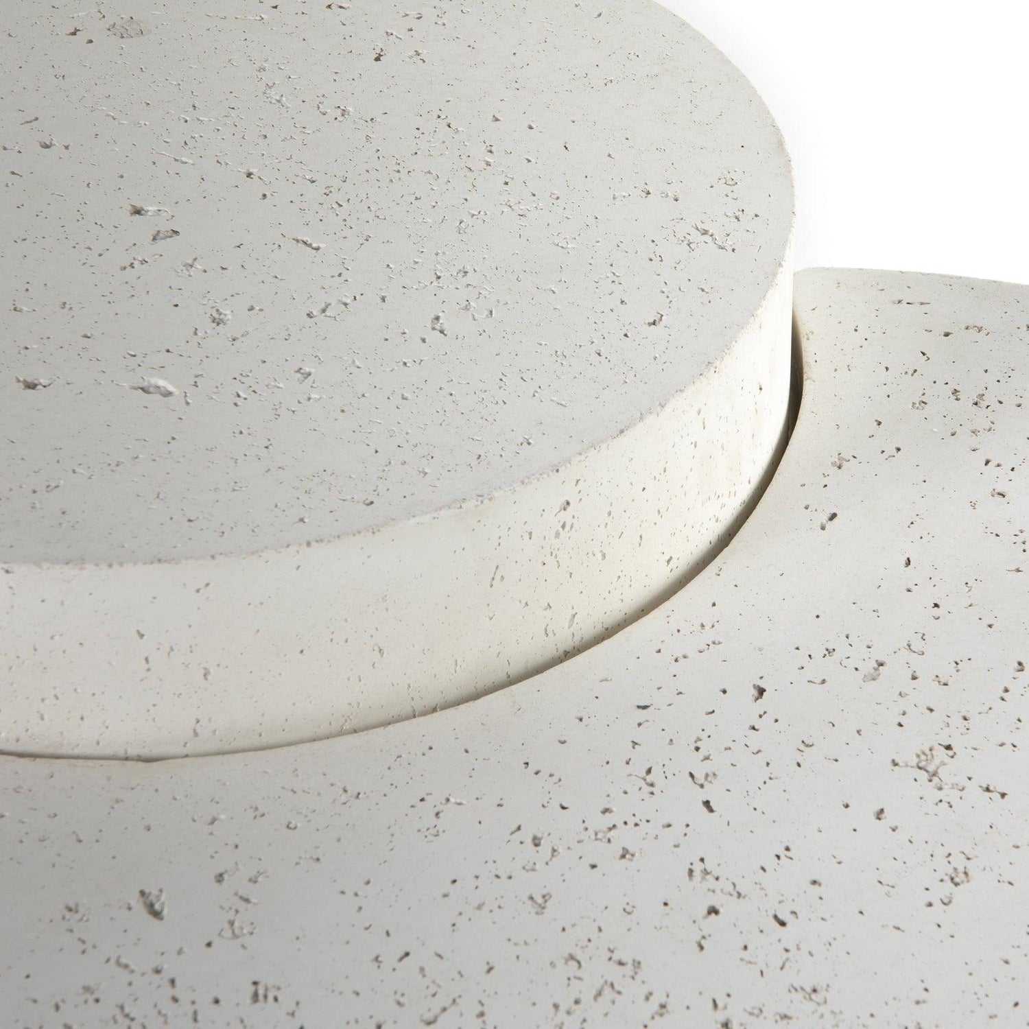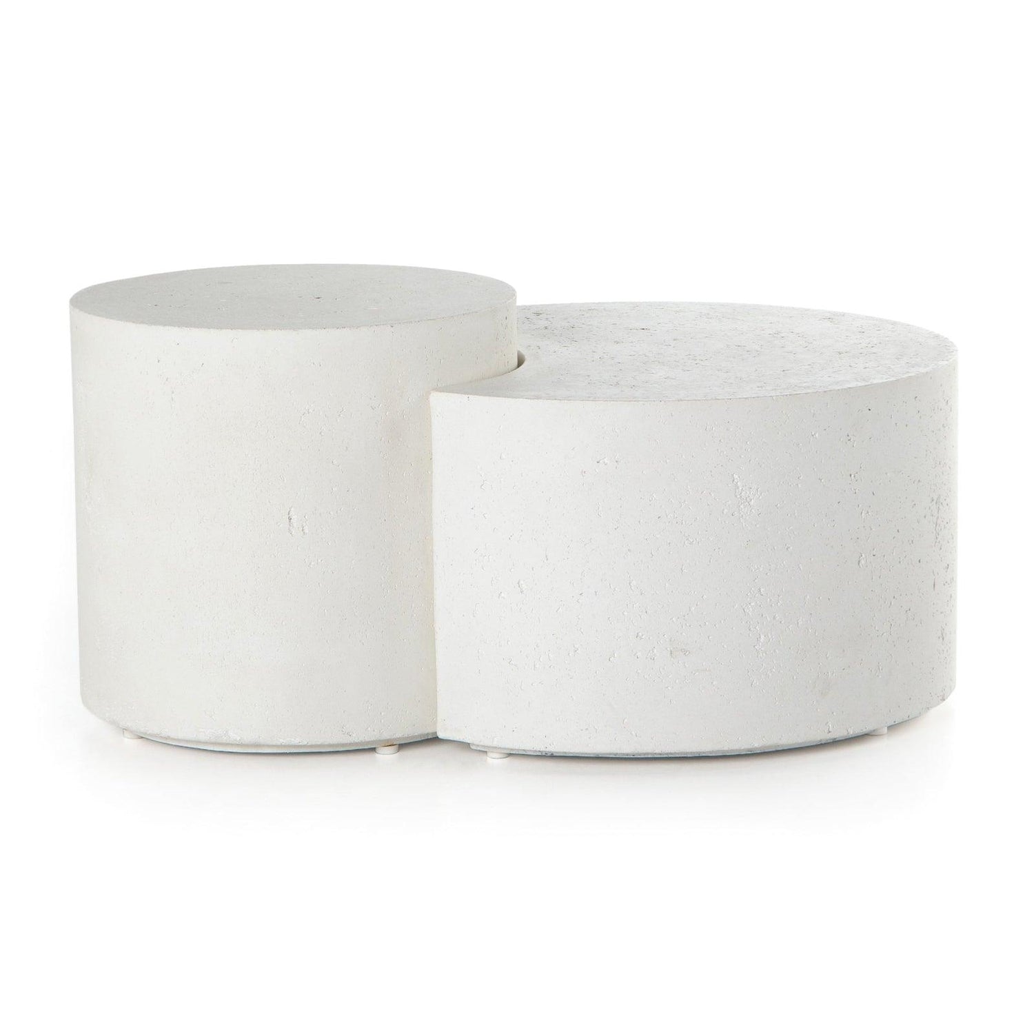 - Fabricada en hormigón con acabado blanco con picaduras profundas y texturizadas inspiradas en la decoración de coral de mediados de siglo, una mesa de café nido presenta dos niveles para una apariencia en capas con modernidad.